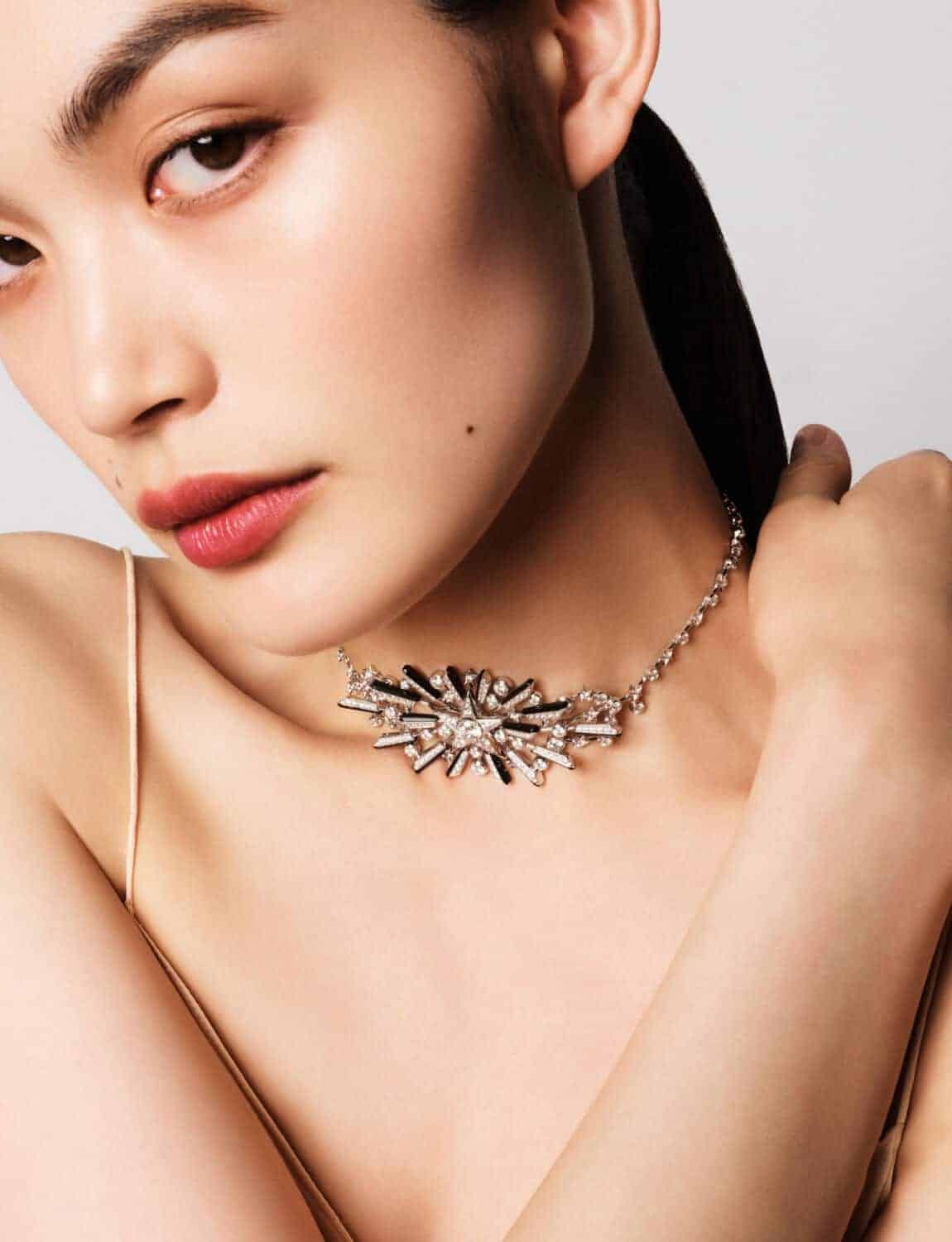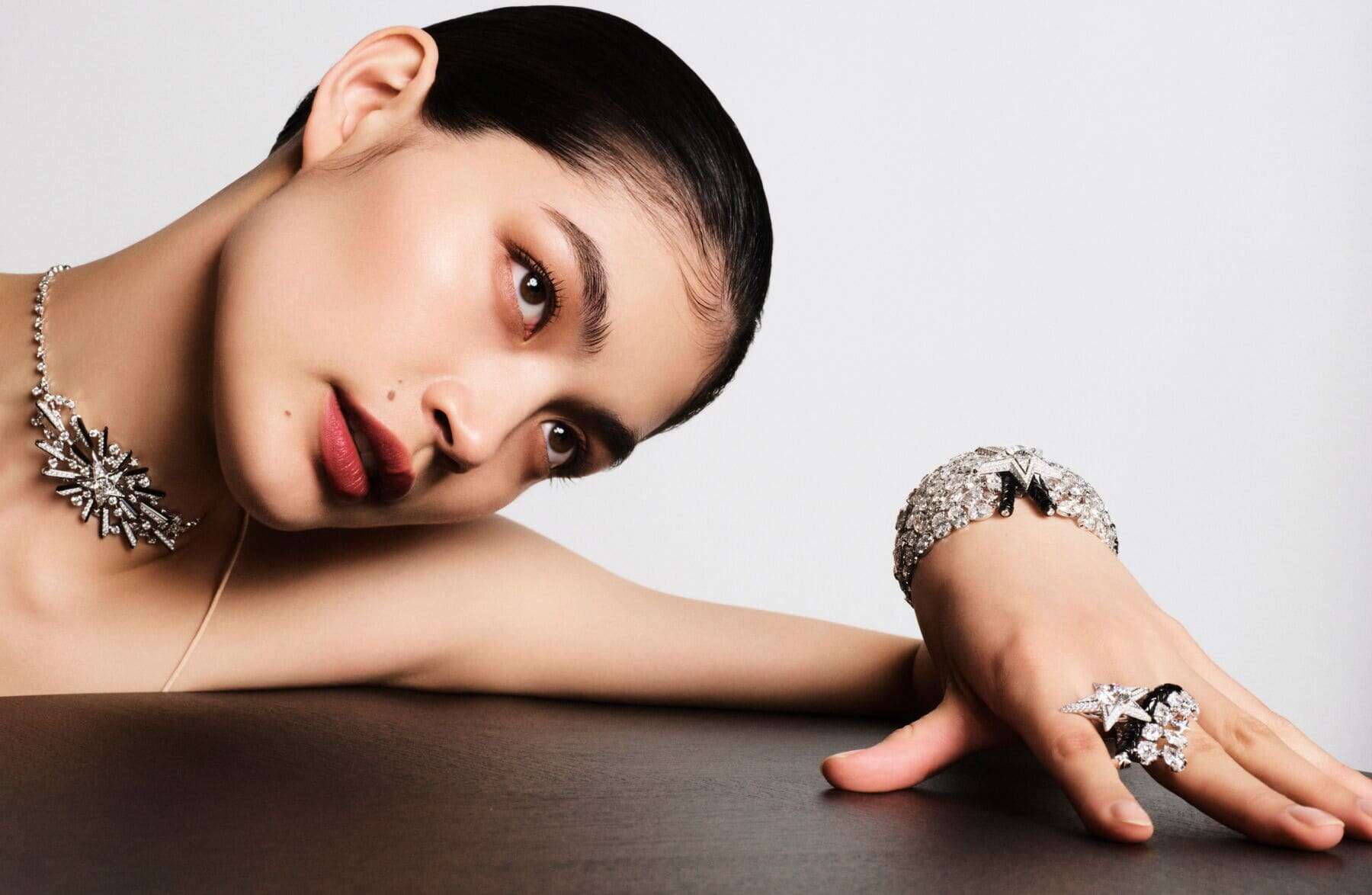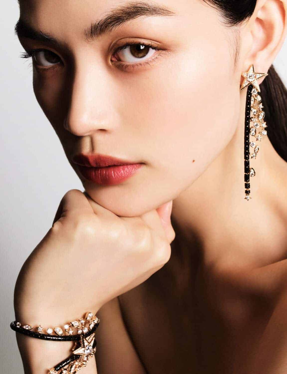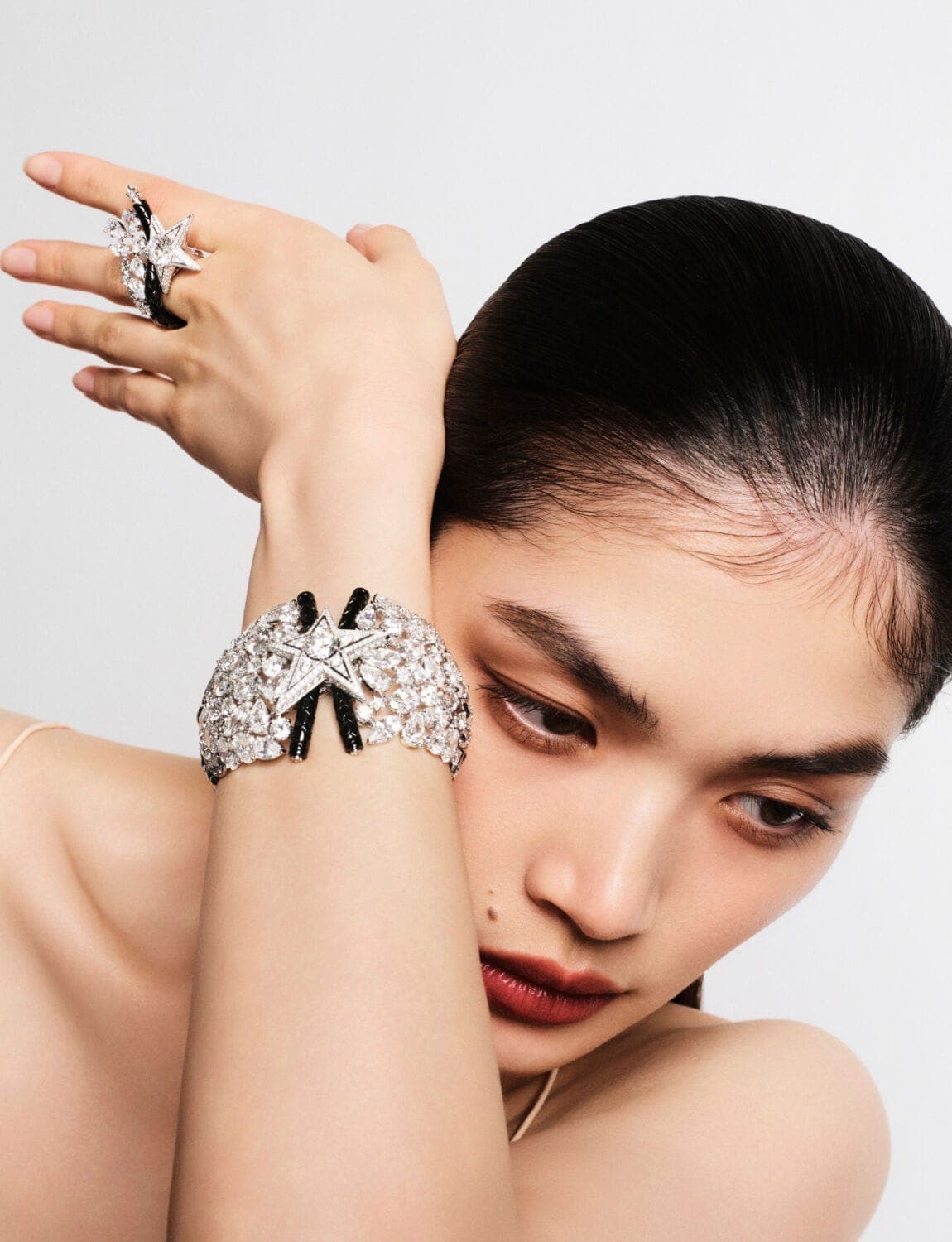 On an immense terrace hung with gorgeous rice paper lamps graphically illustrated with the collection’s key motifs – lion, wing and comet – guests watched the sun dip below Kyoto’s cityscape, joined by celebrities such as Australian-Taiwanese actress Hannah Quinlivan and Japanese actress Nana Komatsu. The latter sparkled in the collection’s Take My Breath Away suite, shimmering with a diamond-set star and coolly juxtaposing jet-black, diamond-like carbon fibre with sensual pink gold. As the sky turned dark, a spectacular drone show appeared above, shimmering over Kyoto’s lights and creating twinkling outlines of Chanel’s signature comet, star and wings, and finally the text ‘Reach for the Stars’.