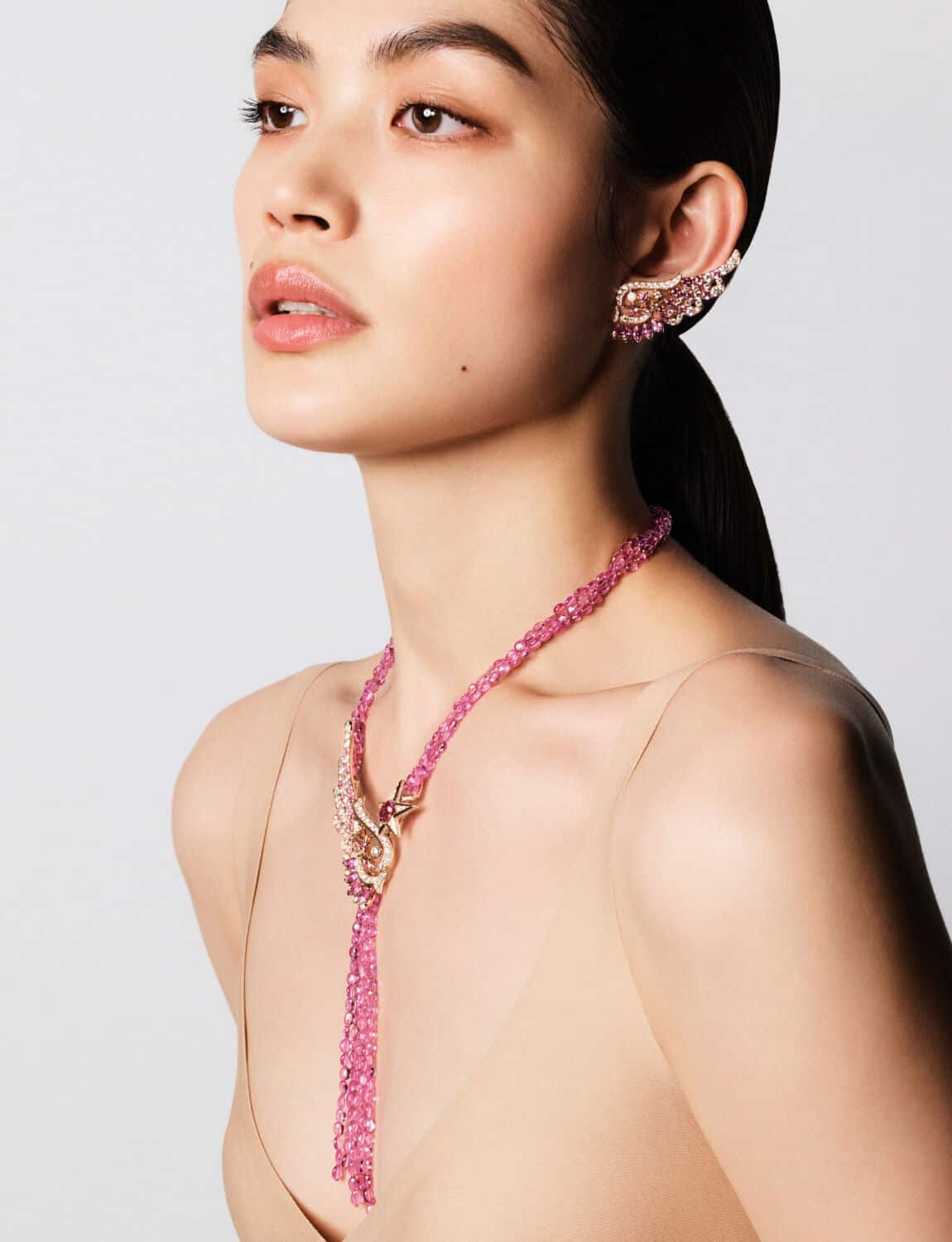 Cue the Pink Hour and Sunny Days suites, which are dressed with the wing motifs. The former features a stunning pink gold necklace cascading with pink sapphire beads, all topped with a rakish, gem-set wing set against a cool pink star with a 2.29-carat oval-cut pink sapphire in the centre. A pair of asymmetrical earrings complemented the theme, with a 4.01-carat pear- shaped pink sapphire hanging from a star. Sunny Days took on the same sundowner vibe – with wings again – in golden orange, yellow and pink hues thanks to a mix of spessartite garnets, yellow sapphires and beryl, pink spinels and rock crystal. Dusk’s golden-pink palette then transitions into a dark, twinkling night: an After Midnight suite features a wing and star necklace that dangles with a glamorous gradation of tanzanite beads.
