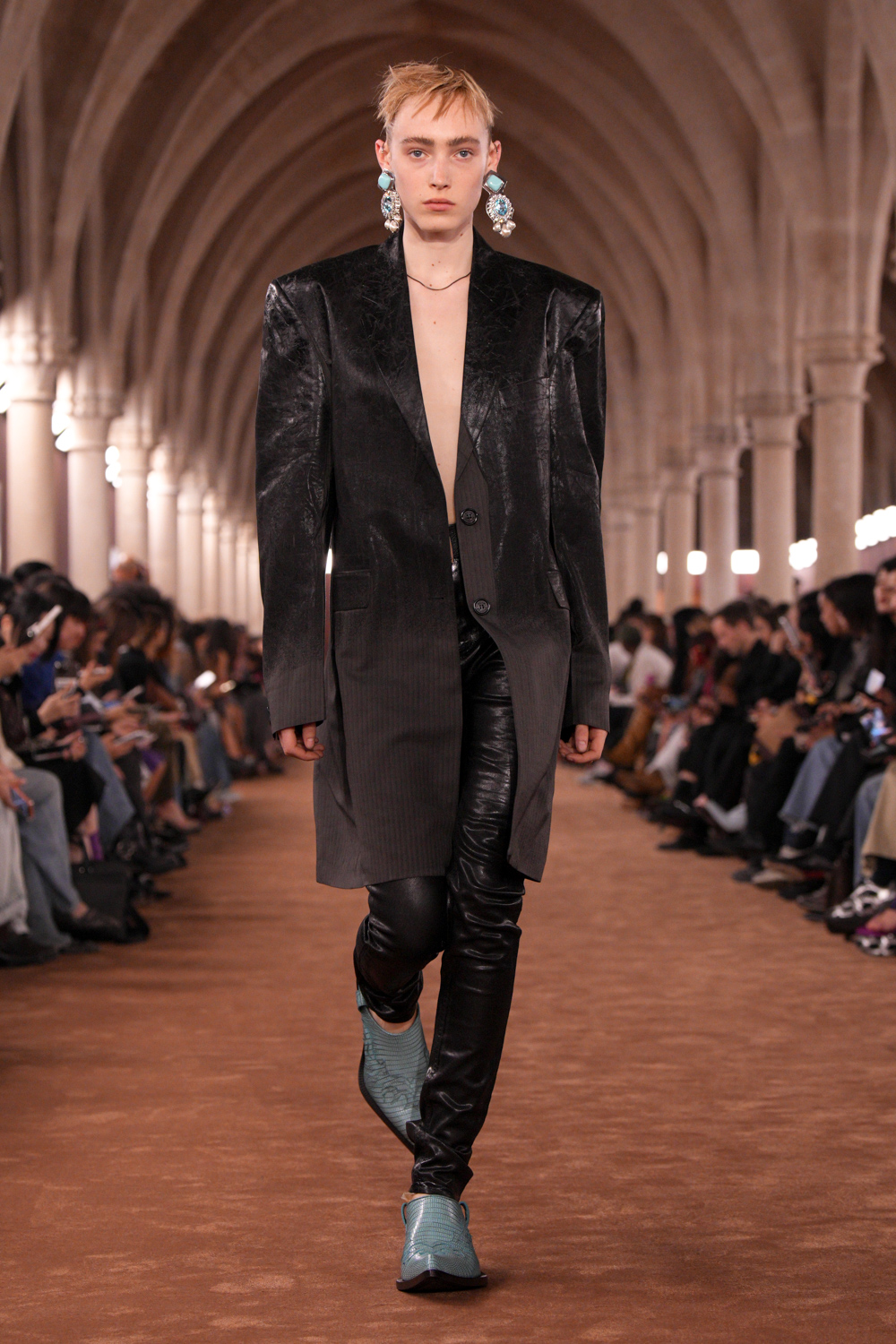 You could feel the gay panic in the air at the Acne Studios show when Robyn entered the building. The Swedish megastar has got new music on the way, some of which she previewed as part of the show’s soundtrack. The Robyn-isms didn’t stop there. You could feel the Dancing On My Own singer on the catwalk. Out models came with slicked back, boyish hair, clad in bulky leathers, glossy latex trousers and cowboy boots that crept up the leg. In the show notes, the brand spoke of design that “questions the interplay between men’s and women’s wear”, clothes that blur the lines and embrace fluidity.