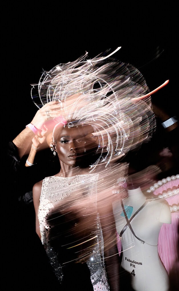 I got there around 8:00am and most of the models had already started hair and make-up. I was a little nervous to go into that infamous hair and make-up room. It’s a lot, right? There’s a lot of energy and it’s also the models’ time to gather themselves. I went in and saw Pat and Jawara. I kissed the rings. Then I got to see a lot of the models and connect, talk and laugh with them. We had to get people to press. And we had to get people to finish hair and make-up, which meant we only had time for one dress rehearsal – we were supposed to do two. This was the first time we saw the girls in their looks all together and not much went wrong. Originally, we had bigger hair but when we saw it at the dress rehearsal, it didn’t feel as modern and cool as we wanted. So we took the hair down a little bit.