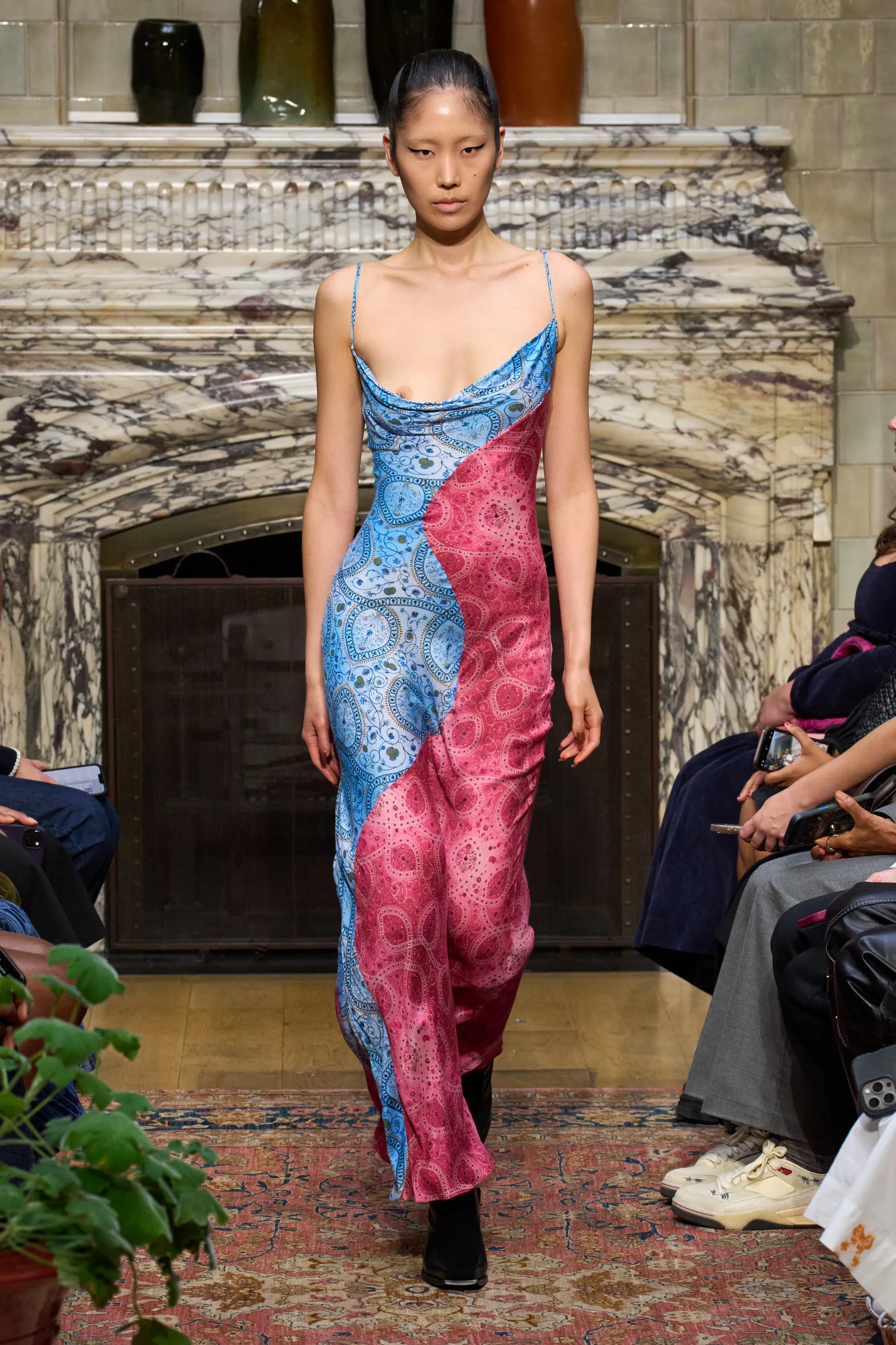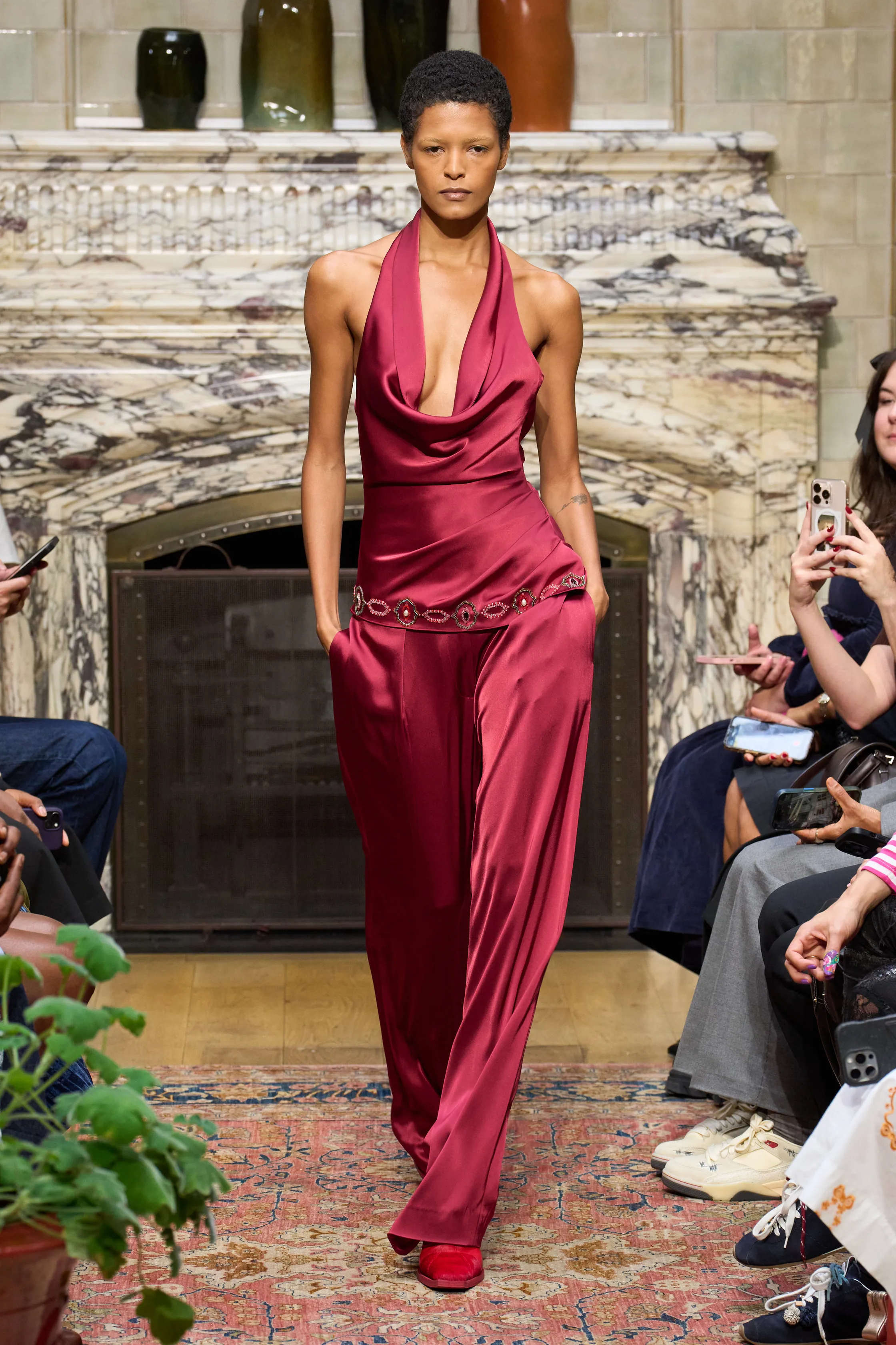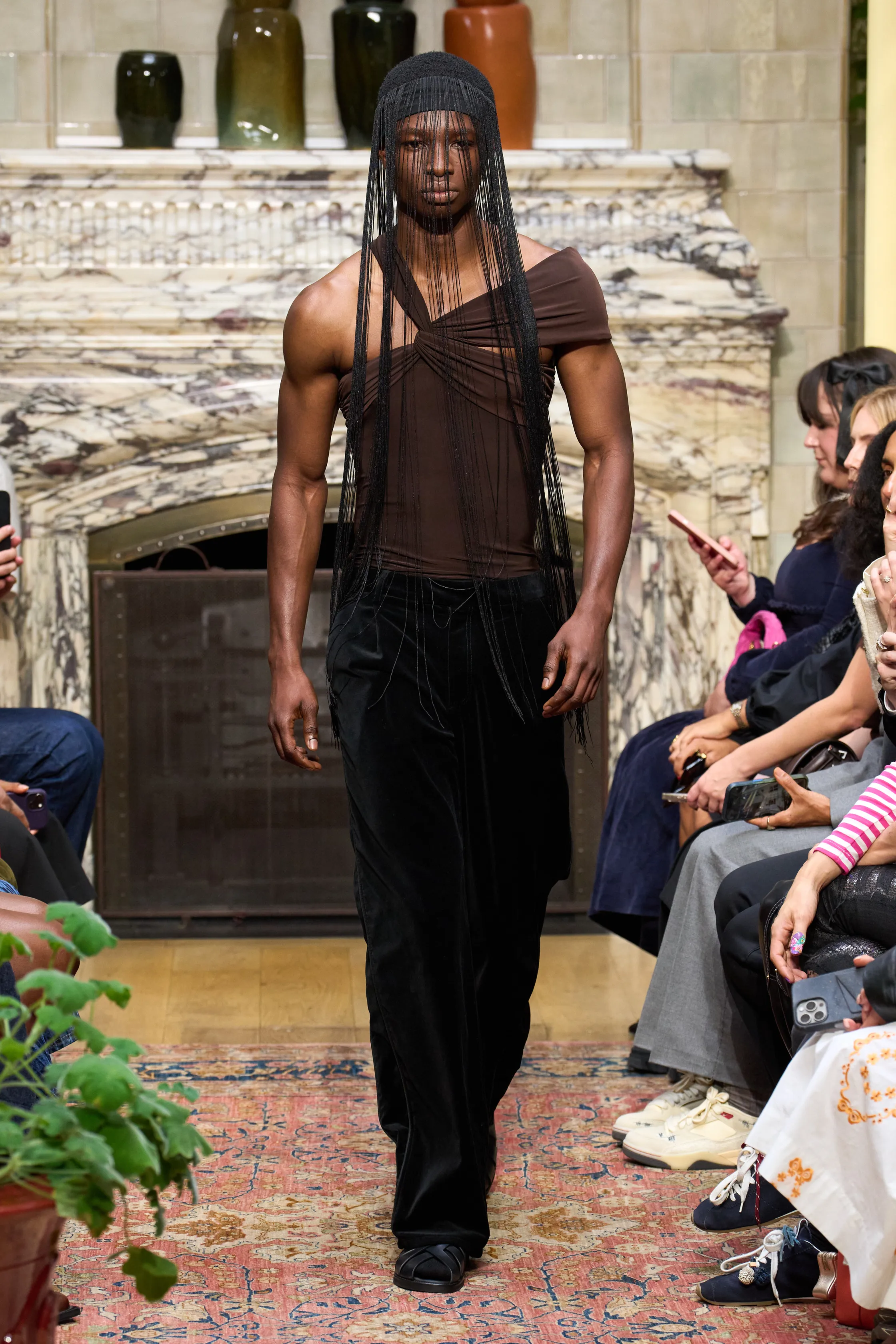 Ahluwalia has always had an excellent eye for colour and here she unveiled fringed cobalt blue tops, chocolate trench coats with matching head wraps and raspberry pink hourglass dresses which snaked elegantly around the shoulders. The designer expanded on her tailoring which included two-tone suit jackets with sharp shoulders and trousers which were fitted with sports-style panelling up the leg. She also flexed her muscles when it came to her sensual going-out dresses (which make up a large chunk of the brand’s custom business). Satin minidresses came frosted with embellishment at the hem, all in sugary pinks and pistachio greens. Expect to see them dazzling on a dance floor soon.