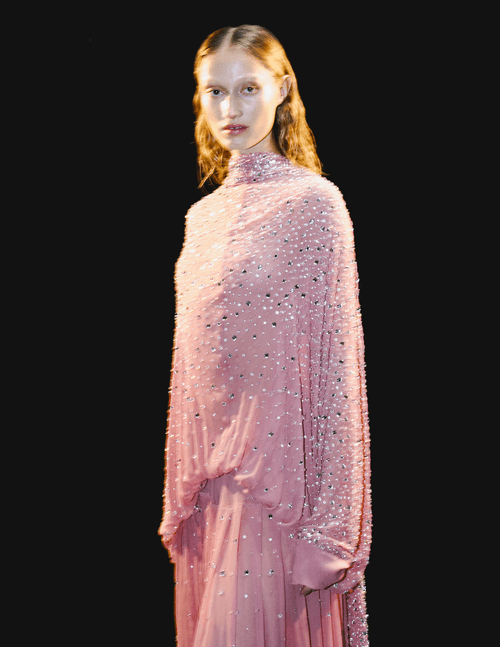 As we waited, the sinister strings of Tchaikovsky’s Swan Lake’s Op. 20 played before transitioning into Johann Strauss II’s sweet English waltz The Blue Danube, madly interrupted by the hectic, ominous techno of Boddika and Joy Orbison’s Mercy. Here came the rebels. The entire collection was based on past collections, reinvented and remixed in new ways with colour dying, decorated and deconstructing. The emphasis was on up cycling and sustainability, and “bringing new life to what is old”. Silk dresses were re-cut, shirts were subtly tie-dyed, pearls and rhinestones were embellished onto skirts and flowy, sheer shirts, speckled denim was dip dyed in an acid wash, and leather jackets were spray painted. This was history rewritten for now. A revolt for those of us ready to revolutionise and roar.