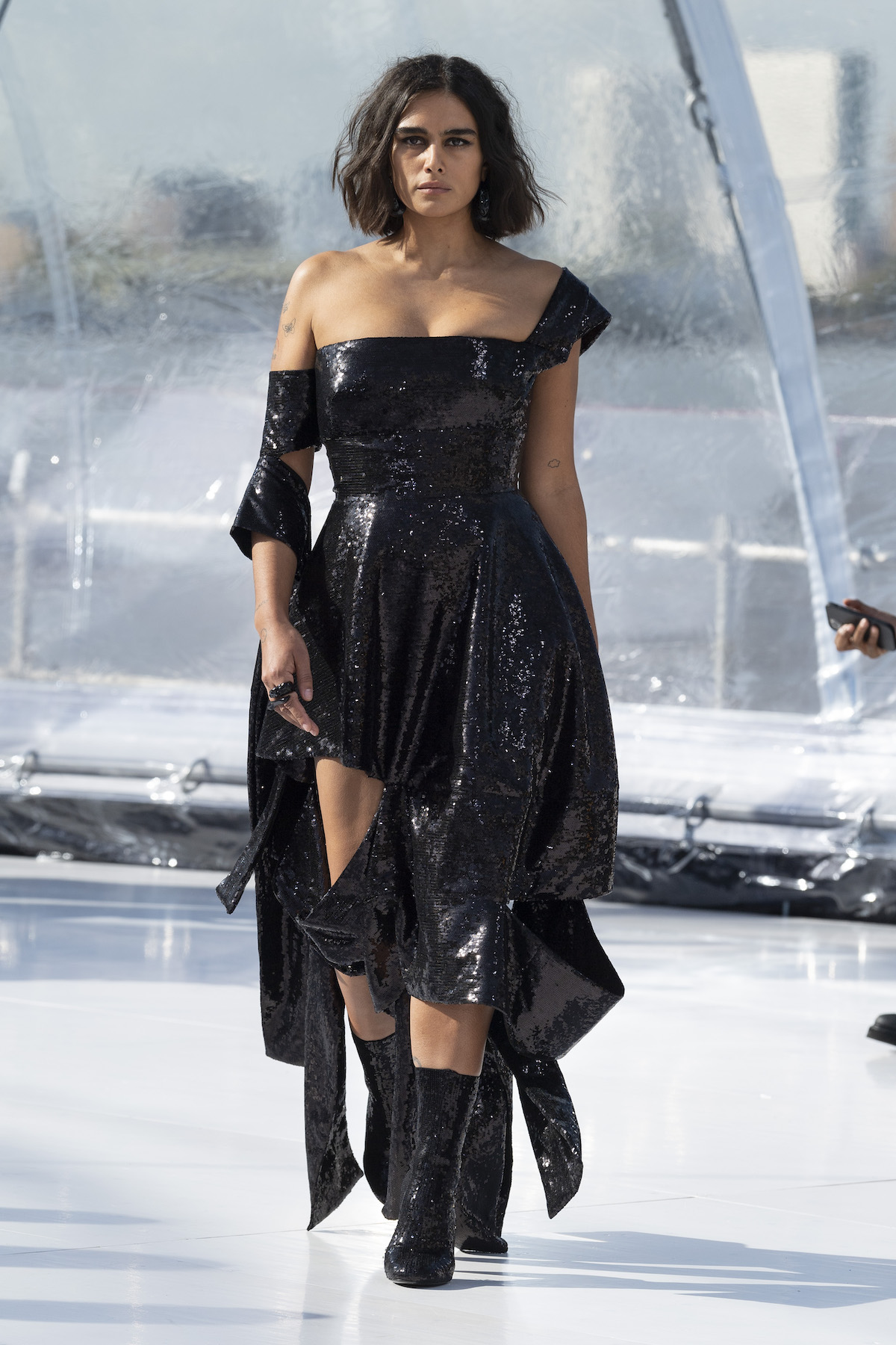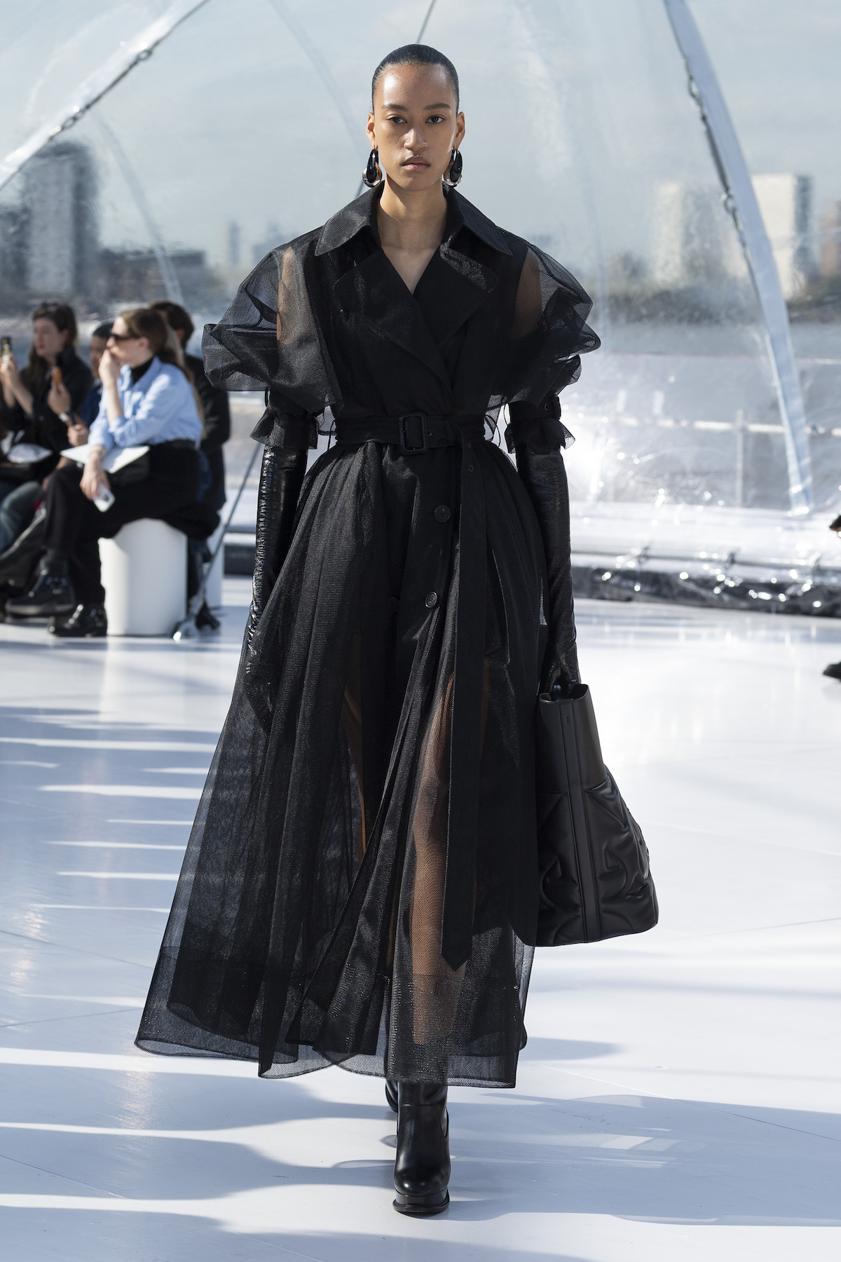 Burton was on a roll, sending out strong silhouettes in quick succession. Naomi Campbell, imperious in a cut away catsuit summed up the attitude. The designer was at the height of her own virtuoso powers when it came to the tailoring. It was razor sharp with jackets and jump suits spliced and dissected, framing and calling attention to the flesh beneath. The scissor skills of Burton and the McQueen atelier are undeniable. Elsewhere, the designer used the eye as a symbol of human uniqueness and as a register of emotion -– perhaps too, as a comment on the very modern feeling of always being watched. Iris prints were blown up almost to the point of abstraction and stared out from angular trouser suits. Along the way, Burton had looked at the work of Hieronymus Bosch, whose work teams with bodies and humanity. She used it as inspiration for embroideries which appeared on everything from gowns to boots and bodysuits. Burton talked of designing clothes to empower the wearer. She did just that with a powerhouse collection.