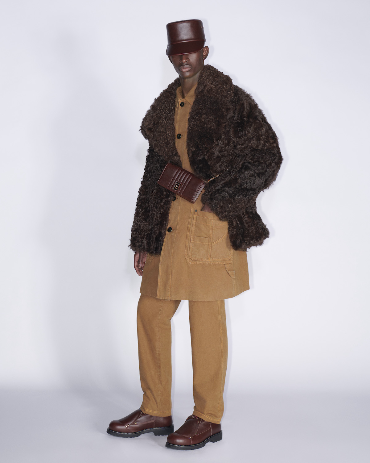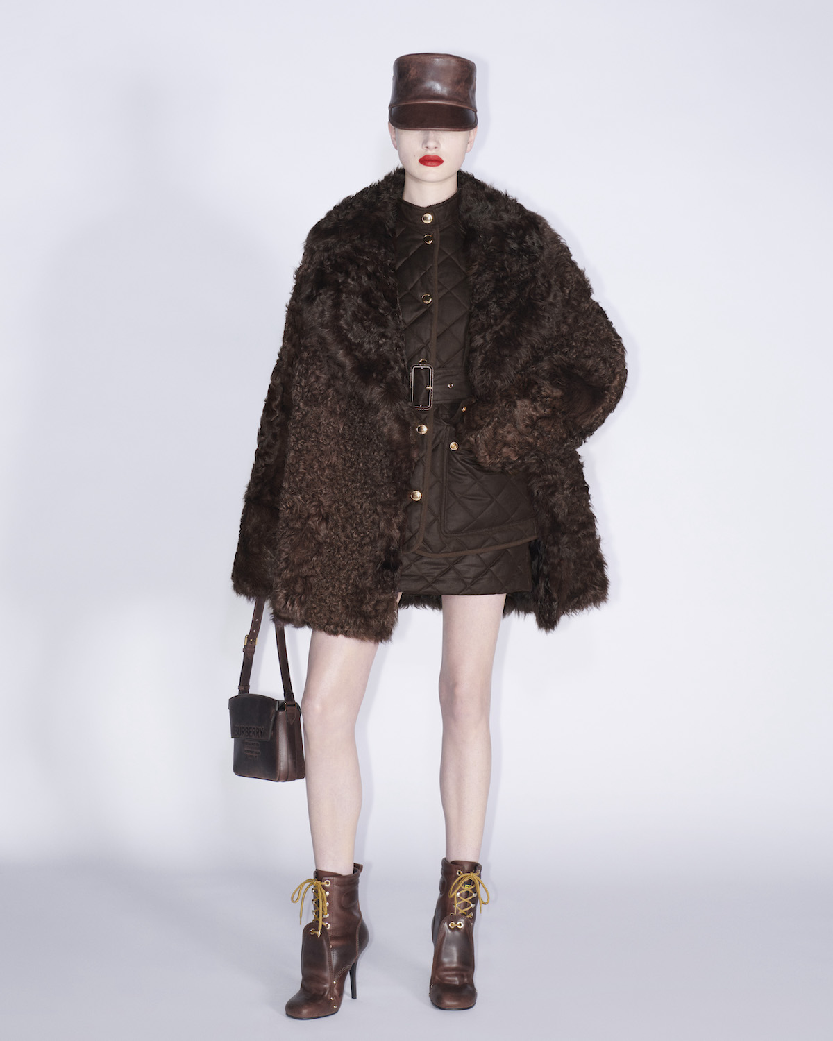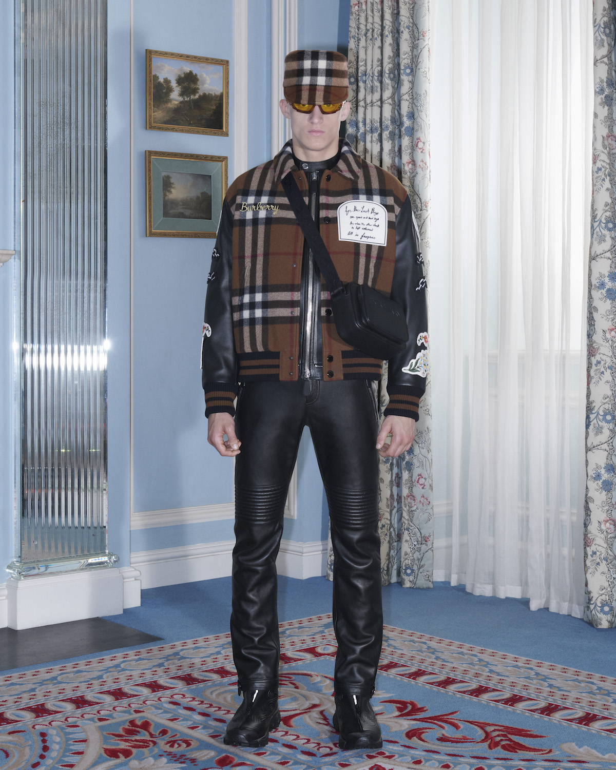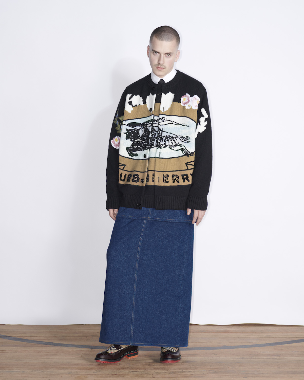 Each piece is birthed of Burberry tradition but fashioned with hedonistic sensibility. Like wax cotton jackets with hazard orange stripes and black shirt, ties and trousers cut from leather. Handsome varsity jackets and roomy jeans come spliced with the Burberry nova check print, paired alongside playful cardies stamped with cartoon farm animals and glam car coats with feminine pleats. Darting in a myriad of directions, the collection flirts with fetishism while embracing tradition, plotting a wardrobe that speaks to all strands of the Burberry clientele.