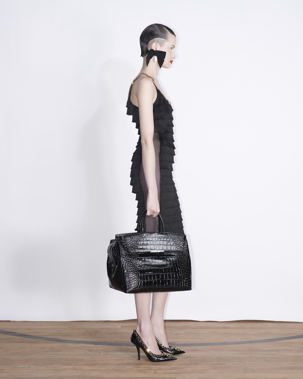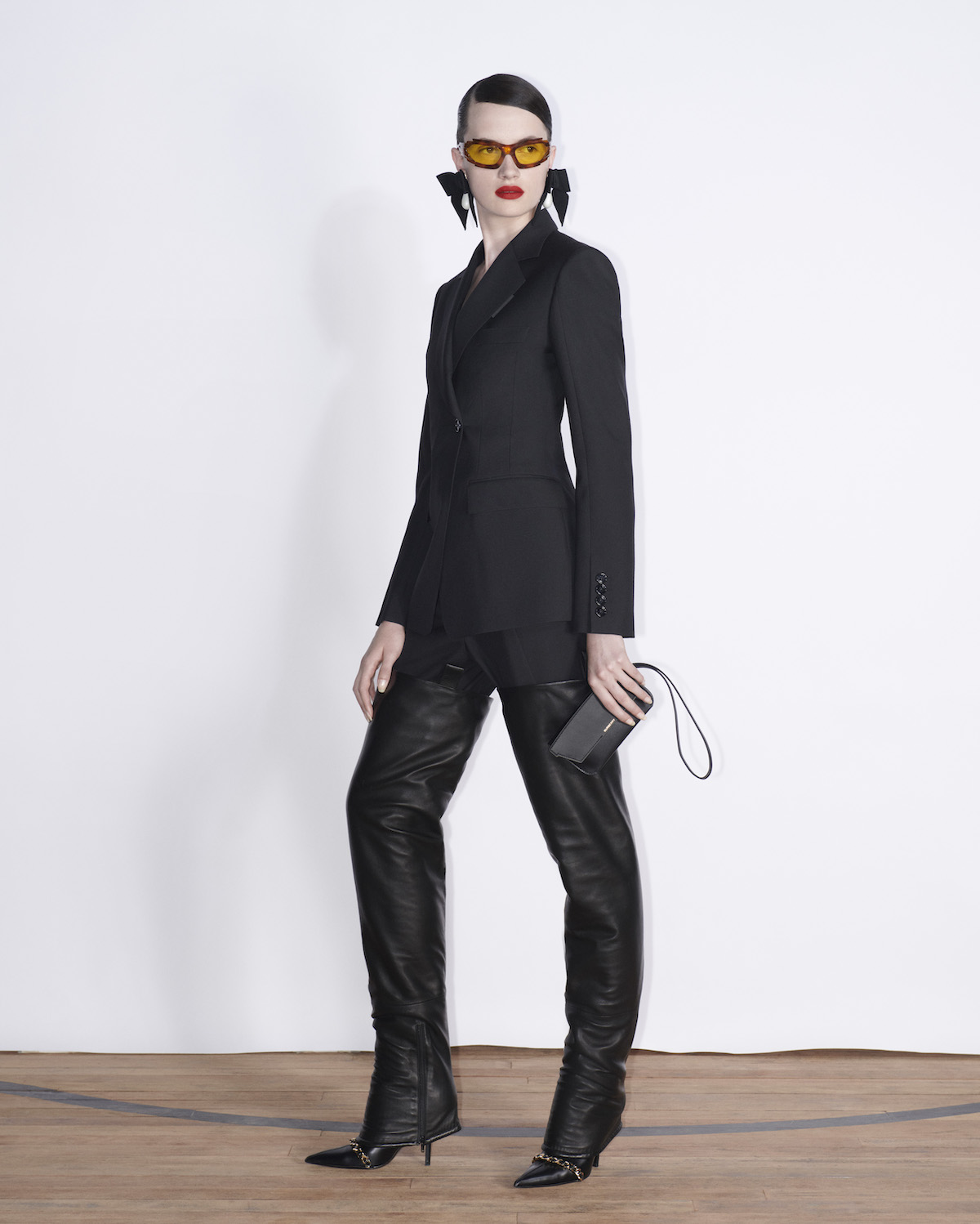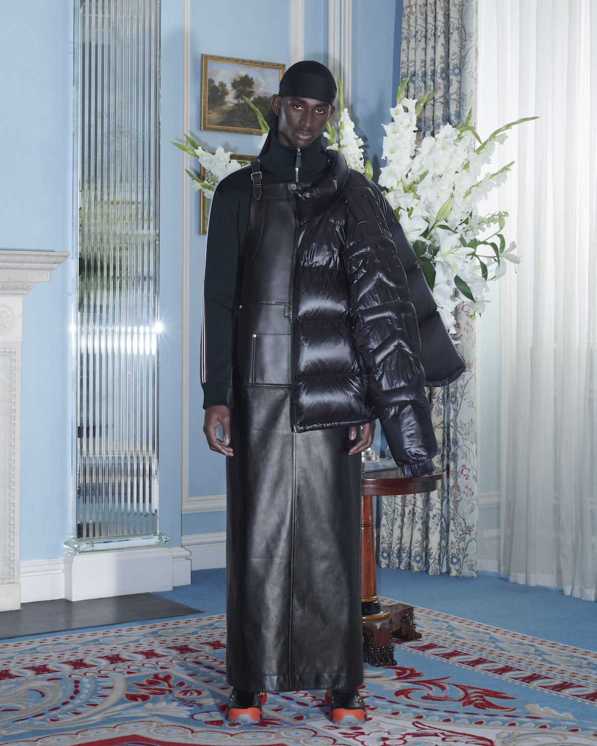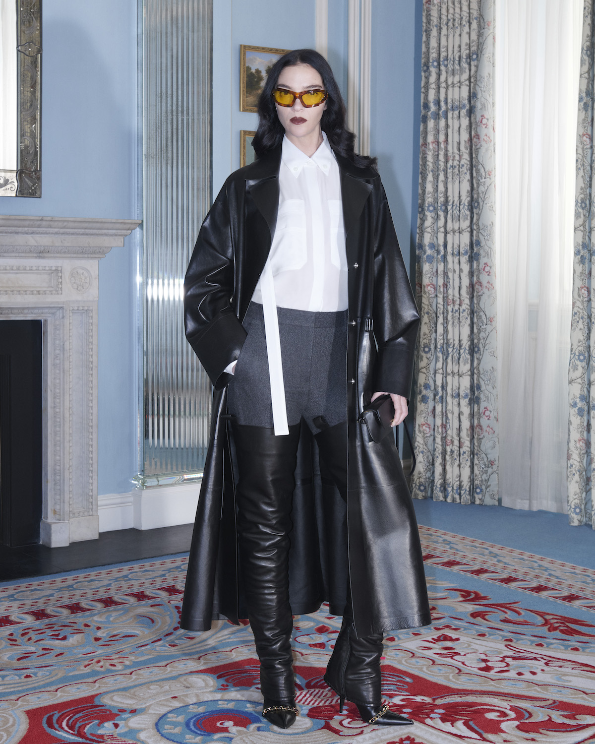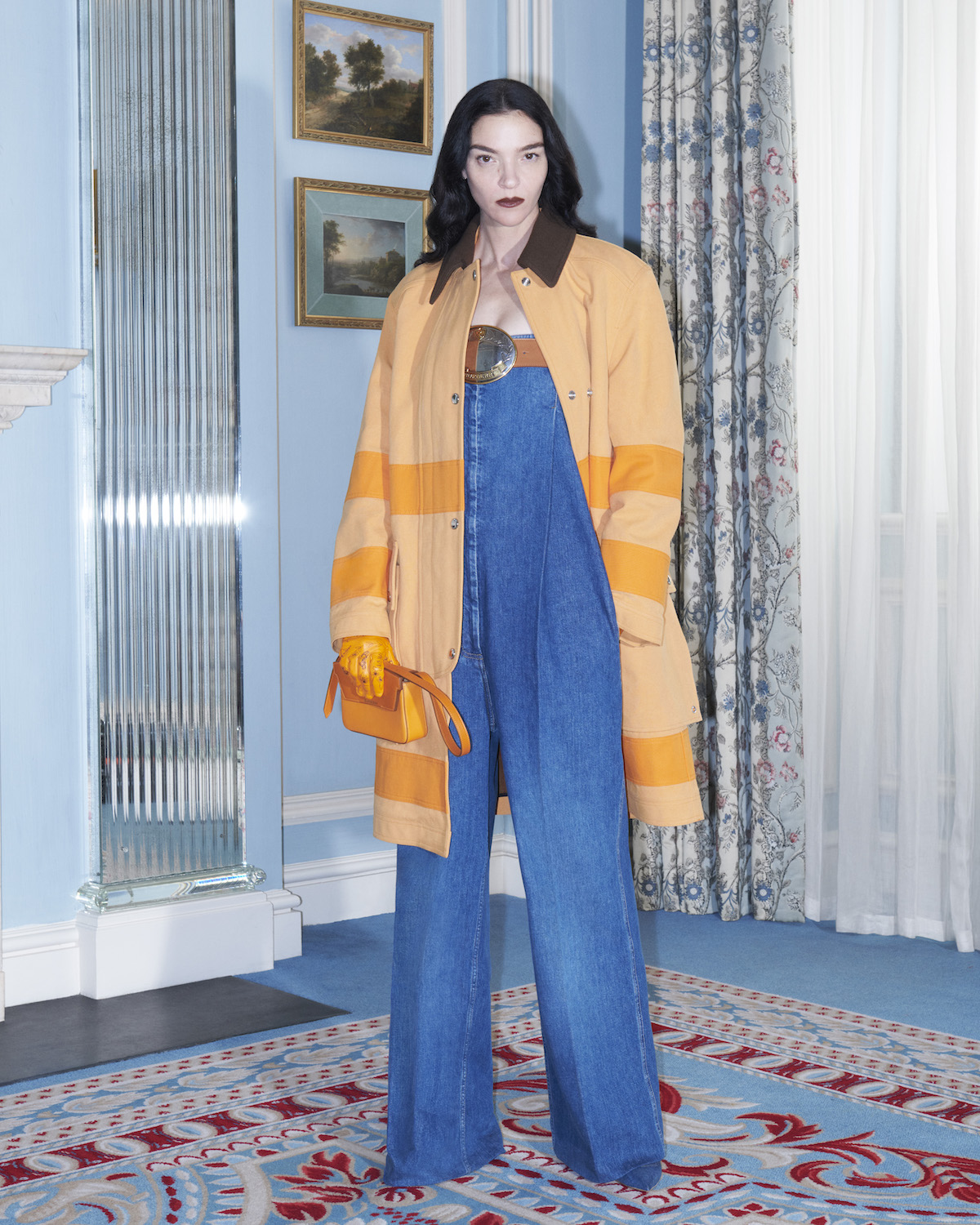Each piece is birthed of Burberry tradition but fashioned with hedonistic sensibility. Like wax cotton jackets with hazard orange stripes and black shirt, ties and trousers cut from leather. Handsome varsity jackets and roomy jeans come spliced with the Burberry nova check print, paired alongside playful cardies stamped with cartoon farm animals and glam car coats with feminine pleats. Darting in a myriad of directions, the collection flirts with fetishism while embracing tradition, plotting a wardrobe that speaks to all strands of the Burberry clientele.
