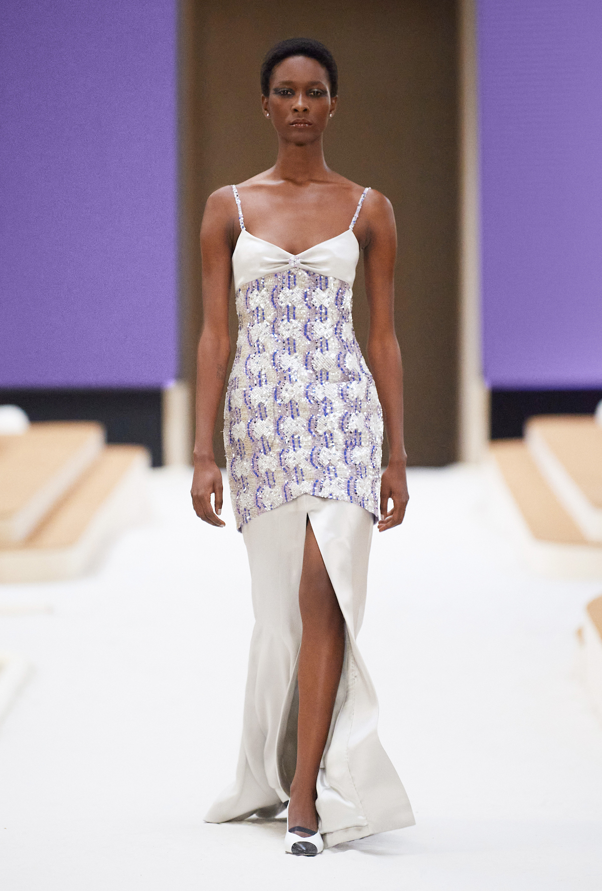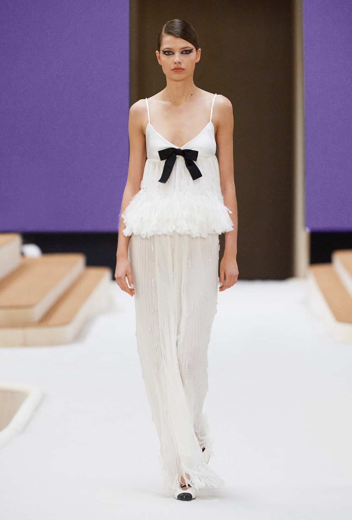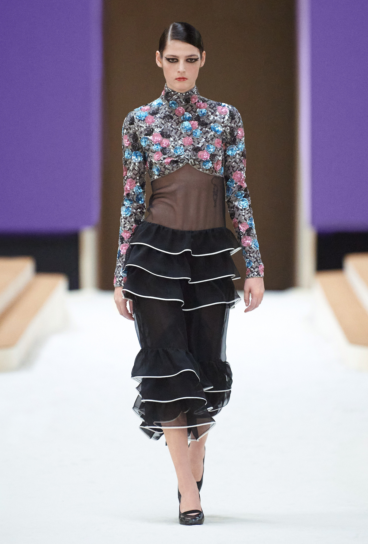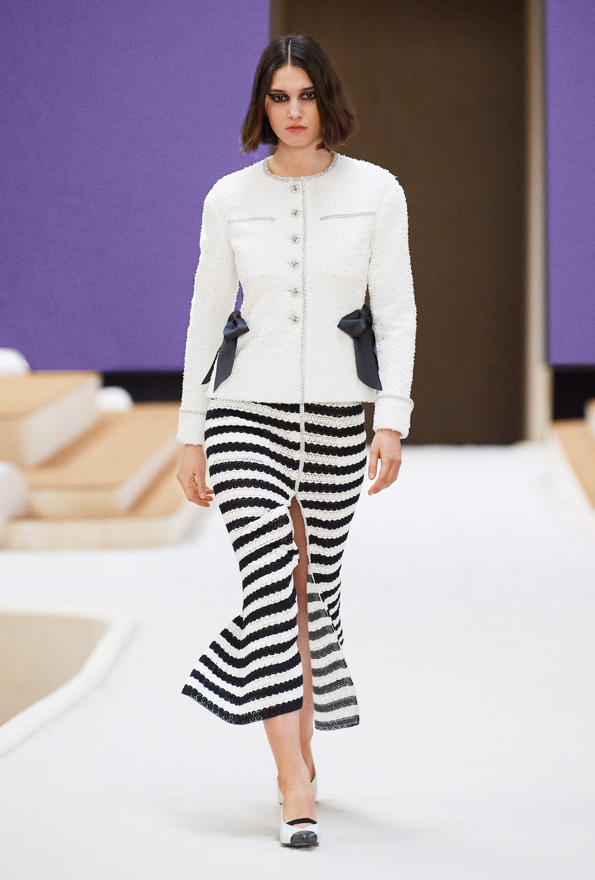 The trio formed the perfect Chanel family for this collection, set in a space where Virginie felt free: “These geometric shapes made me want contrasts, a great lightness and a lot of freshness: ethereal dresses that float as if suspended. Lots of flounces, fringes, macramé, bright lace, iridescent tweeds, colourful jewelled buttons.” ’Tis the Chanel life. The girls floated on by in tweed suits pretty in pinks and deep blues, soft tiered skirts and floor-length dresses gently levitated, and subtle fringing fluttered. All of the Chanel embroidery partners were on board for this collection, with special note made of “the dress entirely embroidered by Lesage with constructivist camellias in black, white and coral beads, worn with a little black jacket," said Virginie. "These references also belong to Gabrielle Chanel, of course. It's like a conversation that crosses time.” With their Mary Janes on, eyes painted jet black by Lucia Pica and hair slick and sleek, they walked that Chanel Couture walk.