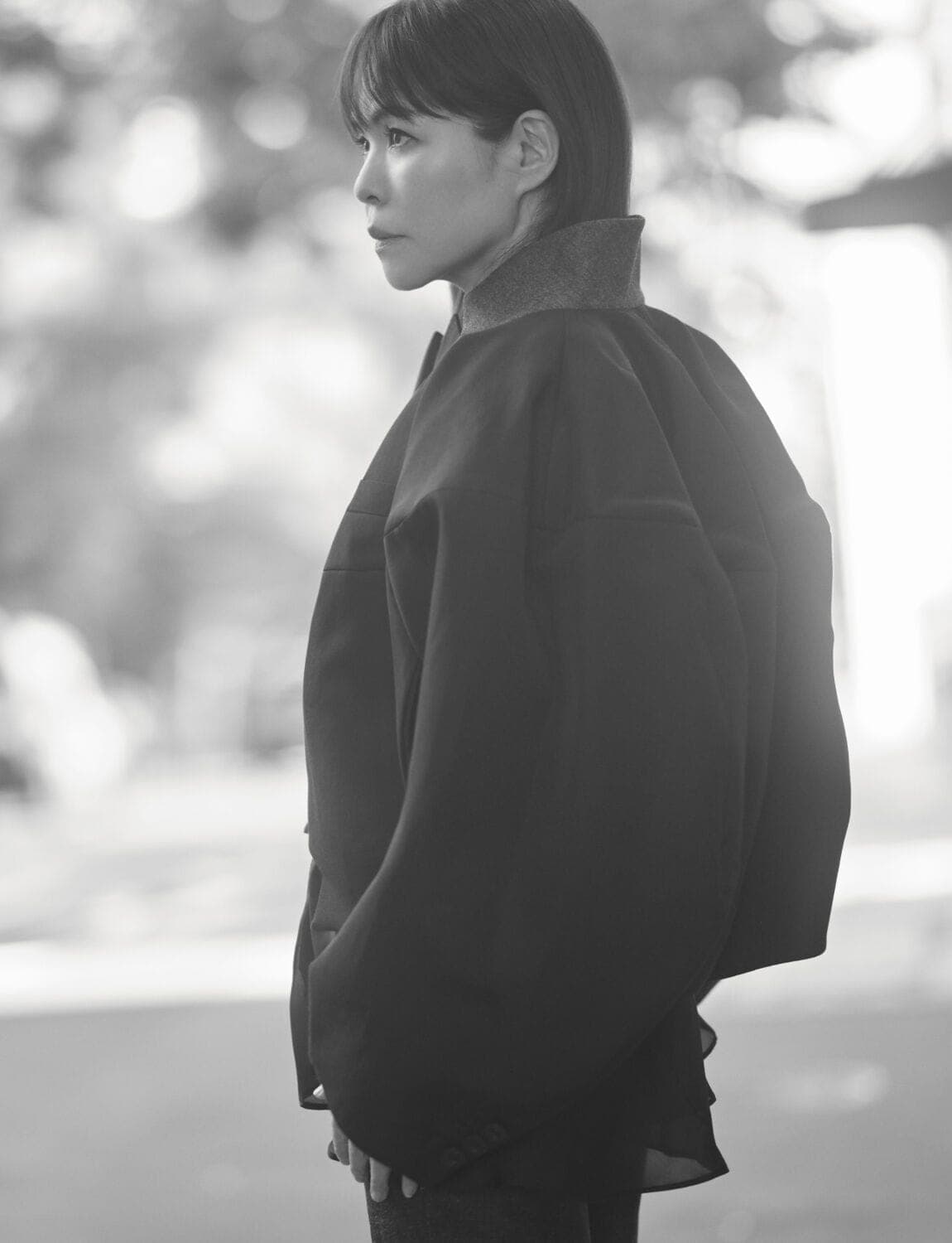 Abe has long made a point of personally wearing every piece to finalise her designs. Her favourite items are often quickly ordered for herself. “This jacket is from the first look of the SS24 collection. The theme was to simplify rather than add on, and to express Sacai’s identity through form,” she says. “For today’s shoot, I was thinking the silhouette from the side would be especially beautiful.”