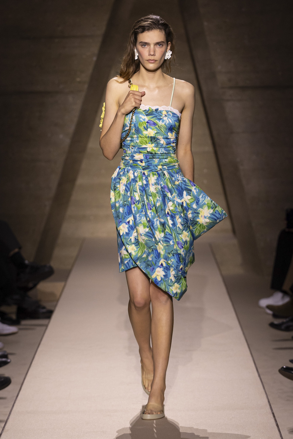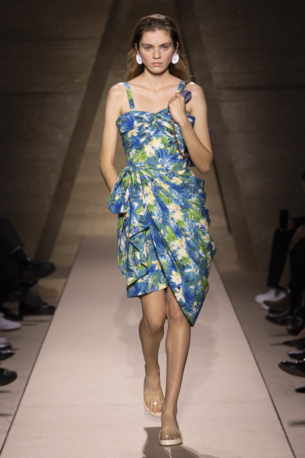 That was her queue to redraw vintage florals from the ’50s and ’60s on humble cotton poplin and silk jersey, and drape them into little ruched and swagged bustier dresses, sarong skirts and party tops. Some shapes were inspired by the archive 1950s dresses others by ruched vintage swimwear. Draping she said was one of her favourite ways to create silhouettes because it is “so instinctive.”