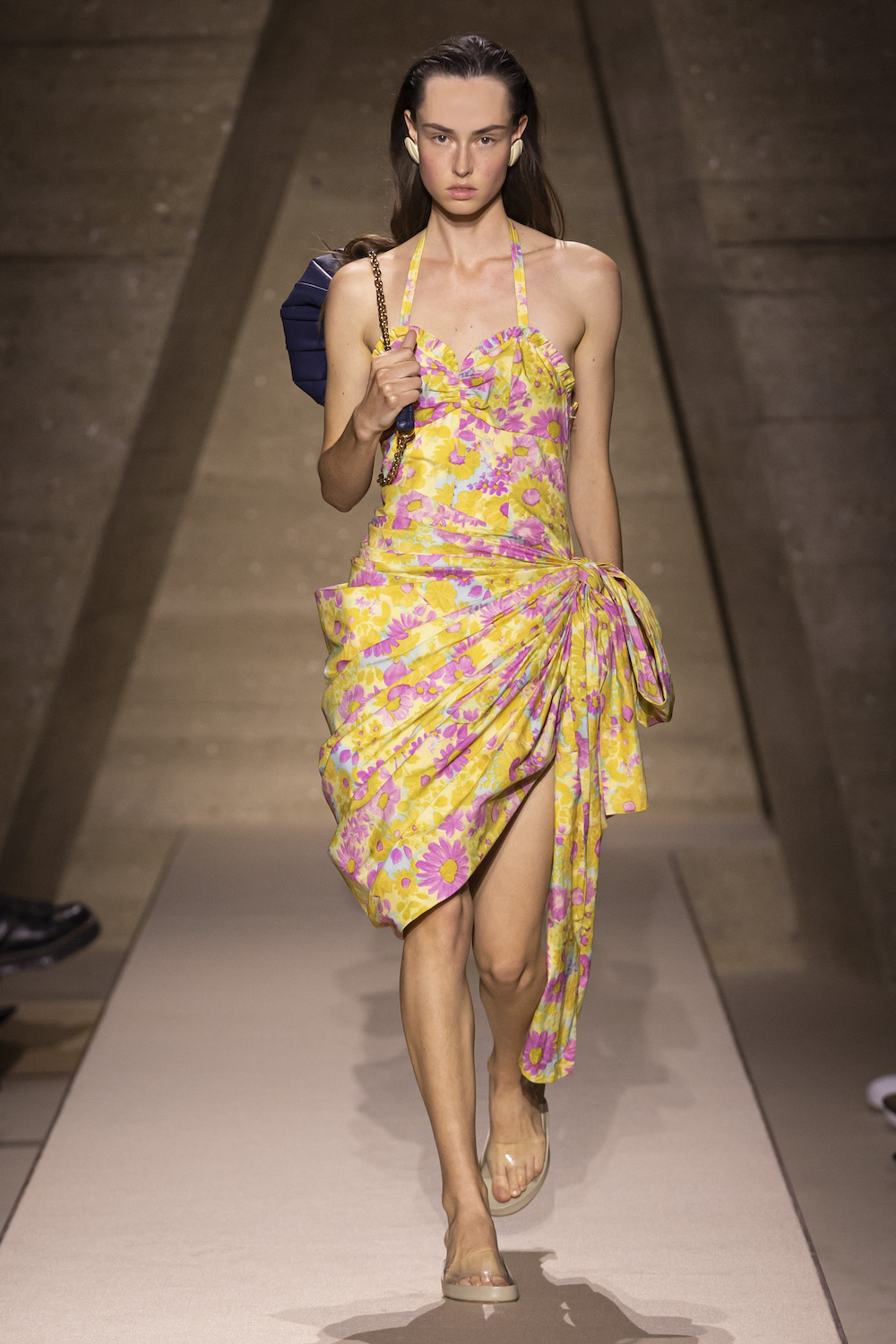 Her aim was to achieve “an airiness through pleating knotting and wrapping. Spontaneous but precisely studied.” A few cotton and lace gypsy dresses apricot and lemon nodded to her boho look and she amped up the charm with accessories sending out nicely shell and watermelon slice clutch bags and a joyful leather hydrangea pouch that came in all the soft pastel Chloé colours.