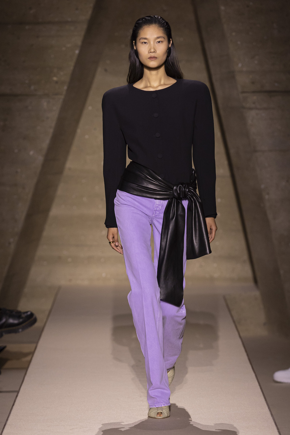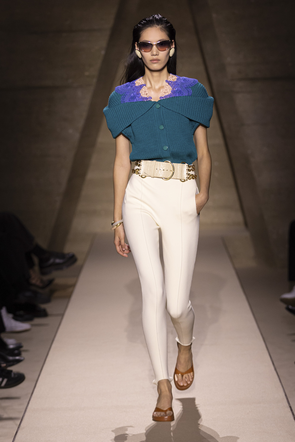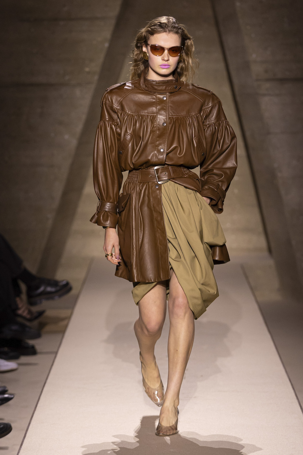 Alongside many variations on the little draped floral dresses, the designer added strong shouldered duster coats in pastel lemon and pink, and slouchy scarf necked leather blousons. These voluminous ’80s proportions added a new swagger to the prettiness of her Chloé look.