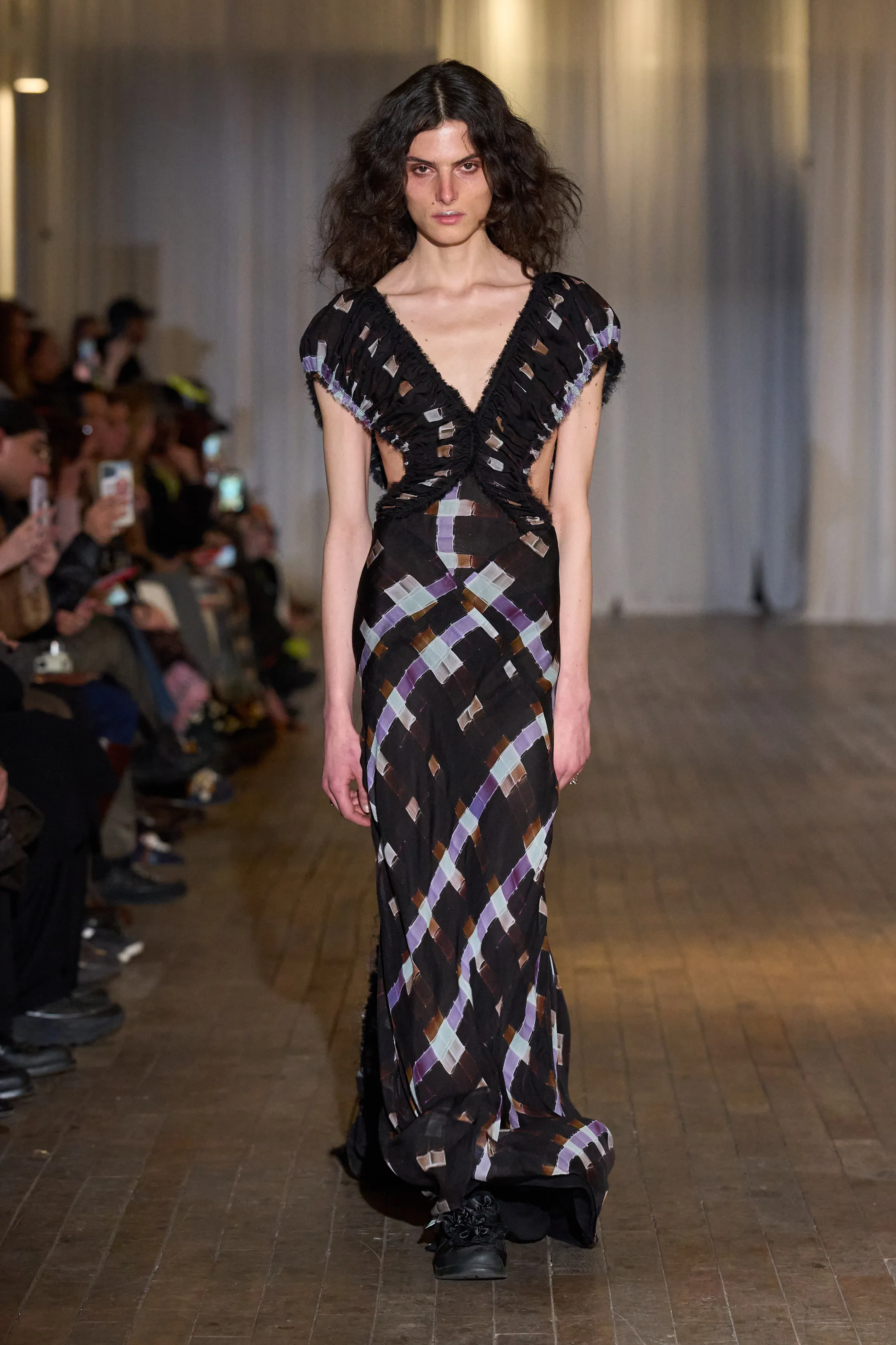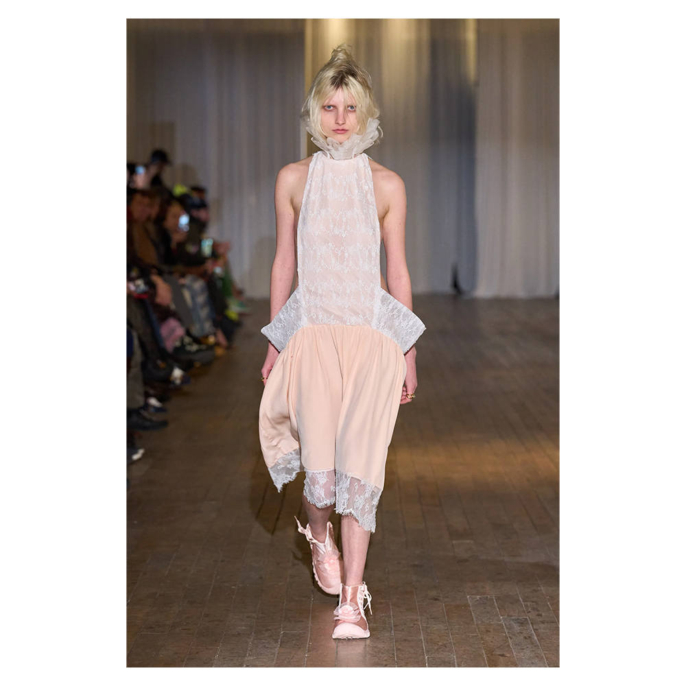 Titled The World is a Vampire, Collina Strada’s AW26 collection warns us to be careful with who and what we invite into our inner sanctums – they might be draining us. Continuing its mission as “a platform for climate awareness, social awareness, change and self expression,” the brand offered lightly veiled jabs towards the climate and social disaster whirling around us in the show notes, then presented a collection of 32 looks that offered a brief reprieve to reflect on materials, intimacy and agency.