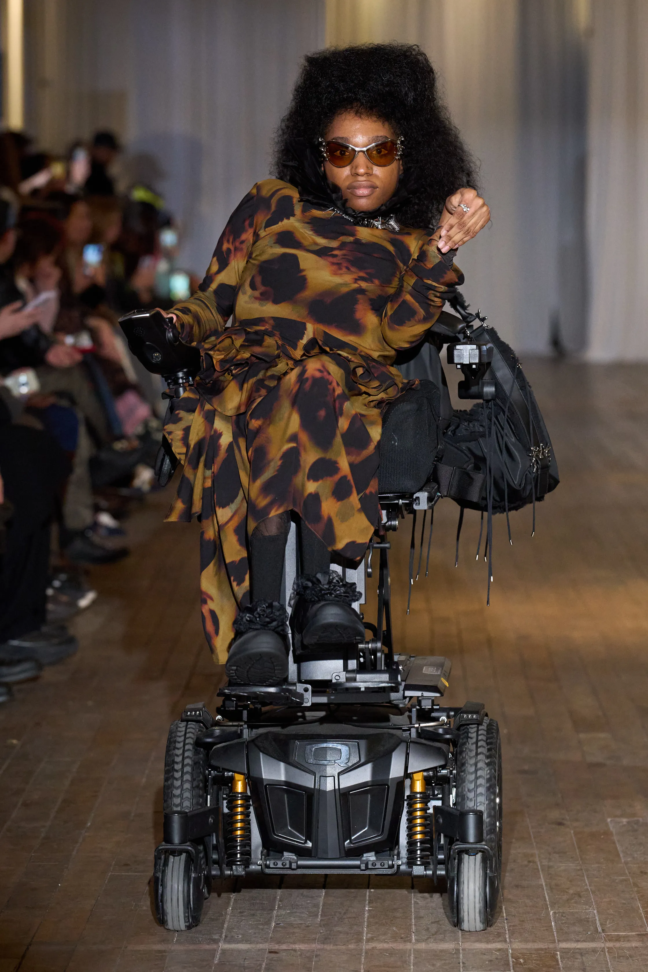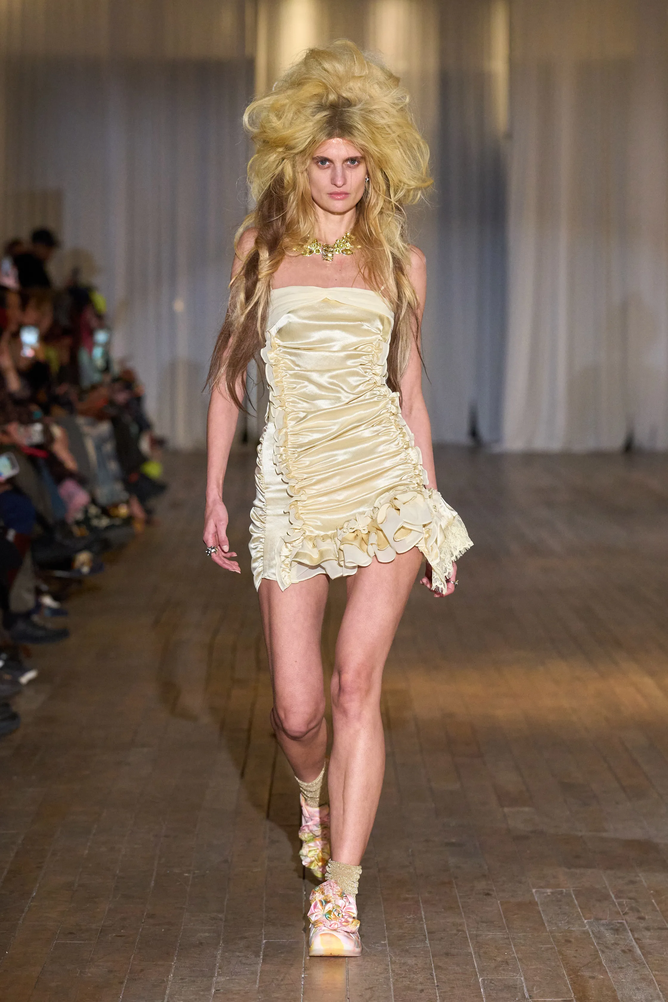 Every season the Collina Strada vision evolves into something more ambitious and encompassing than the previous season. While idling in the loading dock, waiting for the freight lift into the show, no one seemed bothered. And once the doors lifted into the space with its ambient sound bath that later turned into the pattering of rain and birdsongs, you could see people smiling as they milled about. It was only when the music morphed into a punishing drum set where people had no choice but to lock in and find salve in the clothes in front of them. The lyrics said to “pick up the pieces, [and] put it all together when the world comes apart at its seams.” The world may suck, but this fashion coven sure doesn’t.