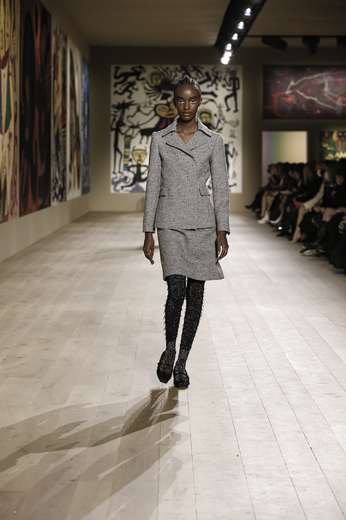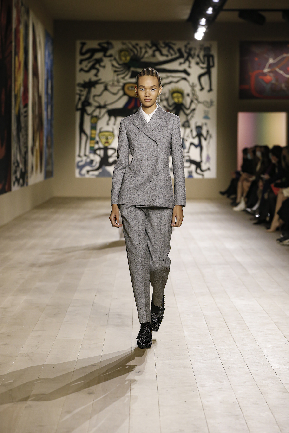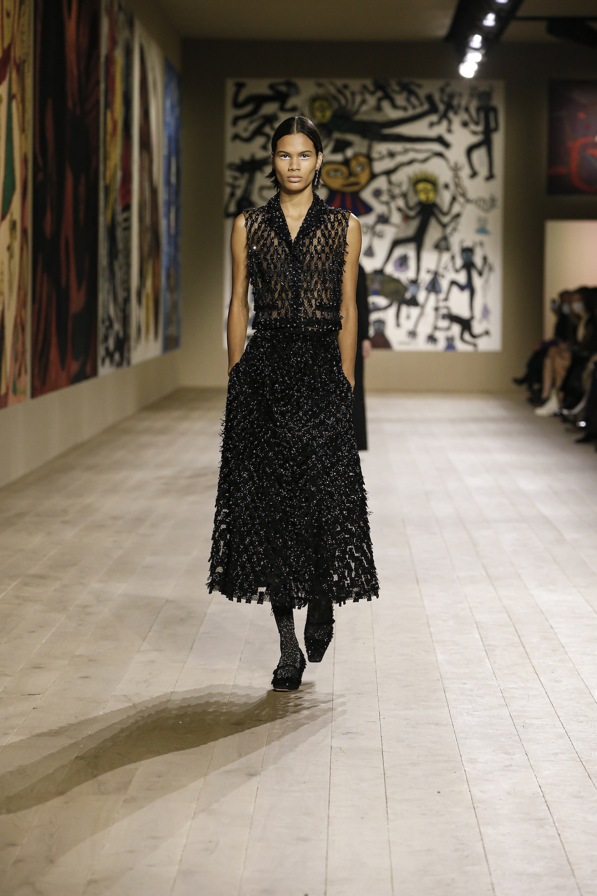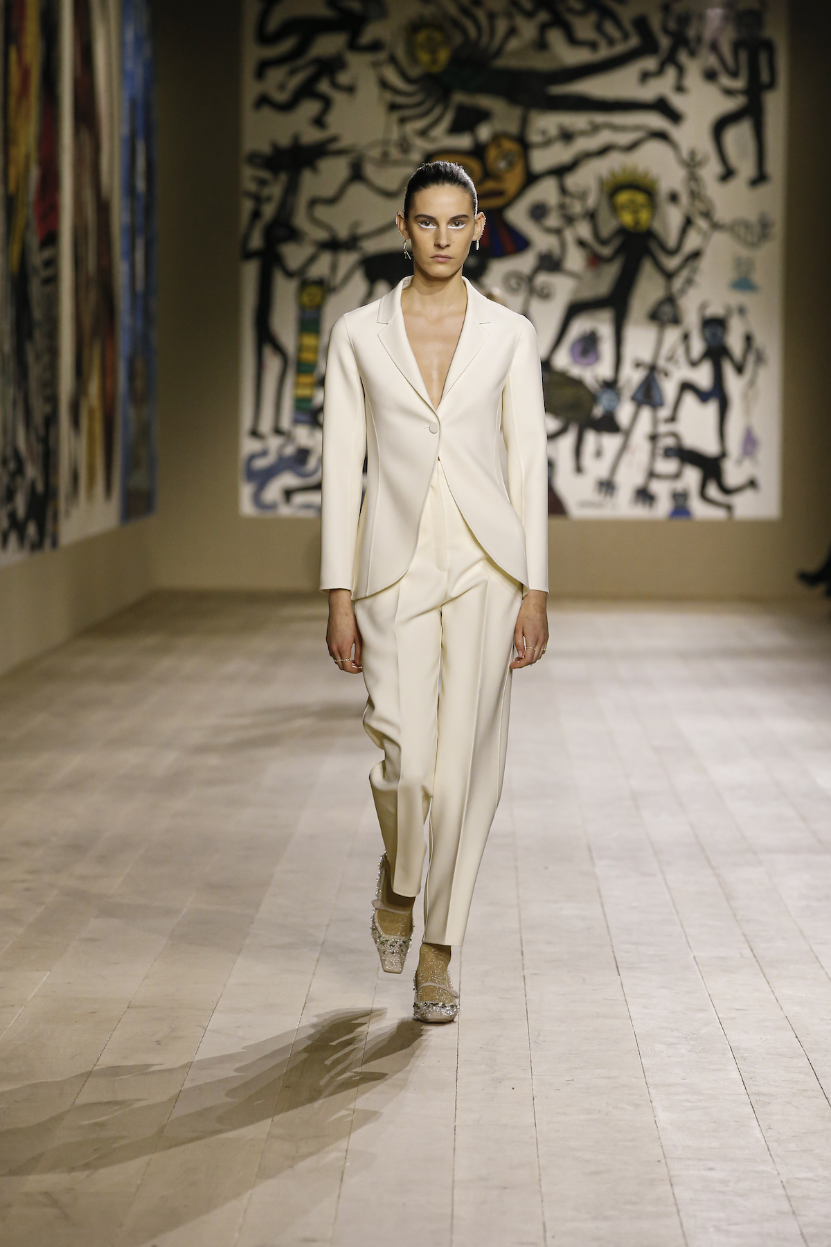 Dior's Couture SS22 show was shown at the Musee Rodin in Paris under artworks created by Indian couple Madhvi and Manu Parekh. The Dior girls glided in slick couture-ified bodysuits, glistening covered in crystals while organza and tweed came adorned with the finest Indian embroidery. The pure white wool suits and dresses were dreamlike, silk crepe dress's flouncded with a metallic fishnet neckline falling so effortlessly as the girls walked. Upon leaving the space, we spotted a woman dressed in a classic Dior two-piece suit, coiffed to perfection, while her companion embodied the house’s new legion of fans, with her Saddle bag and sneakers. They both gleamed with excitement. Chiuri has curated a cross-generational shopping list with immediate effect.