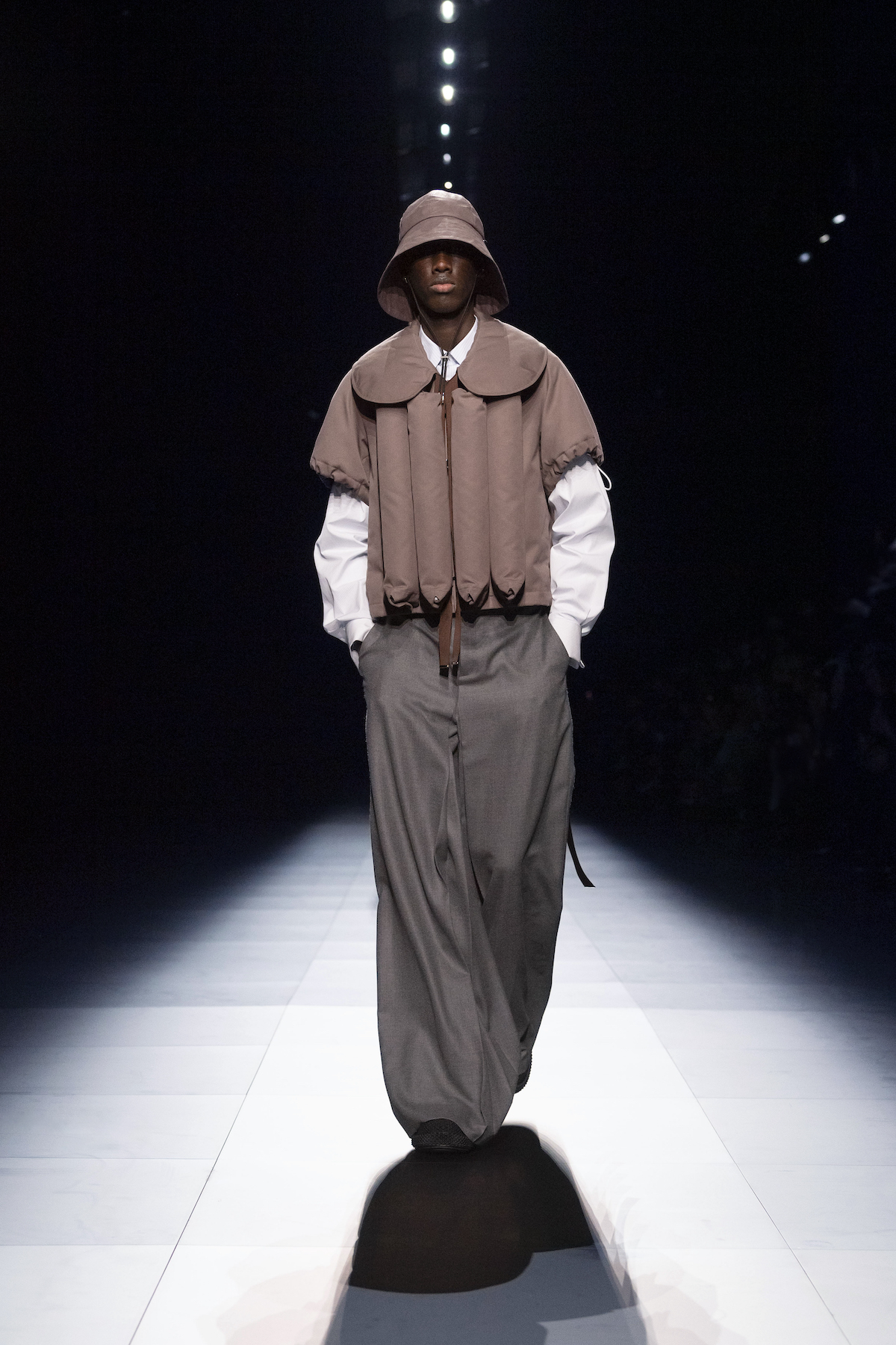 The poem was chosen for its references to the Thames and the Seine, and how the “connotations and contrasts” between each river have inspired both Eliot’s writing and have been reflected in Jones’ collision of Parisian elegance with London, street-centric sensibilities. The designer adopted key components of a fisherman’s wardrobe into the collection. Be it yellow raincoats and Stephen Jones-designed sou’wester hats, or bombers that resembled life jackets and Aran knits draped effortlessly over romantic shirting. These were worn alongside jumpers that sprouted with lilies, fluid culottes and languid tailoring that fell effortlessly off the shoulder.
