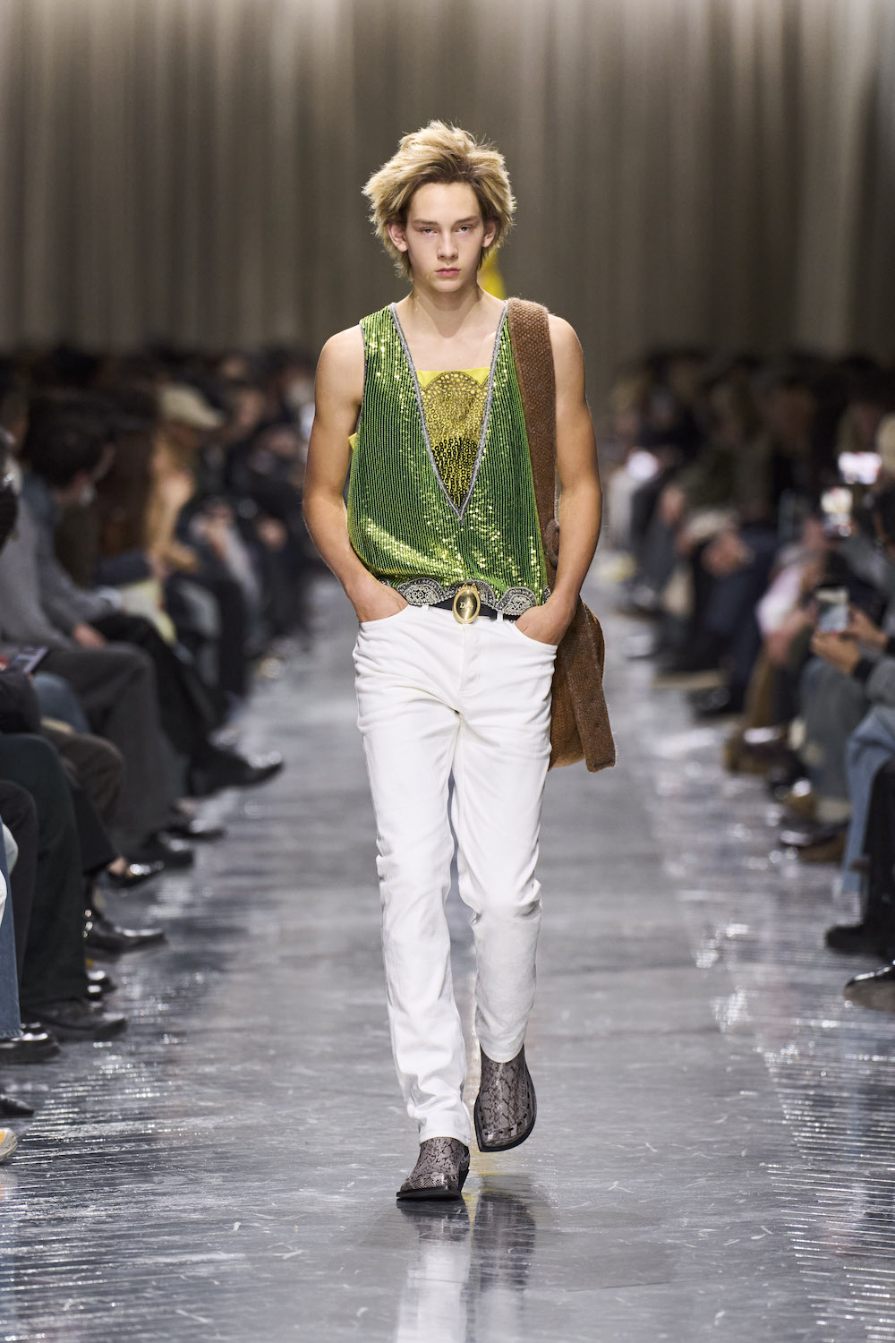 What happened when the pretty boys of Jonathan Anderson’s debut peeled out of their bow ties, dyed their hair acid yellow and chucked on some sparkle? The designer’s sophomore men’s collection for the house, unveiled this afternoon, was daring in its glamour and eclectic in spirit. The show might’ve taken place on what would’ve been Monsieur Dior’s 121 birthday, yet it was the work of another courtier that guided Anderson’s design hand this time around. Paul Poiret spent the early 20th century bringing an air of theatricality to couture, folding in ideas born in North Africa and East Asia into his opulent creations. He famously discarded the corset and was known to hold lavish fancy dress parties for the elite.
