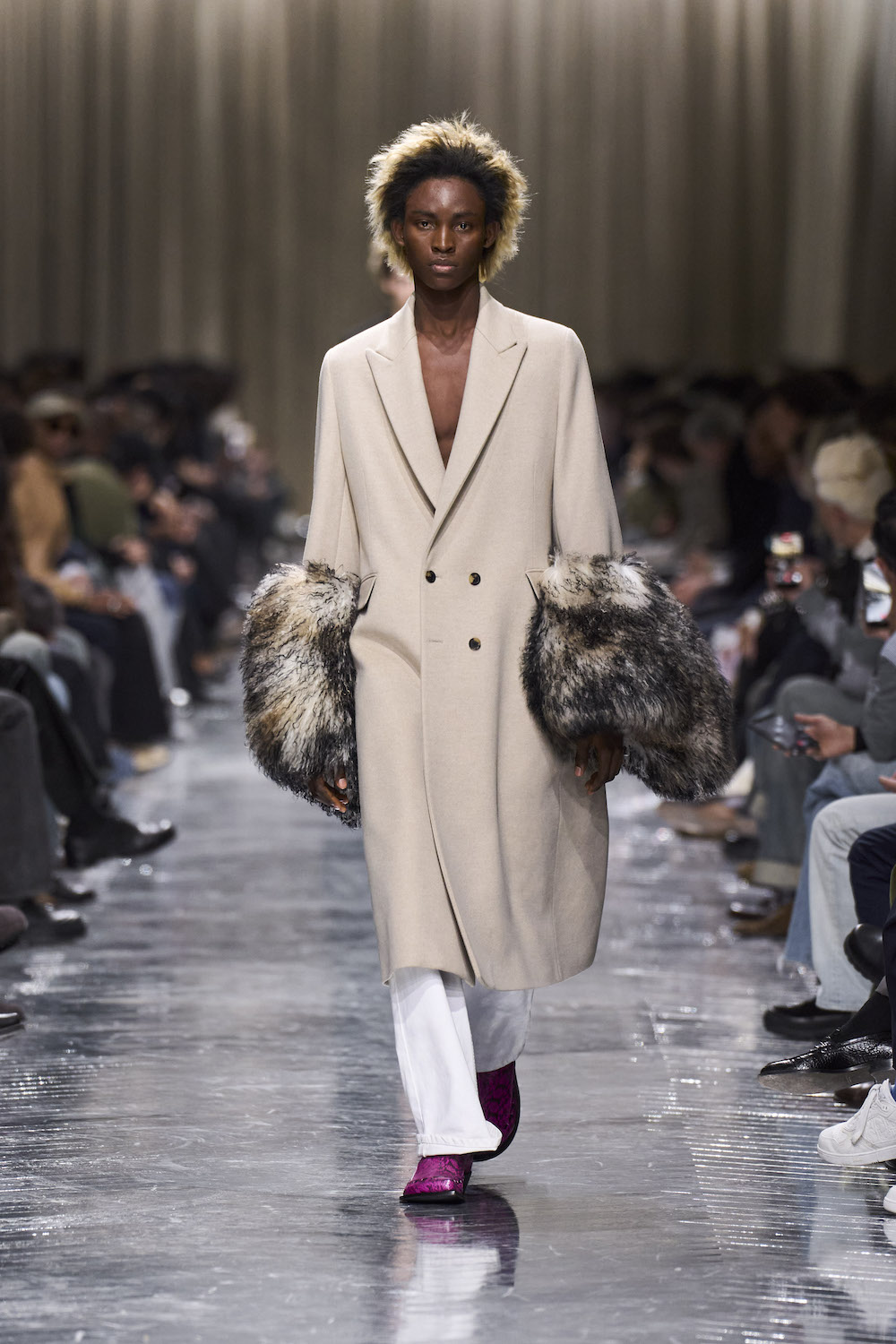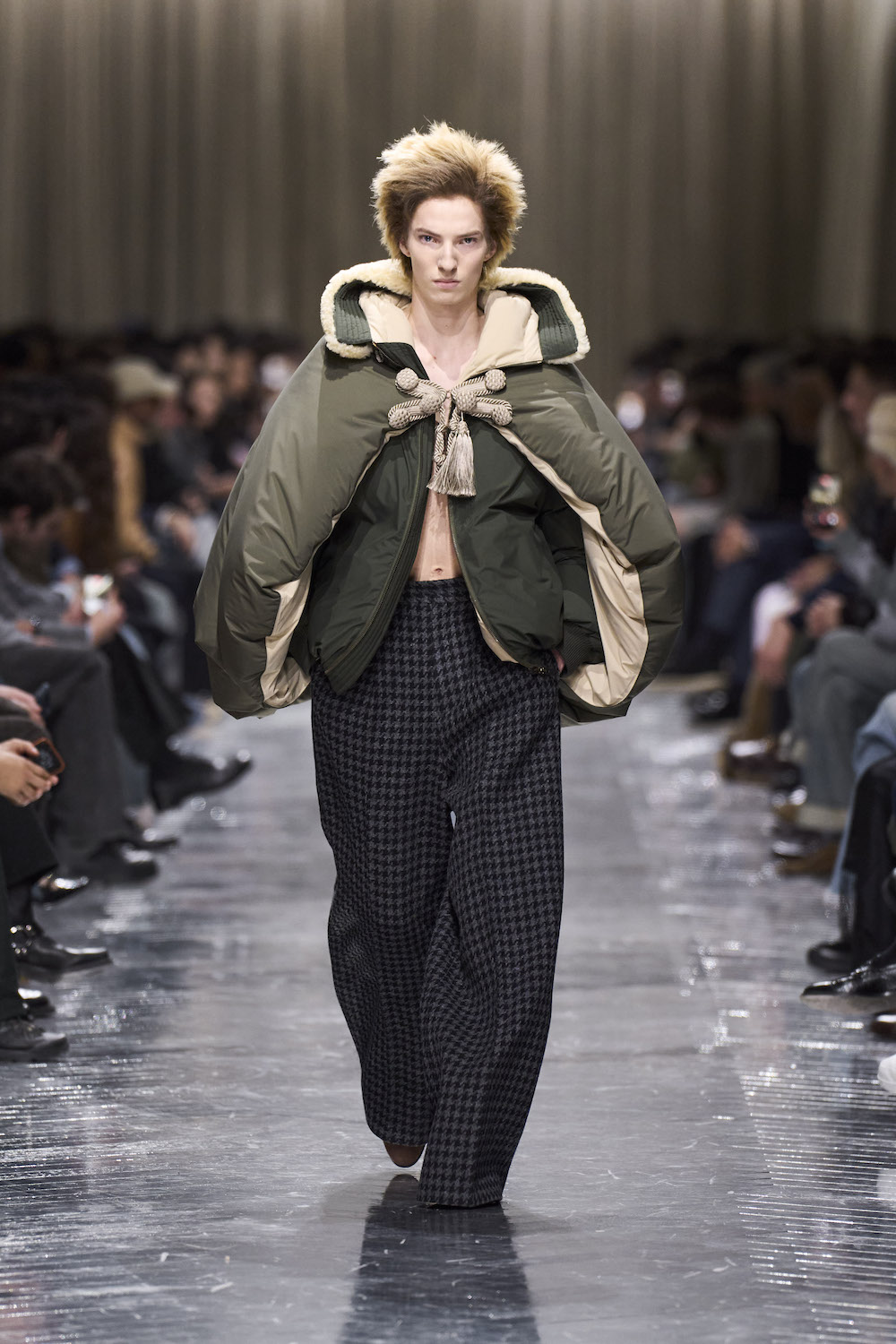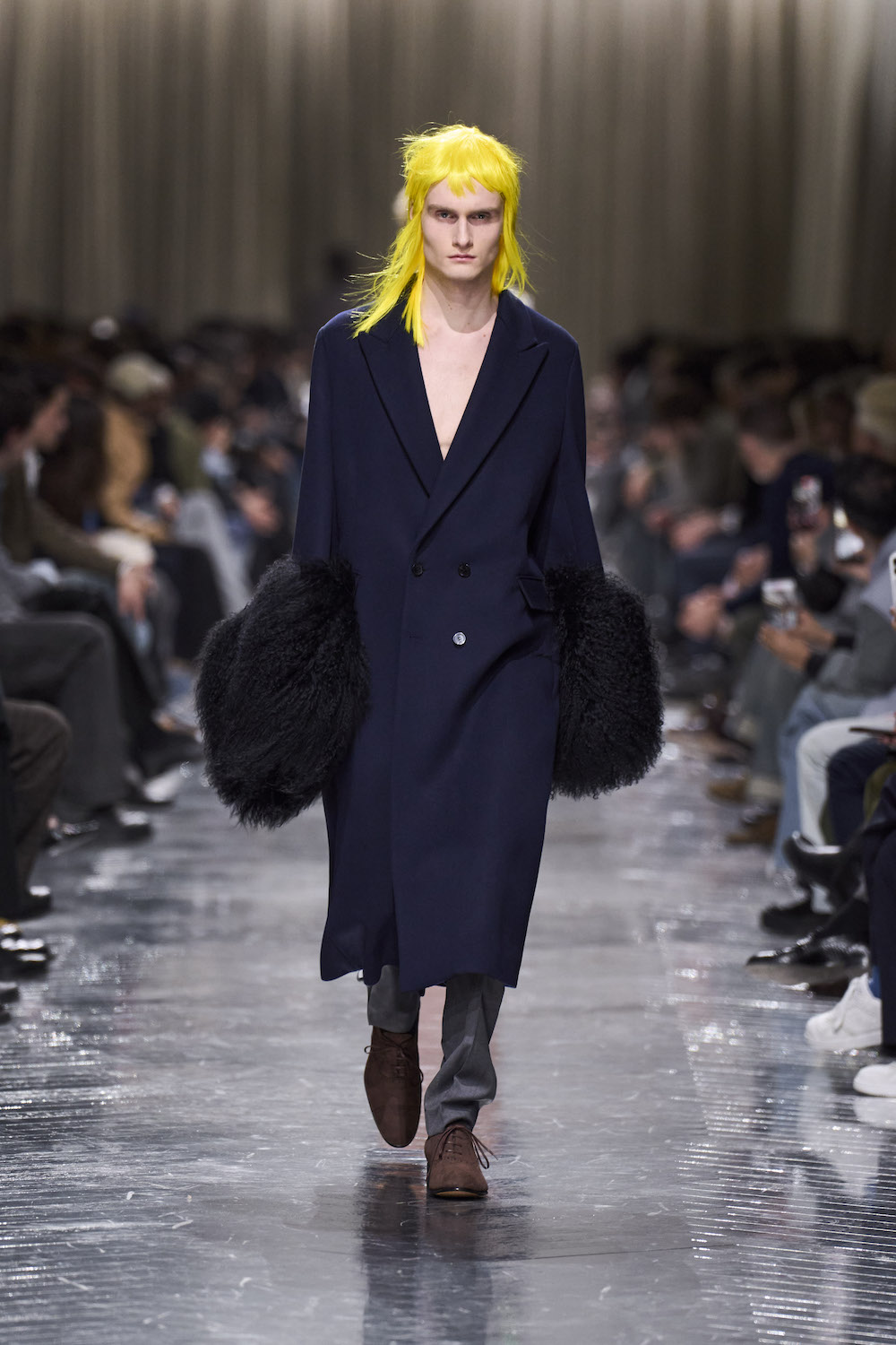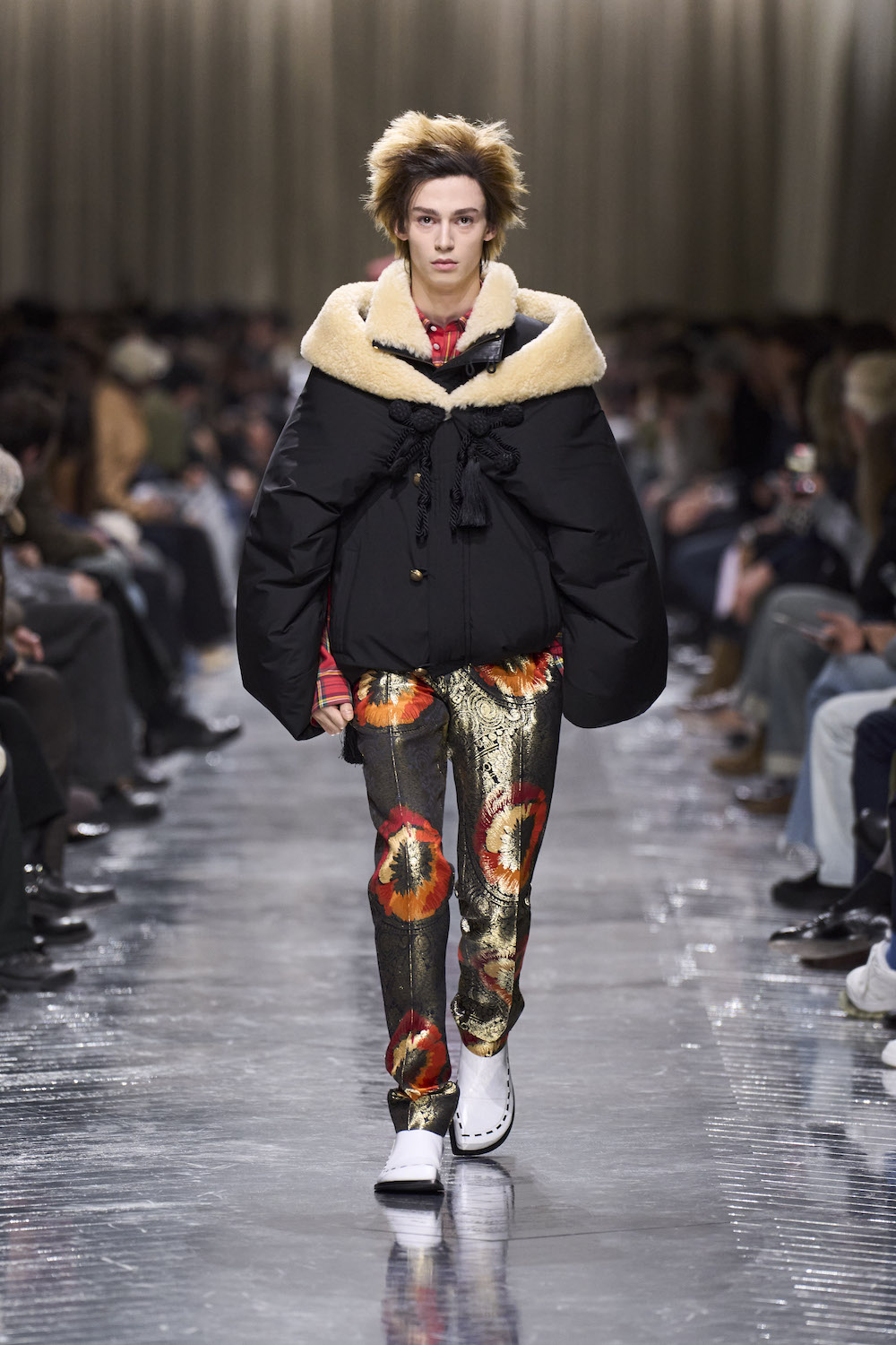 Throughout, Anderson pushed hallmarks of the man’s wardrobe with a wink and a nudge. Shirts came with shiny, embroidered epaulettes. Overcoats had monstrous furry cuffs. Messenger bags looked as if they were crafted from torn-up carpets. The designer’s exploration of dressing up saw him play with proportions. Many of the coats were bulbous and cocooning, including swollen bomber jackets that migrated into swirling, brocade capes. In contrast, tailoring was shrunken tight to the body and cut from Donegal tweeds.