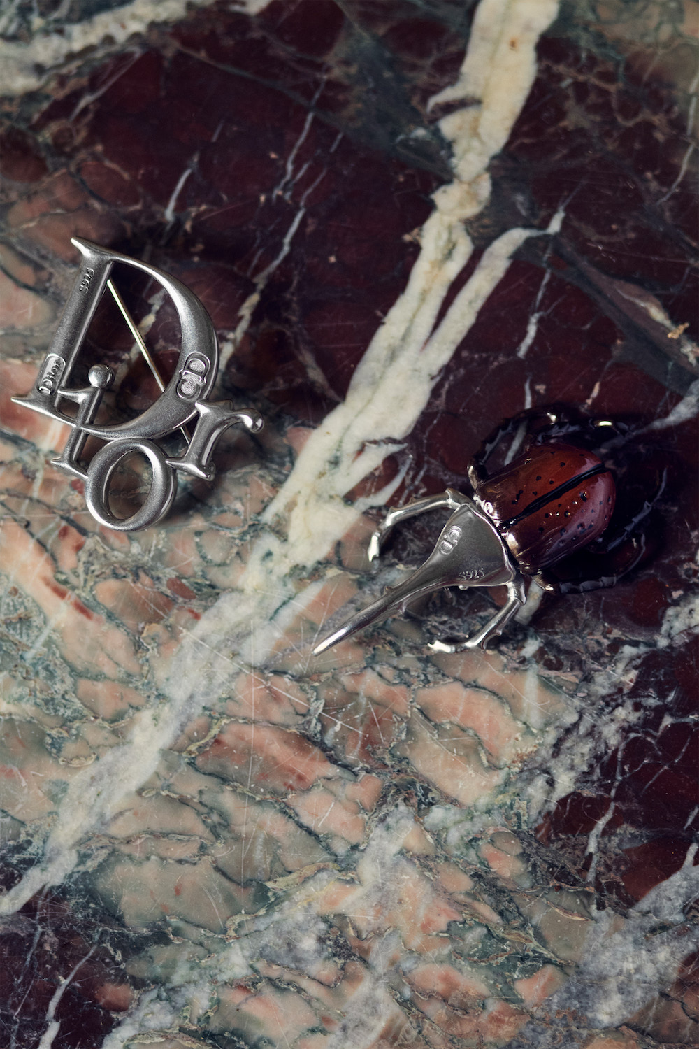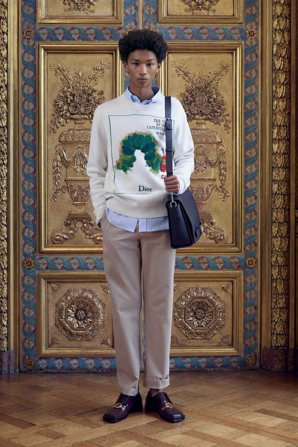 Anderson leans on the house’s archive with confidence: the Bar jacket appears with a lighter attitude, the Delft shorts sit beside frockcoats and tailcoats and everyday pieces – rugby shirts, chinos, striped shirting, knit jumpers (one embroidered with The Very Hungry Caterpillar) and five-pocket denim – are given small updates that bring them into the now. Denim tailcoats stand out as an easy symbol of the Northern Irish designer’s approach: heritage shapes in modern materials. Embellishment is present but controlled, with small embroideries, rococo-style Diorette charms, beetle brooches, bumble bee pendants and those enlarged crests working as prints rather than decoration for decoration’s sake. Meanwhile, British Donegal tweed nods to Dior’s history, while an emphasis on denim brings in a distinctly American edge.