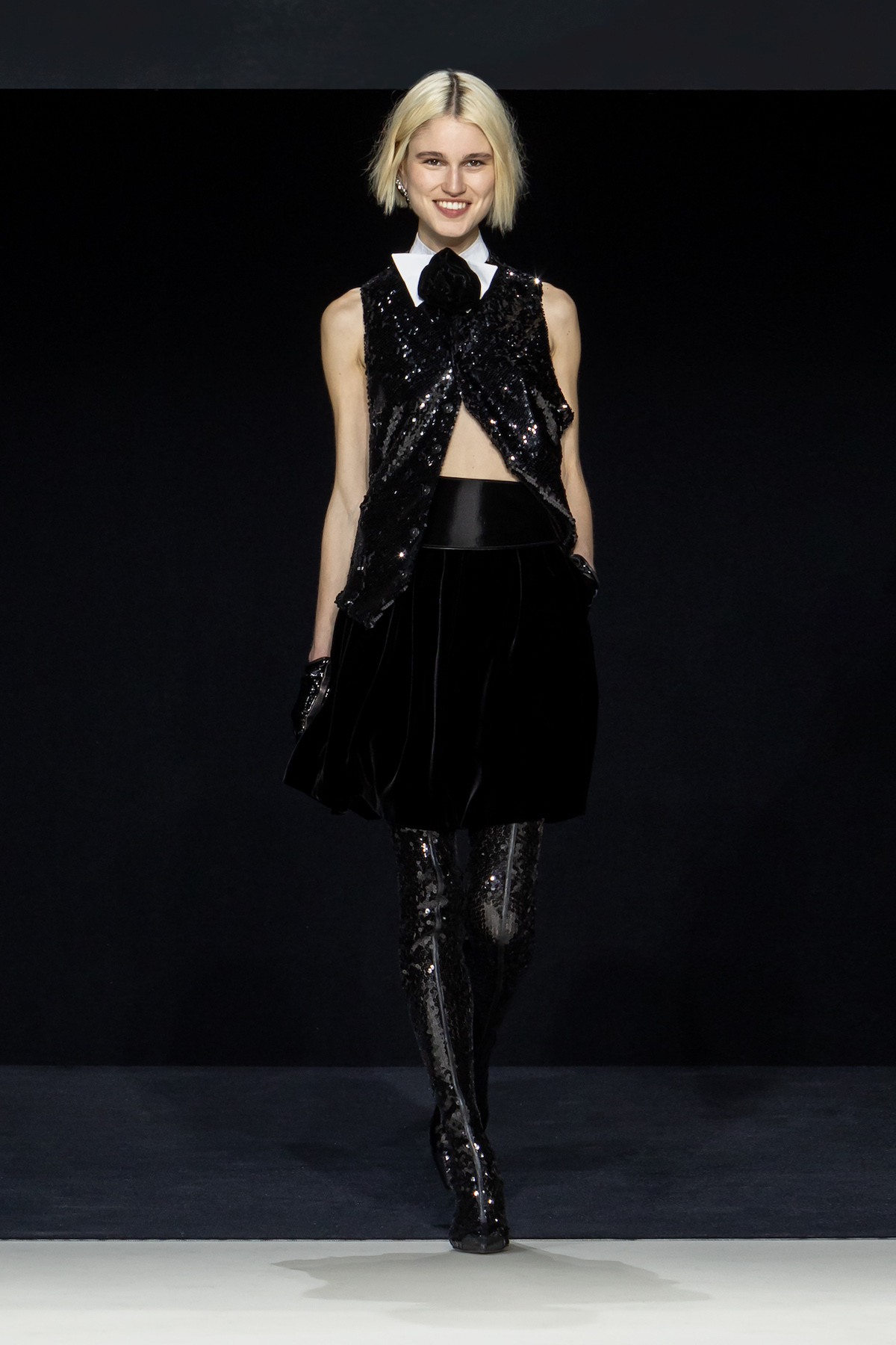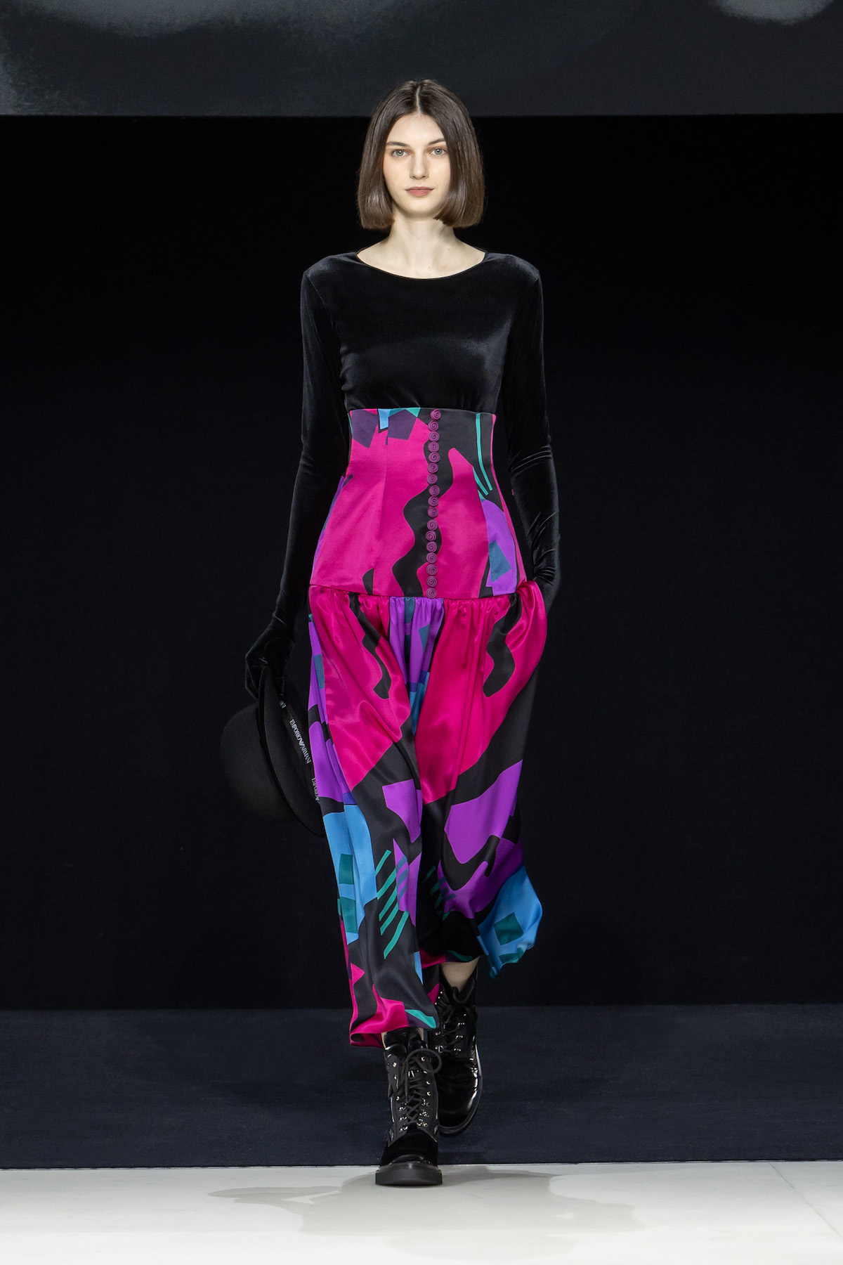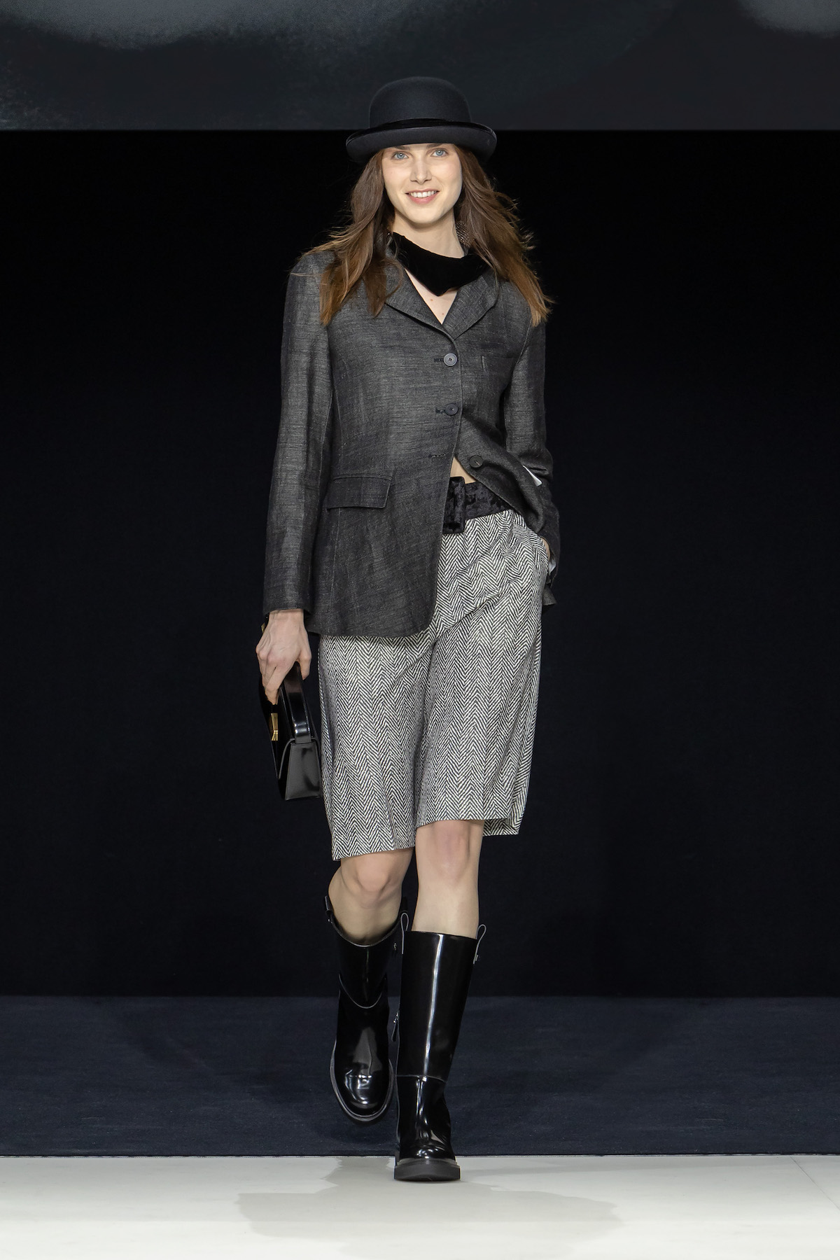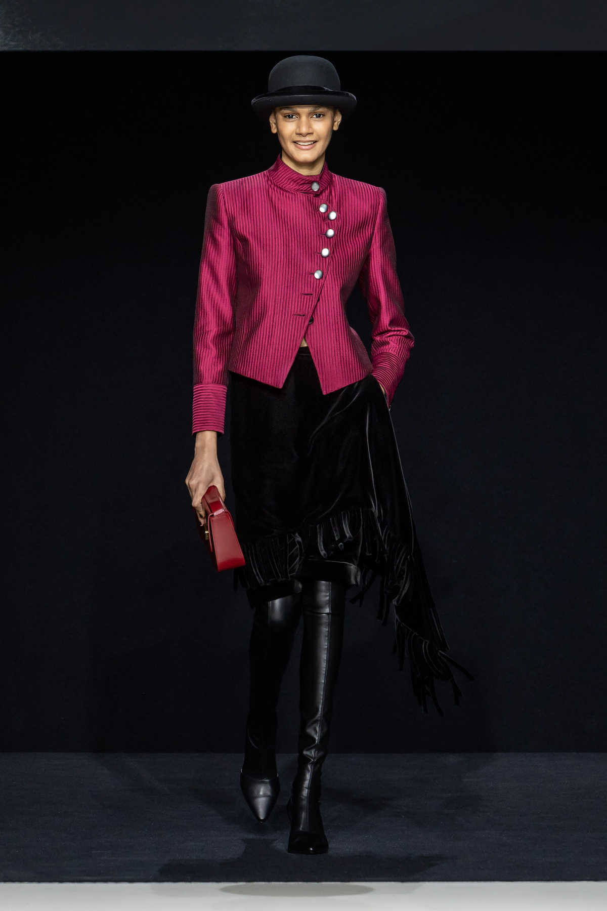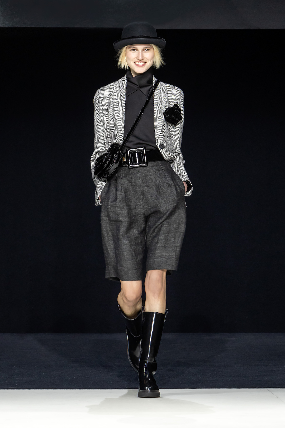 From the first moment the smiling models sauntered into the Armani Theatro, presented this season in the round, the collection, Circus of Life, was an expression of upbeat joy from Mr. Armani, following in the same sprit as couture shown just a month ago in Paris, which in turn was a play on the Harlequinade. The jet-black velvet shorts off set, the natty pink jackets with velvet lapels; a nylon bomber edged with velvet added a luxe invitation to party. The super skinny thigh length boots had just the right amount of chunky extended Cuban heel and the Cabaret-esque Sally Bowles bowler hats put the purring into this night. We like a Kit Kat club vibe. Buttoned jodhpurs ringmaster style, emerald and cobalt velvet pants suits were all softly tailored classics, deep corset belts cinched, giant paillettes rustled, all ready for mad dancing and going off like fireworks. A-line short swishy party dresses and bundles of pearls were a twirling a lesson in Emporio Armani. And then there was the Guy Bourdin exhibition that has just opened at the Armani Silos space across the road – mirroring this richness of colour all of its own. A must see.