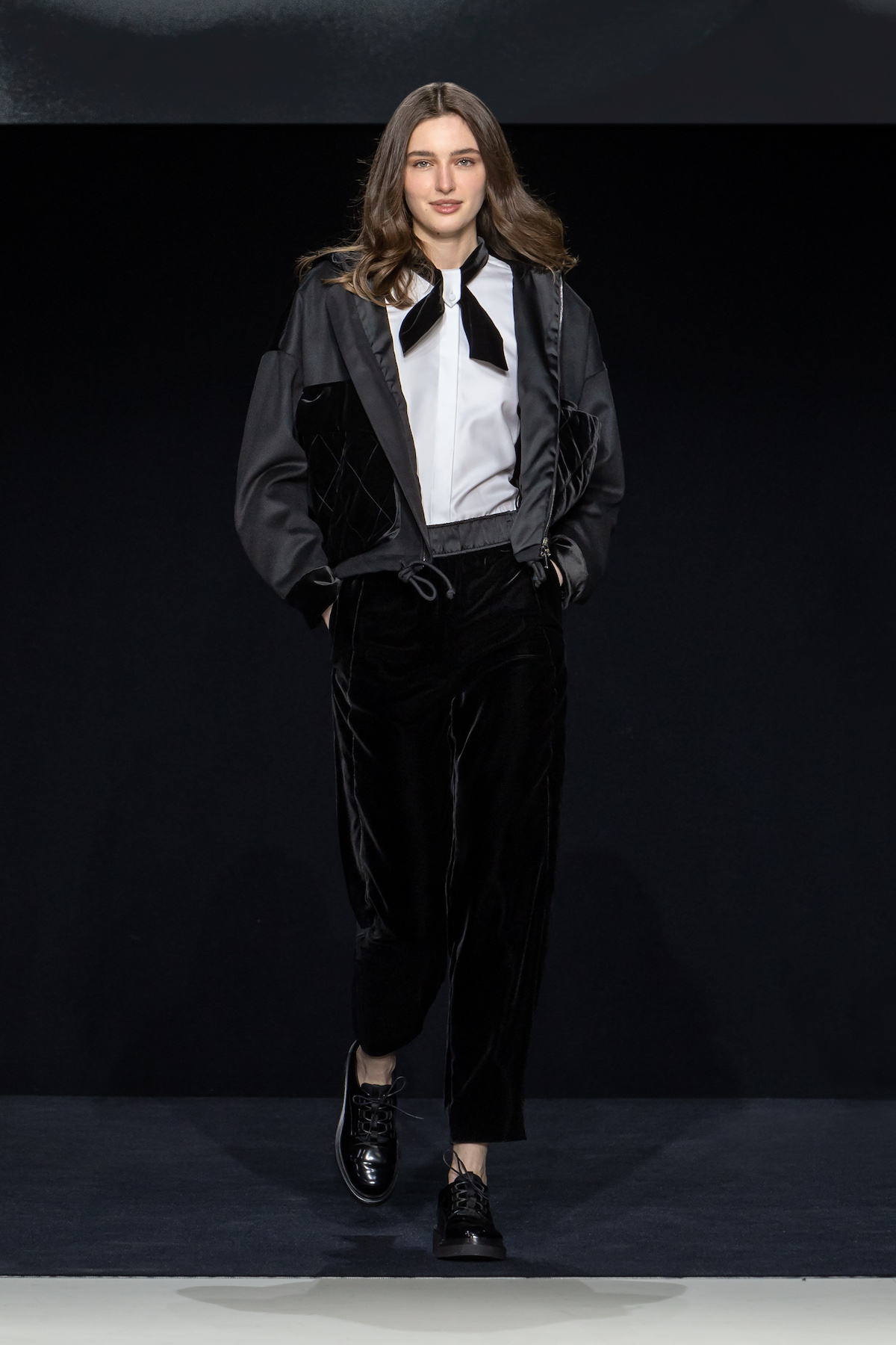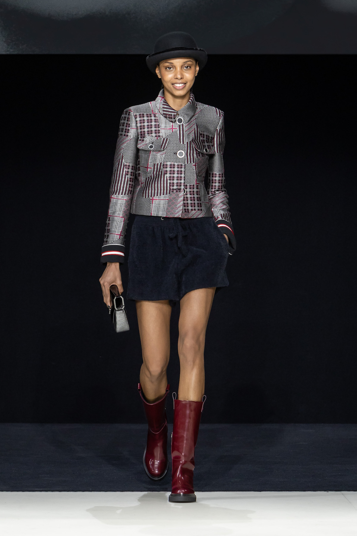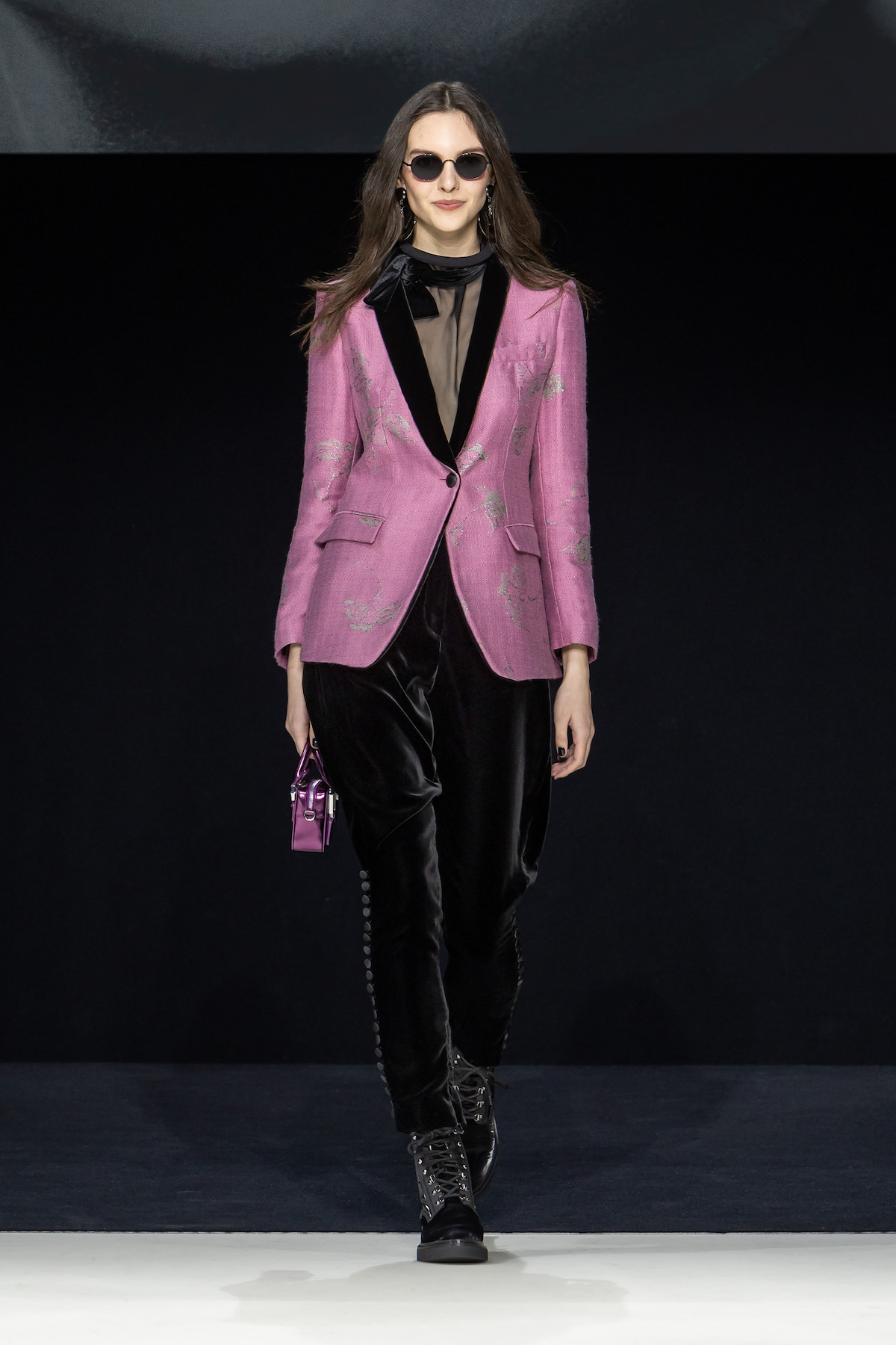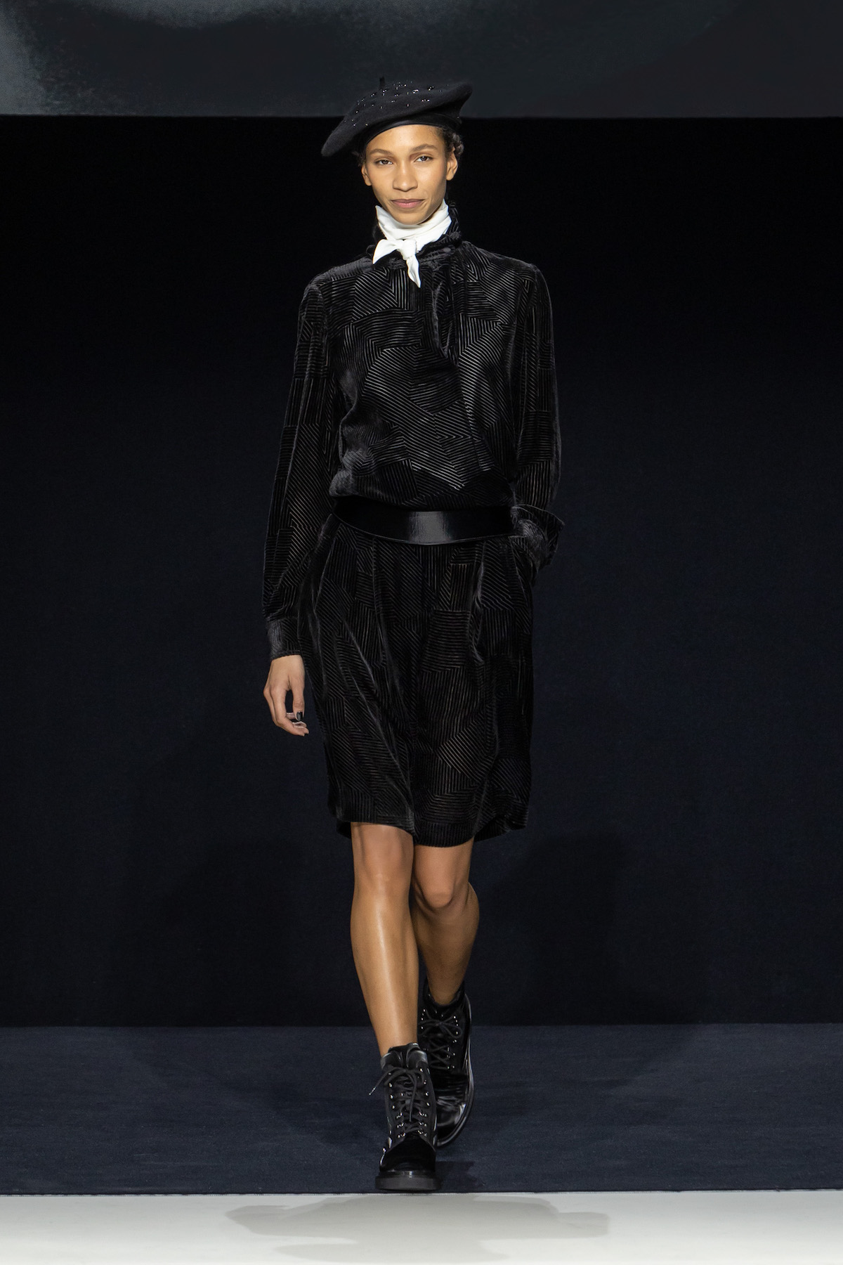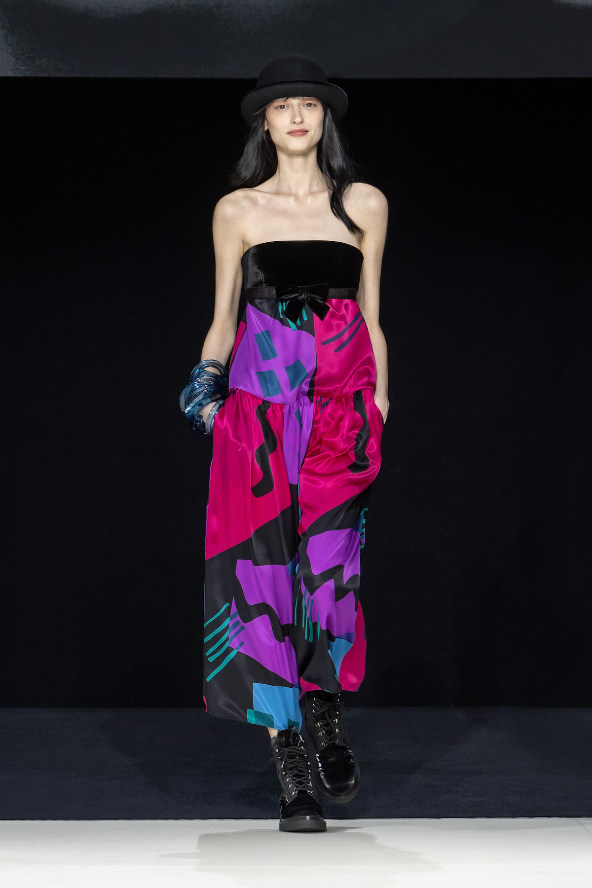 From the first moment the smiling models sauntered into the Armani Theatro, presented this season in the round, the collection, Circus of Life, was an expression of upbeat joy from Mr. Armani, following in the same sprit as couture shown just a month ago in Paris, which in turn was a play on the Harlequinade. The jet-black velvet shorts off set, the natty pink jackets with velvet lapels; a nylon bomber edged with velvet added a luxe invitation to party. The super skinny thigh length boots had just the right amount of chunky extended Cuban heel and the Cabaret-esque Sally Bowles bowler hats put the purring into this night. We like a Kit Kat club vibe. Buttoned jodhpurs ringmaster style, emerald and cobalt velvet pants suits were all softly tailored classics, deep corset belts cinched, giant paillettes rustled, all ready for mad dancing and going off like fireworks. A-line short swishy party dresses and bundles of pearls were a twirling a lesson in Emporio Armani. And then there was the Guy Bourdin exhibition that has just opened at the Armani Silos space across the road – mirroring this richness of colour all of its own. A must see.