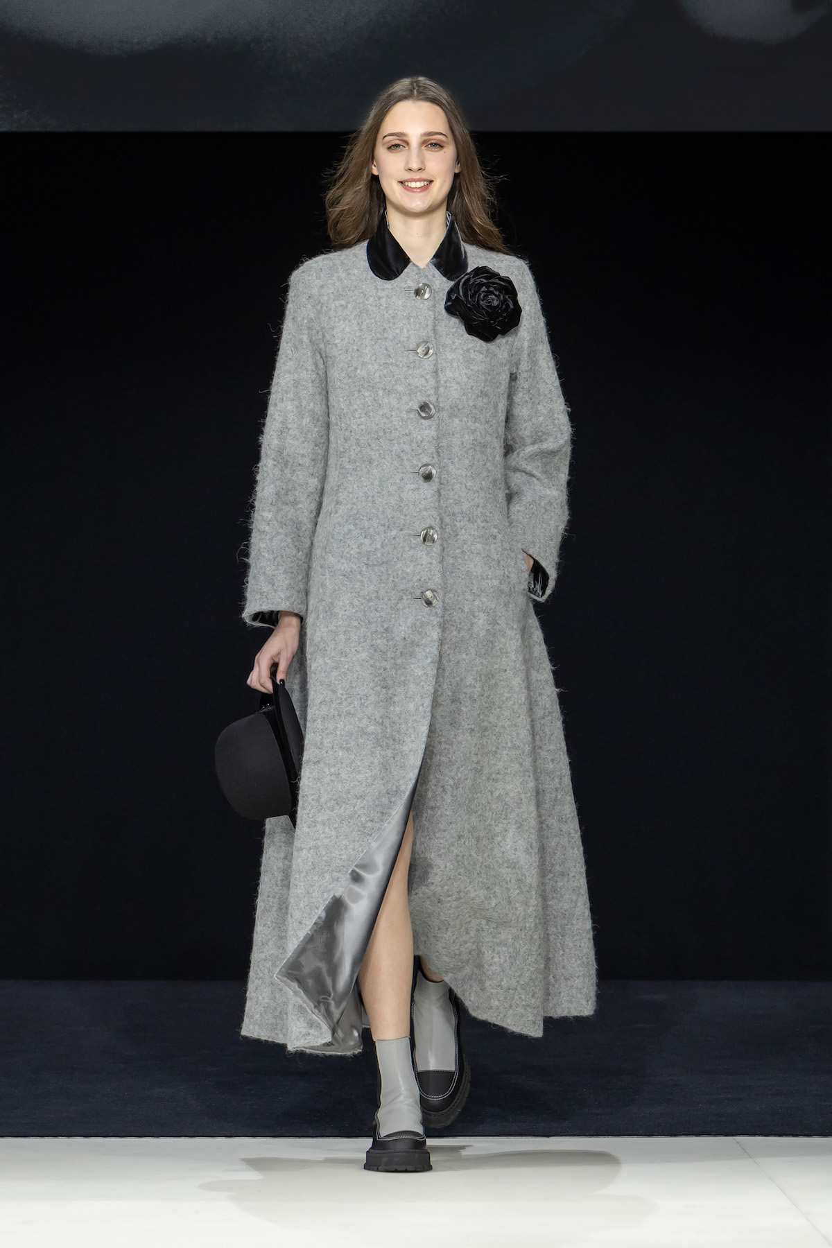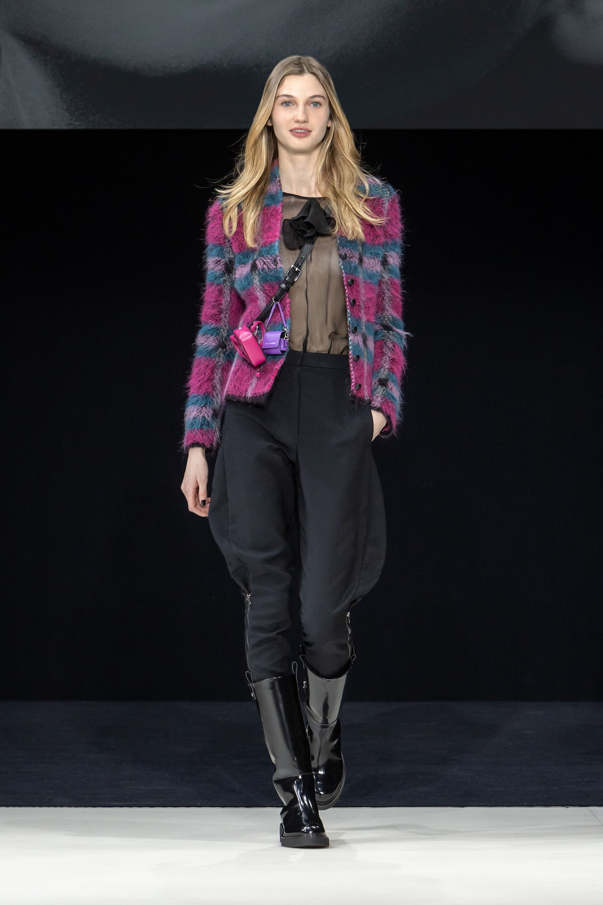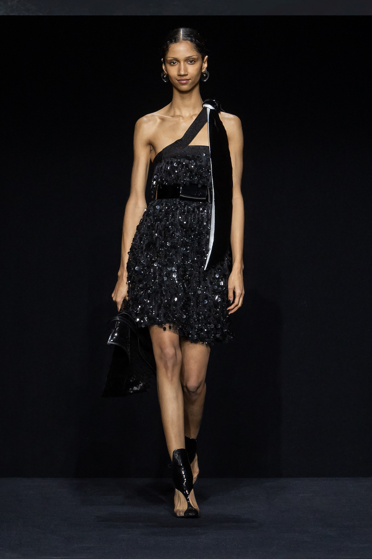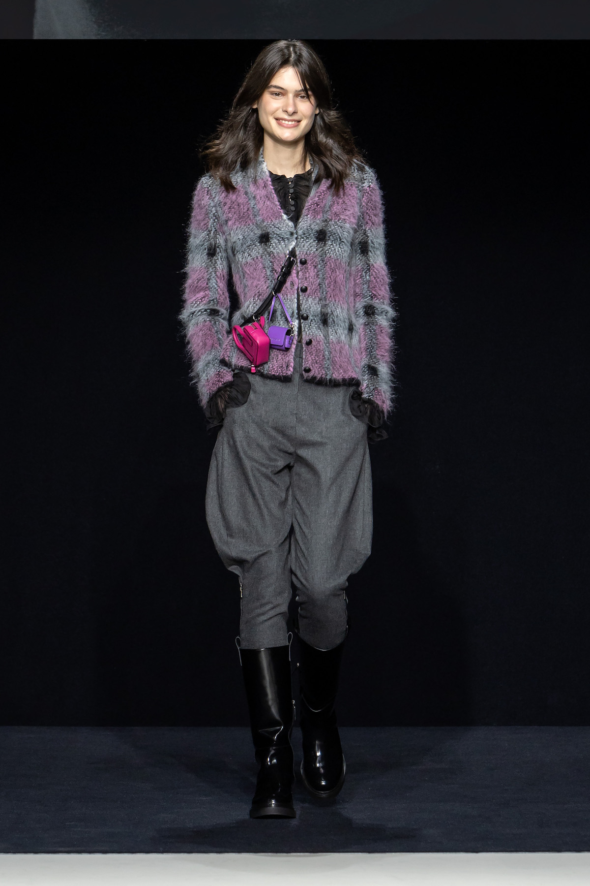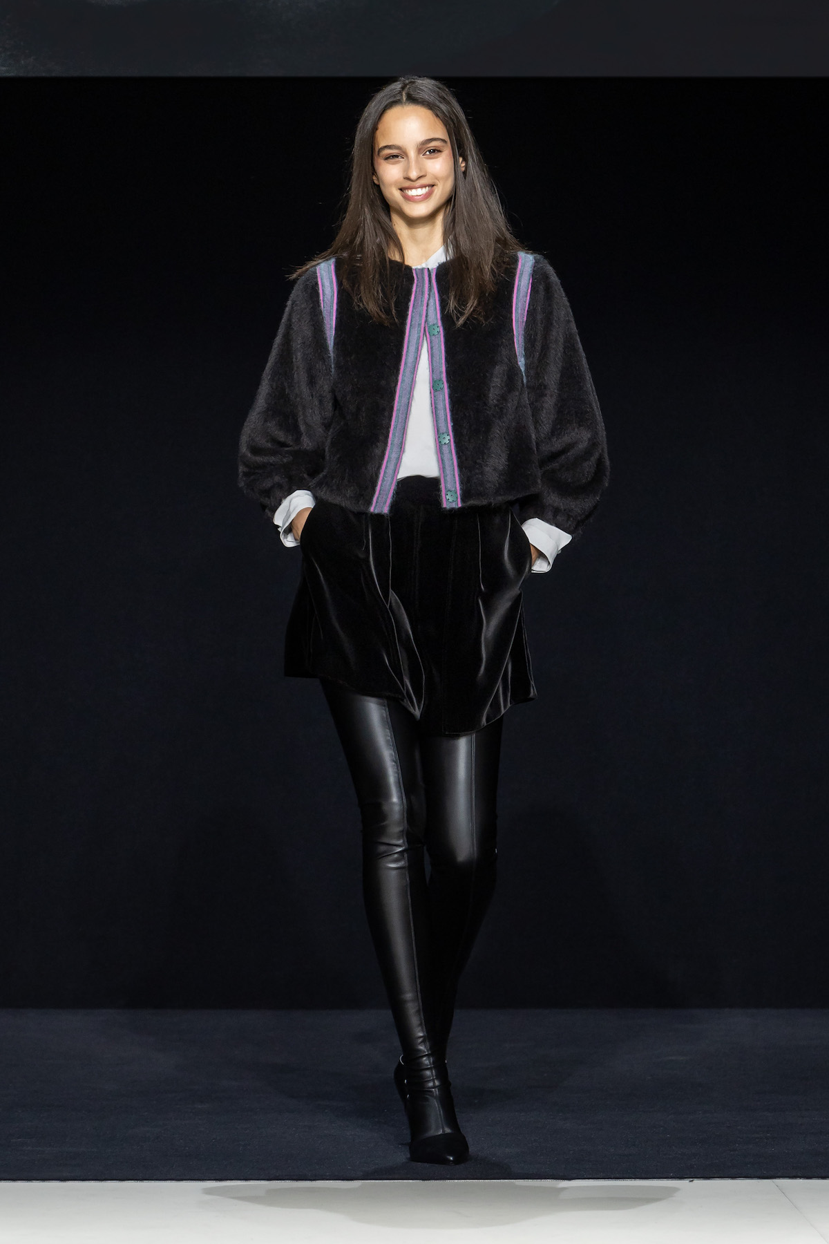 From the first moment the smiling models sauntered into the Armani Theatro, presented this season in the round, the collection, Circus of Life, was an expression of upbeat joy from Mr. Armani, following in the same sprit as couture shown just a month ago in Paris, which in turn was a play on the Harlequinade. The jet-black velvet shorts off set, the natty pink jackets with velvet lapels; a nylon bomber edged with velvet added a luxe invitation to party. The super skinny thigh length boots had just the right amount of chunky extended Cuban heel and the Cabaret-esque Sally Bowles bowler hats put the purring into this night. We like a Kit Kat club vibe. Buttoned jodhpurs ringmaster style, emerald and cobalt velvet pants suits were all softly tailored classics, deep corset belts cinched, giant paillettes rustled, all ready for mad dancing and going off like fireworks. A-line short swishy party dresses and bundles of pearls were a twirling a lesson in Emporio Armani. And then there was the Guy Bourdin exhibition that has just opened at the Armani Silos space across the road – mirroring this richness of colour all of its own. A must see.