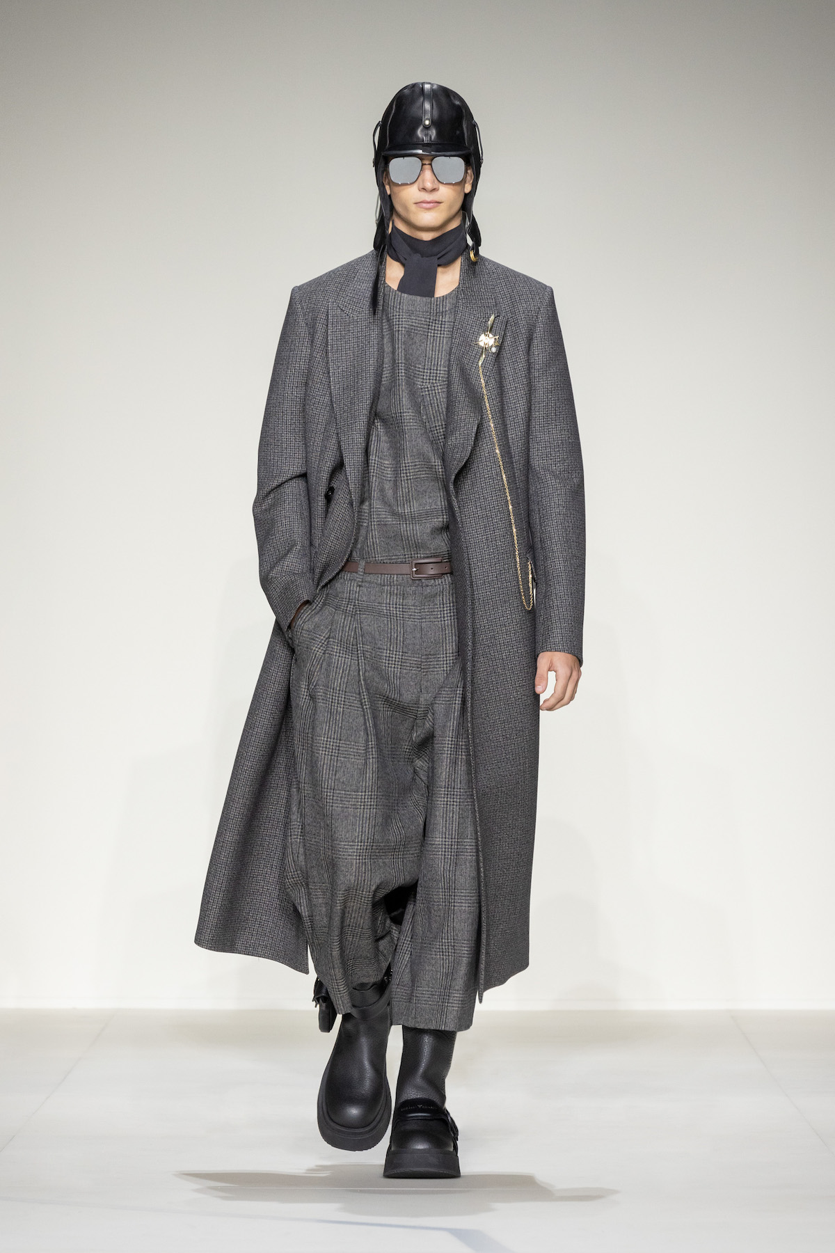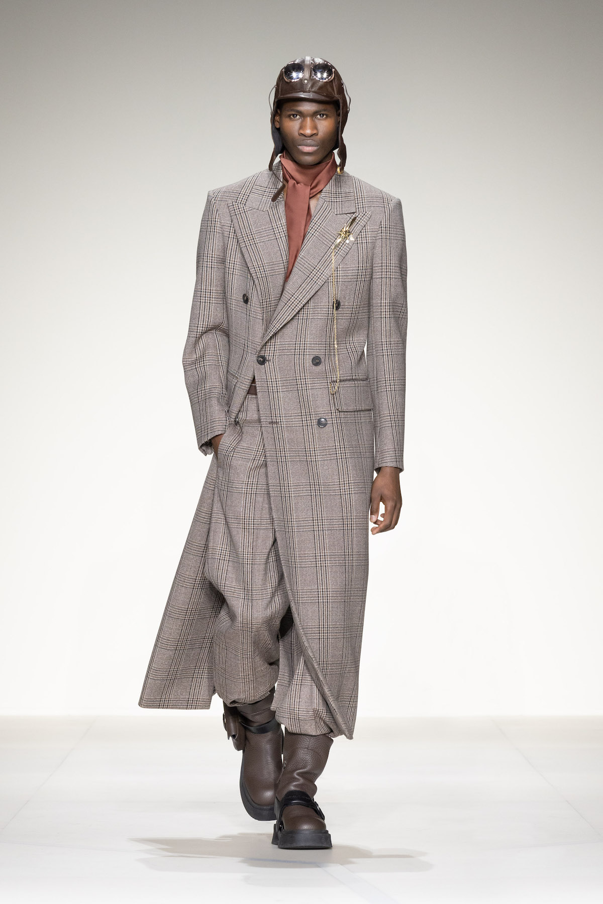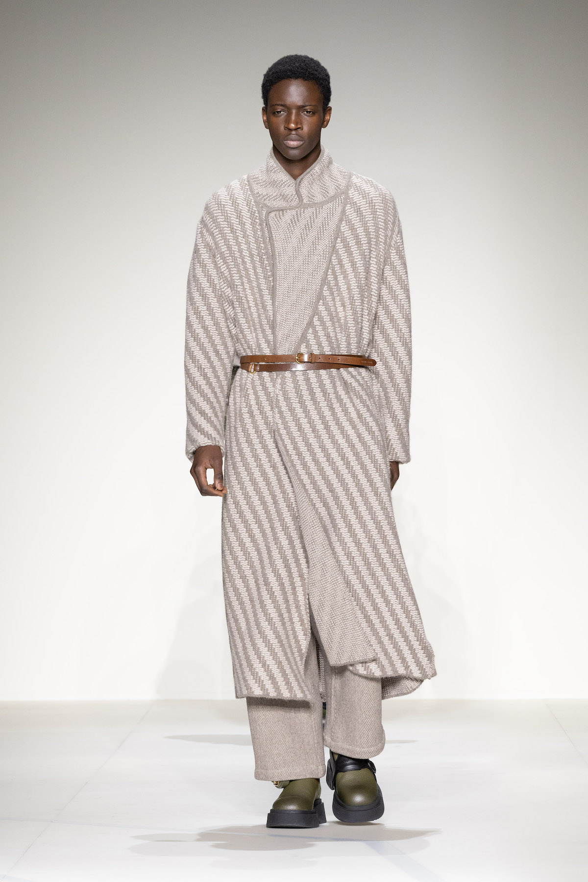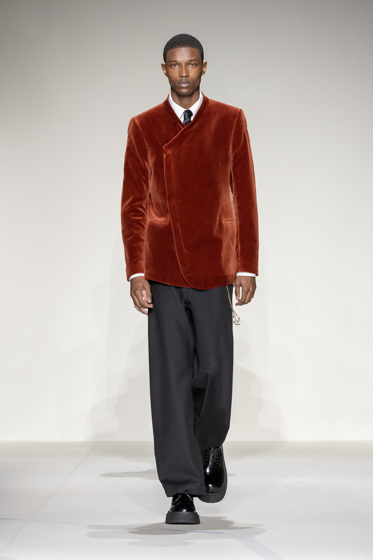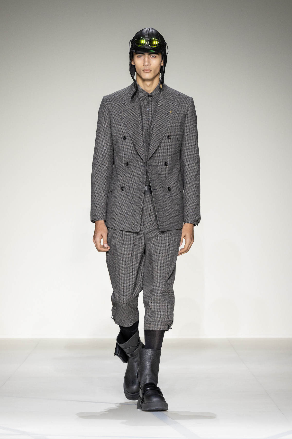 Emporio Armani’s AW23 menswear show was ready for take off. Packed with turbulent tailoring, comfortable cardigans with matching gilets, oversized T-shirts and sleek wool jumpsuits, an air of adventure and boundless elegance emerged as Armani’s men marched around its Via Bergognone rotunda show space. On the floor was a blown-up map of Milan, with the central points marked by a red dot, like an atlas observed from a bird’s eye view. The conceit was clear; aptly named, The View from Above, it was an edit that paid tribute to the 1930s era of aviation.