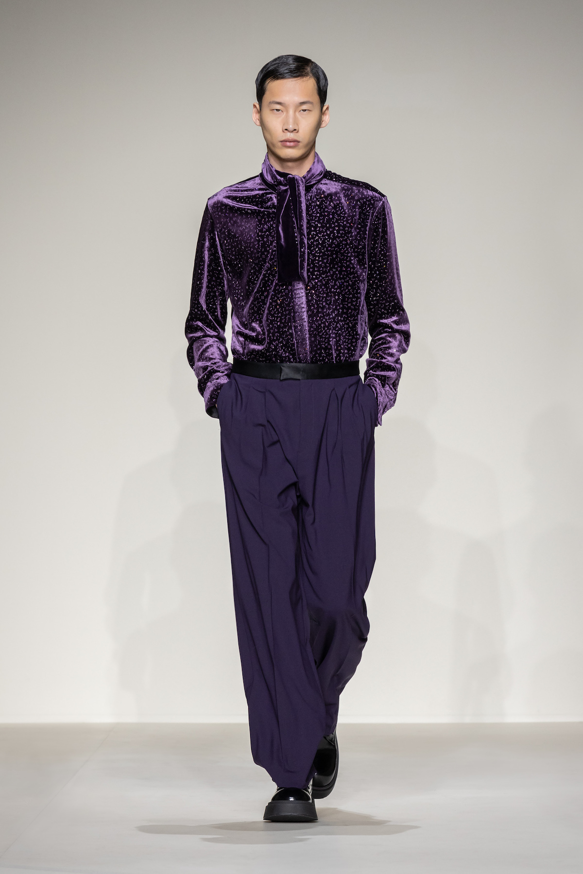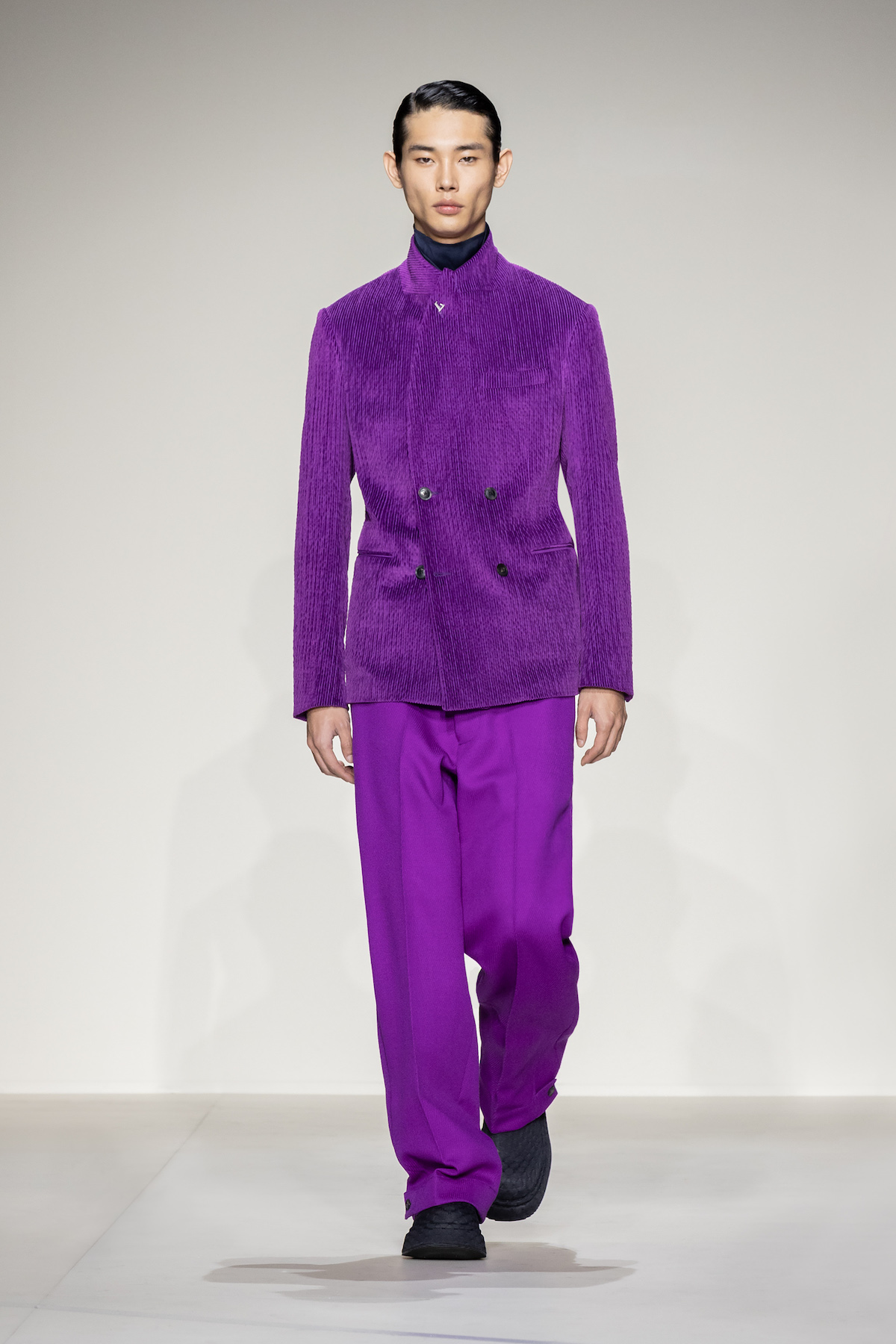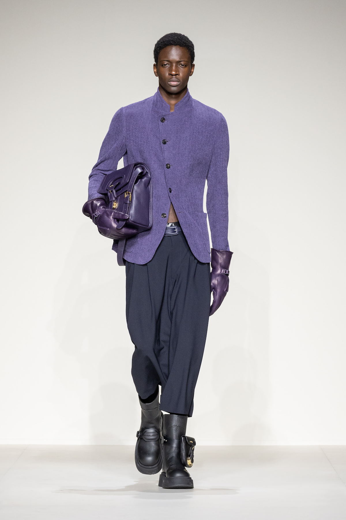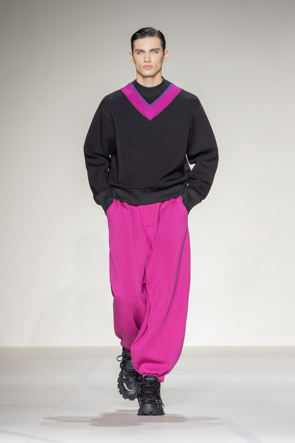Fruity hues of purple, red and geranium pink were juxtaposed by inky blacks, moving the chromatic panorama from neutral ‘greiges’, beiges, caramel and rust to flamboyant flurries and back again. We hope you enjoyed your flight with Emporio Armani airlines, come again soon.