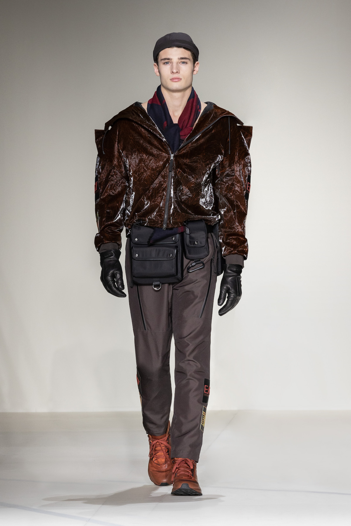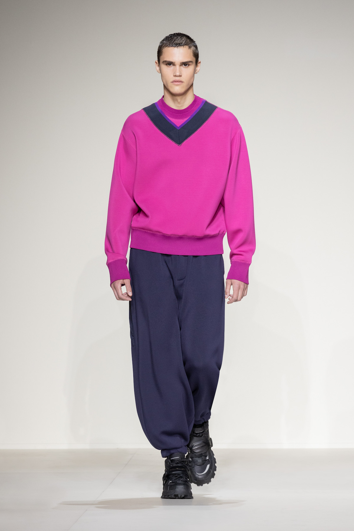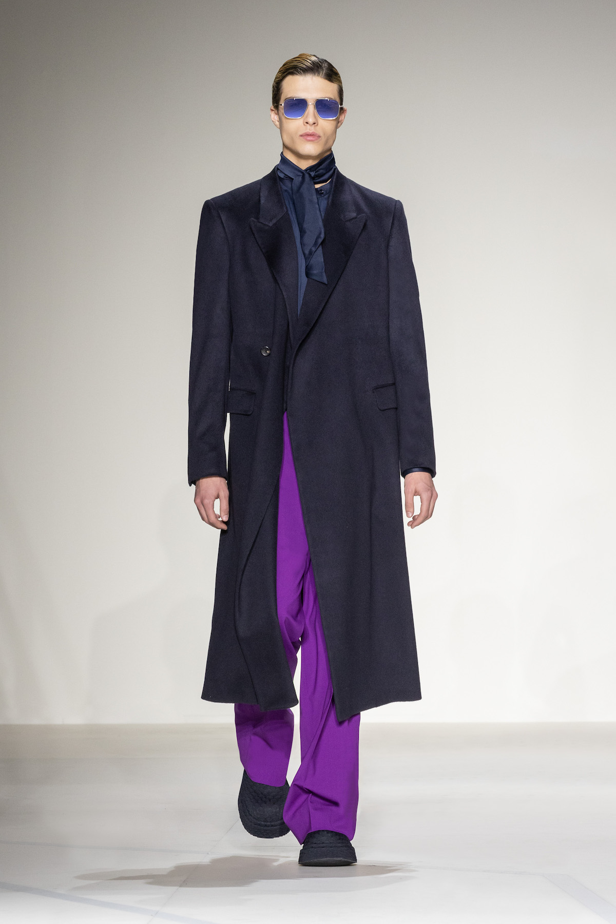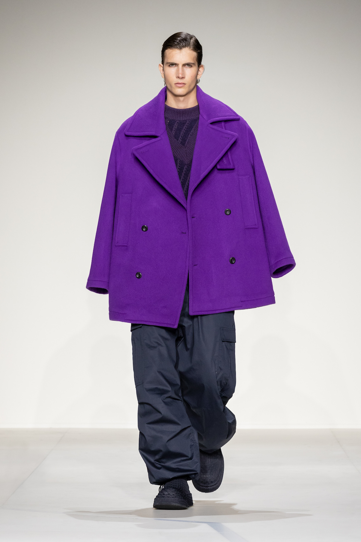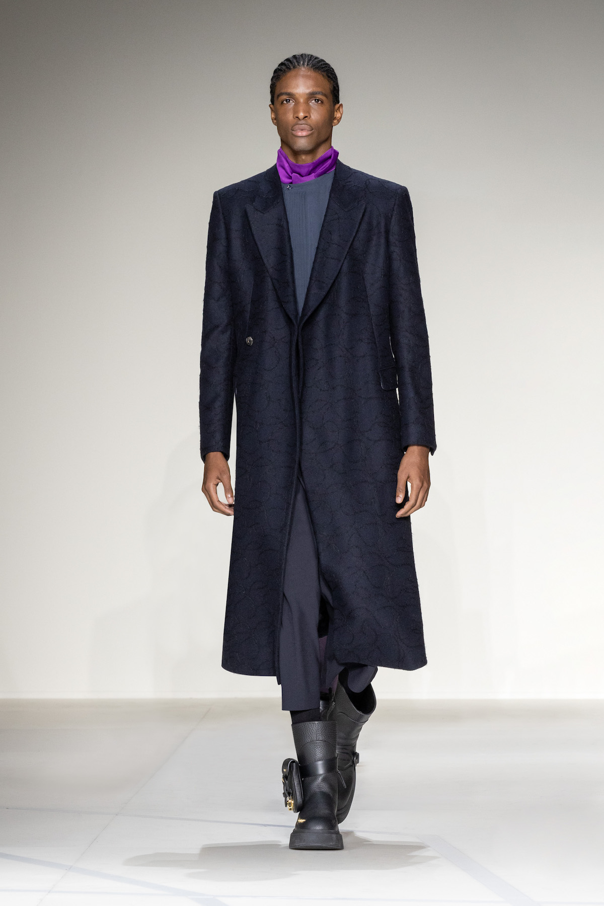 Fruity hues of purple, red and geranium pink were juxtaposed by inky blacks, moving the chromatic panorama from neutral ‘greiges’, beiges, caramel and rust to flamboyant flurries and back again. We hope you enjoyed your flight with Emporio Armani airlines, come again soon.
