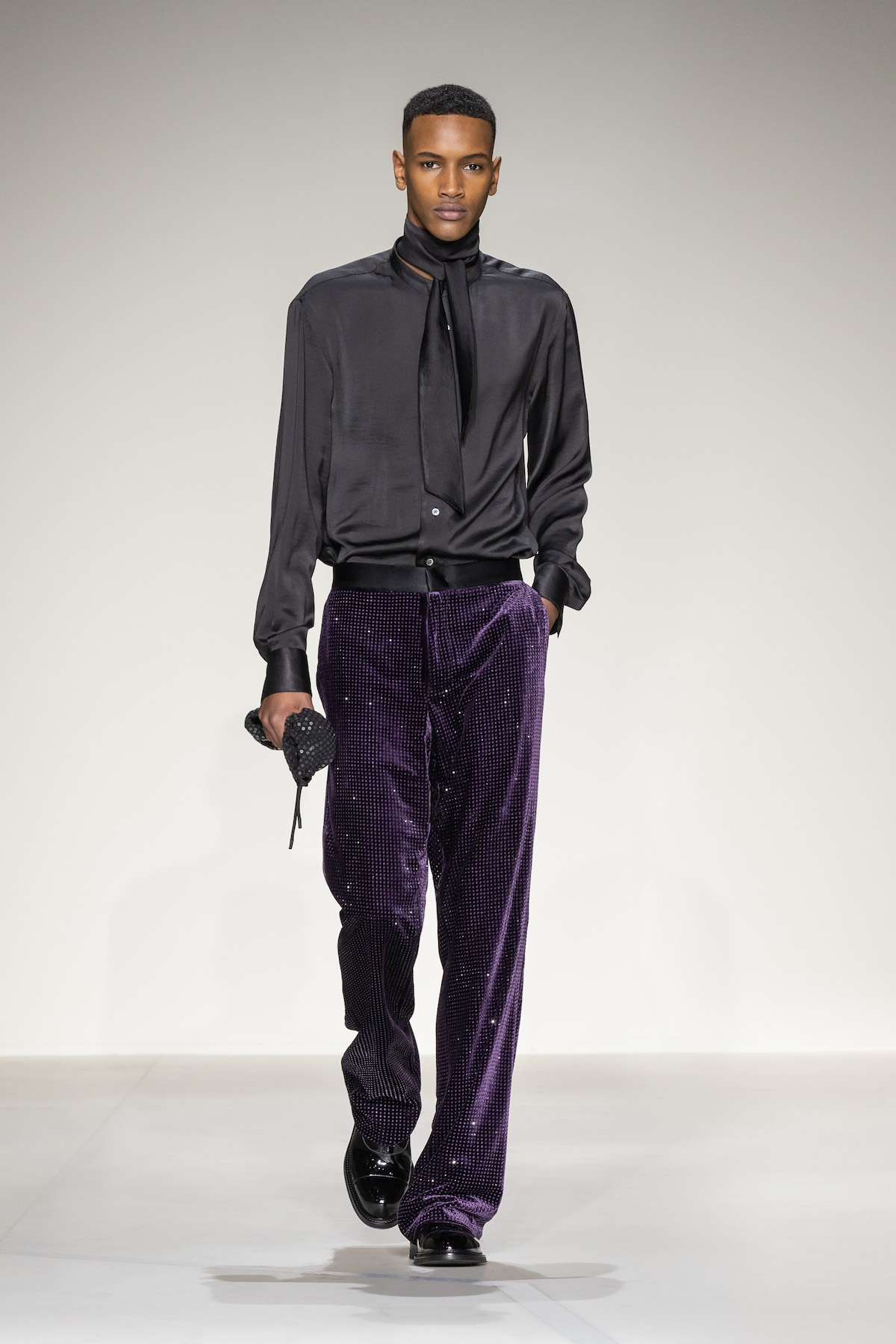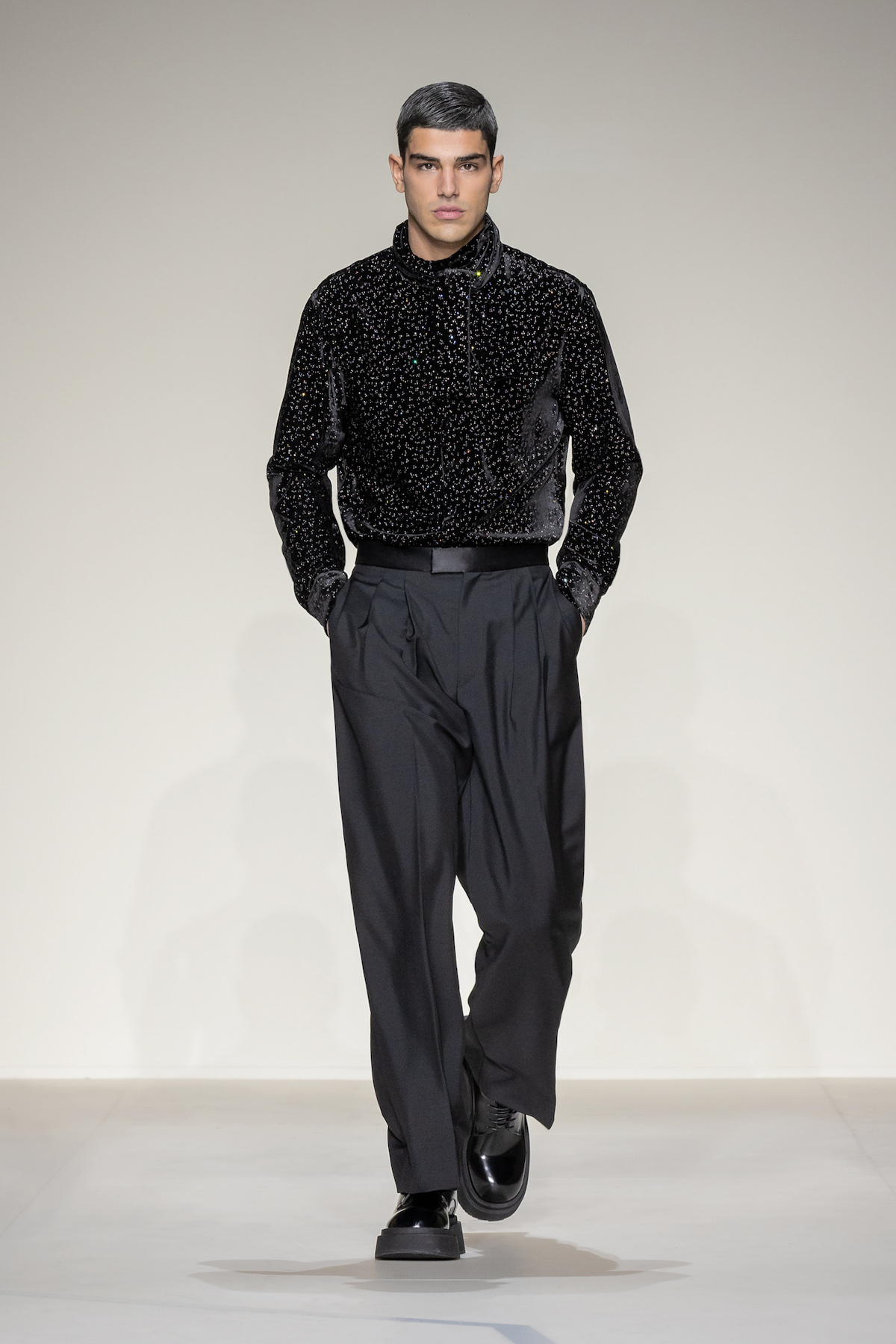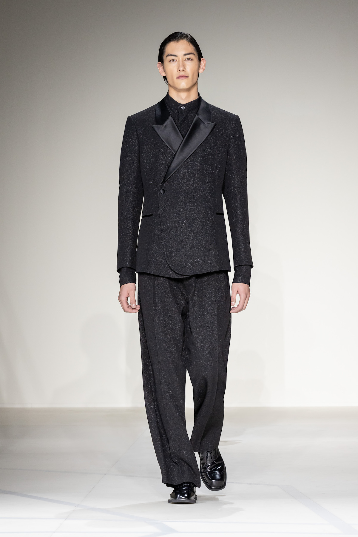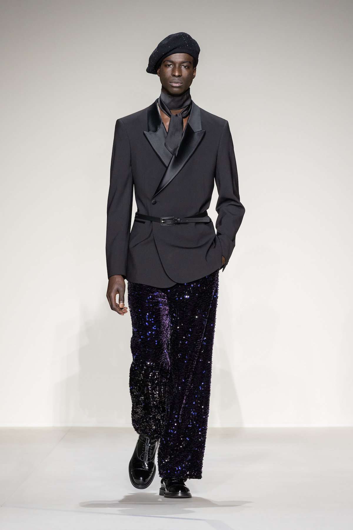 Elsewhere, harnessed all-leather looks took flight, offering us a taste of laid-back rebellion. The suiting, on the other hand, was quintessentially Emporio Armani: exquisite and sophisticated, yet subtly defiant, with a bit of innovation and neo-styling mixed in, and erected in Prince of Wales and houndstooth materials. As a sartorial interpreter of business elegance as well as daily recreation, the suit proposed an amalgamation of wrap-around blazers and baggy pants to reflect the contemporary versatility of the ensemble. Boasting exceptional manual tailoring, there were also lustrous tuxedos in velvet or swathed in sequins and dripping in crystals – perfect for your next black-tie outing.