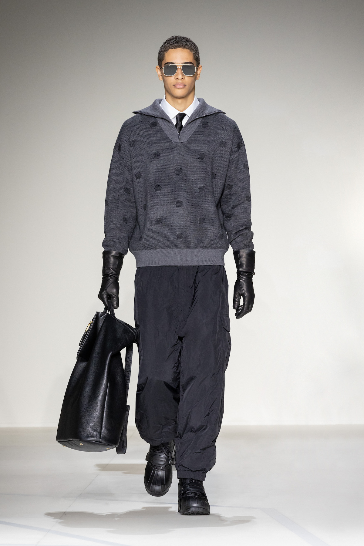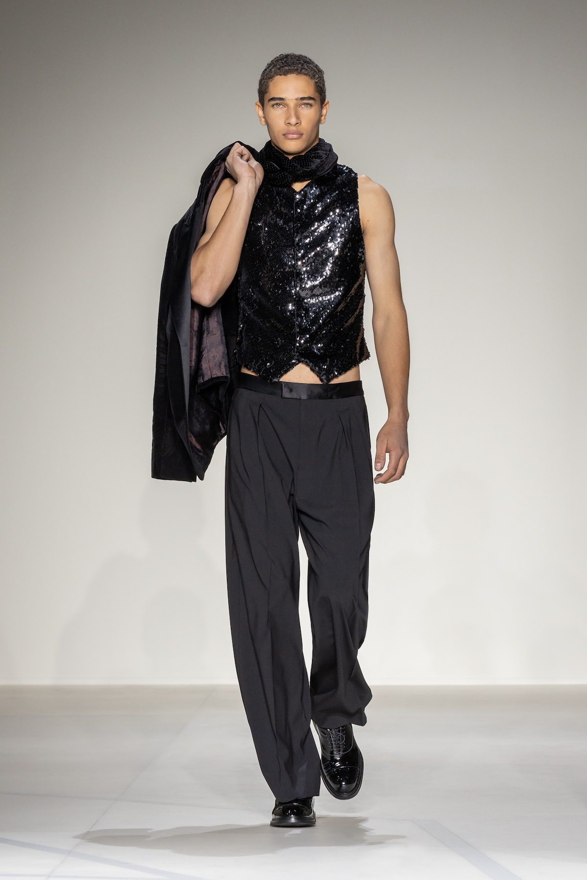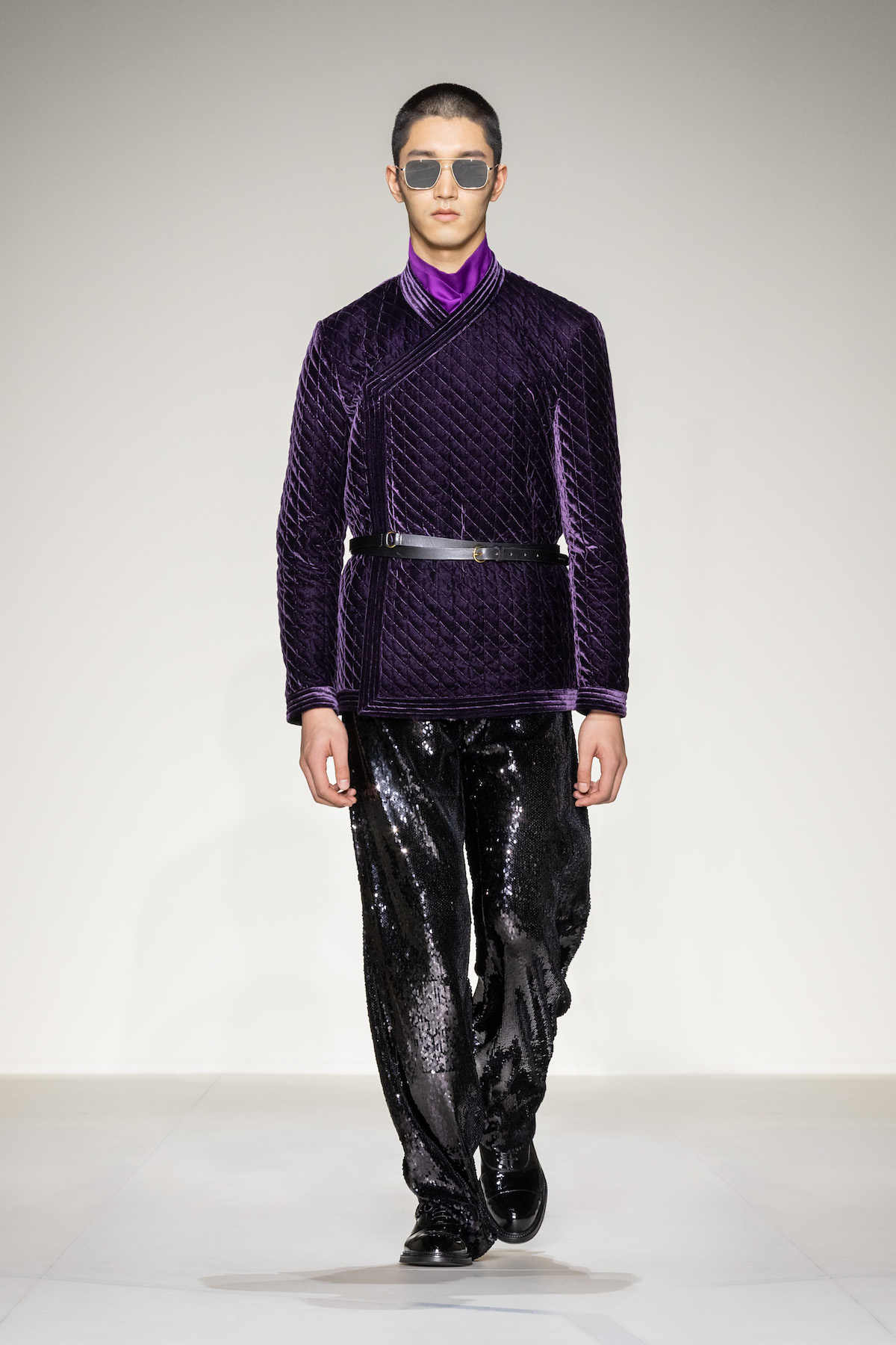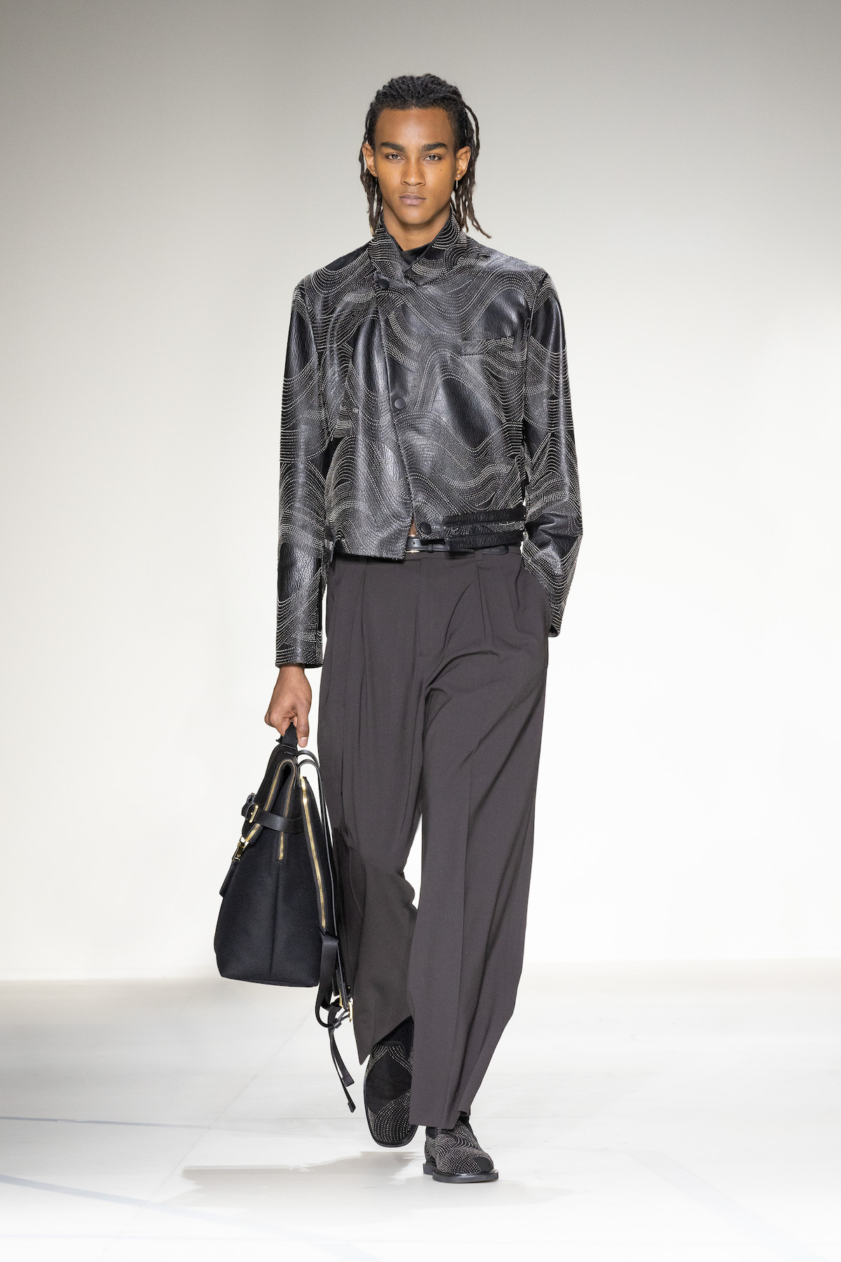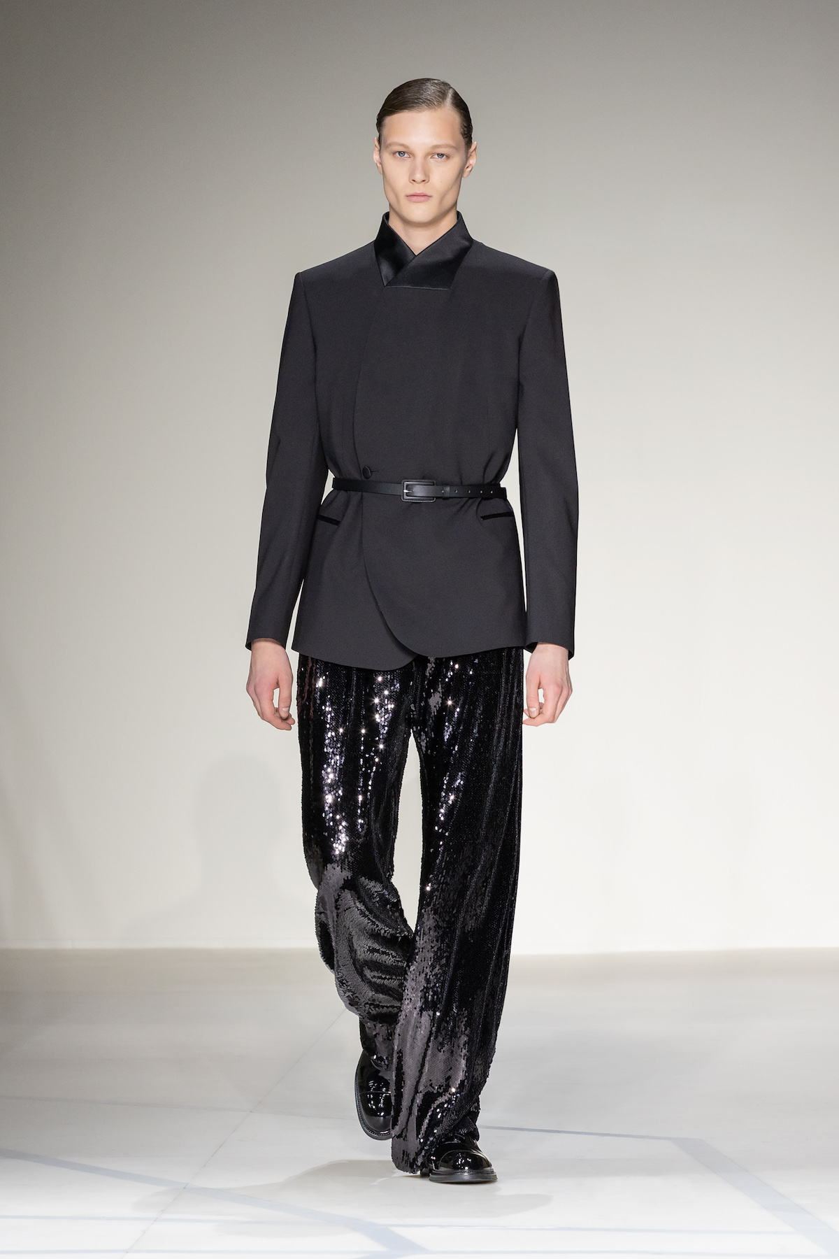 Elsewhere, harnessed all-leather looks took flight, offering us a taste of laid-back rebellion. The suiting, on the other hand, was quintessentially Emporio Armani: exquisite and sophisticated, yet subtly defiant, with a bit of innovation and neo-styling mixed in, and erected in Prince of Wales and houndstooth materials. As a sartorial interpreter of business elegance as well as daily recreation, the suit proposed an amalgamation of wrap-around blazers and baggy pants to reflect the contemporary versatility of the ensemble. Boasting exceptional manual tailoring, there were also lustrous tuxedos in velvet or swathed in sequins and dripping in crystals – perfect for your next black-tie outing.