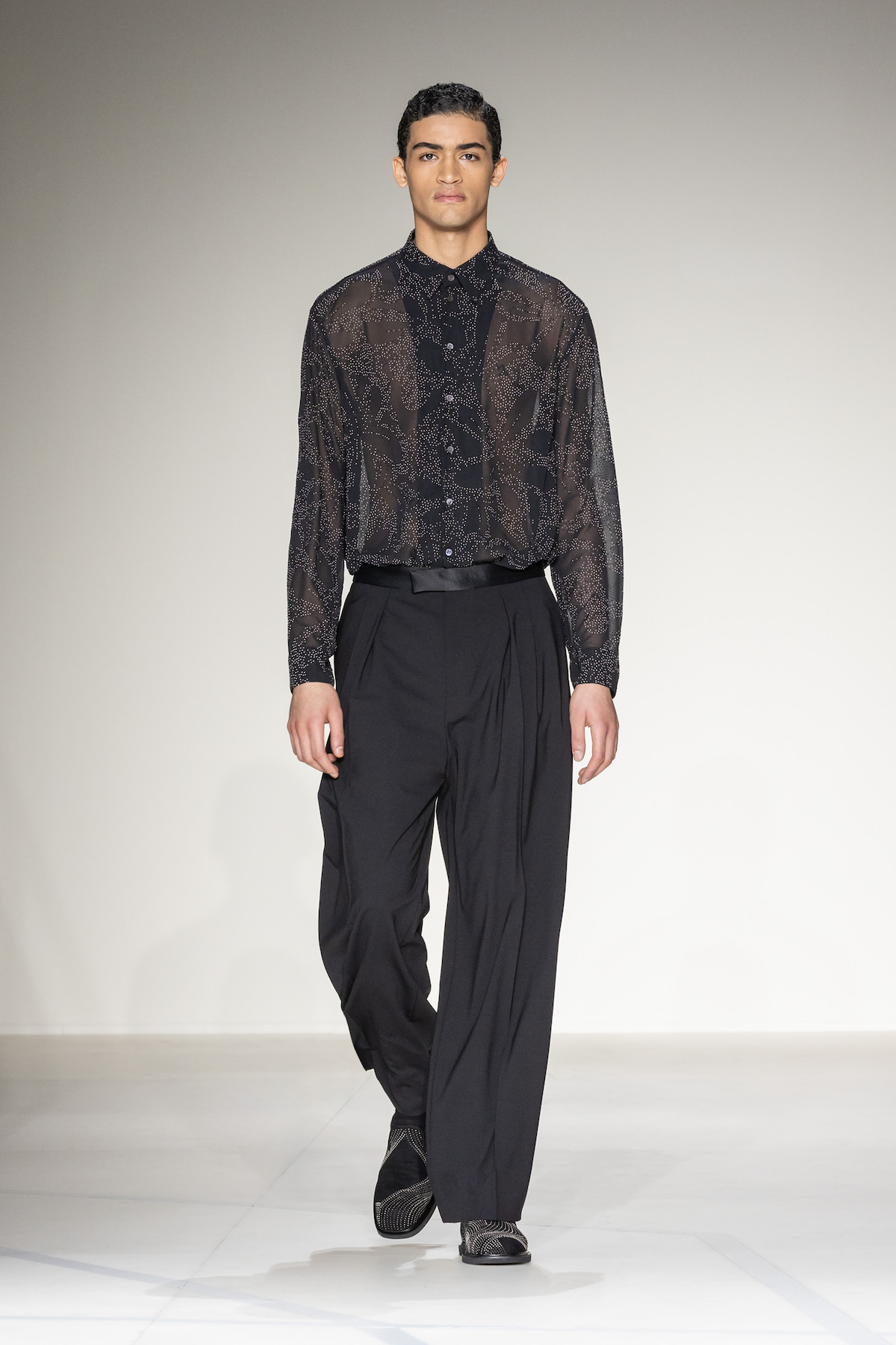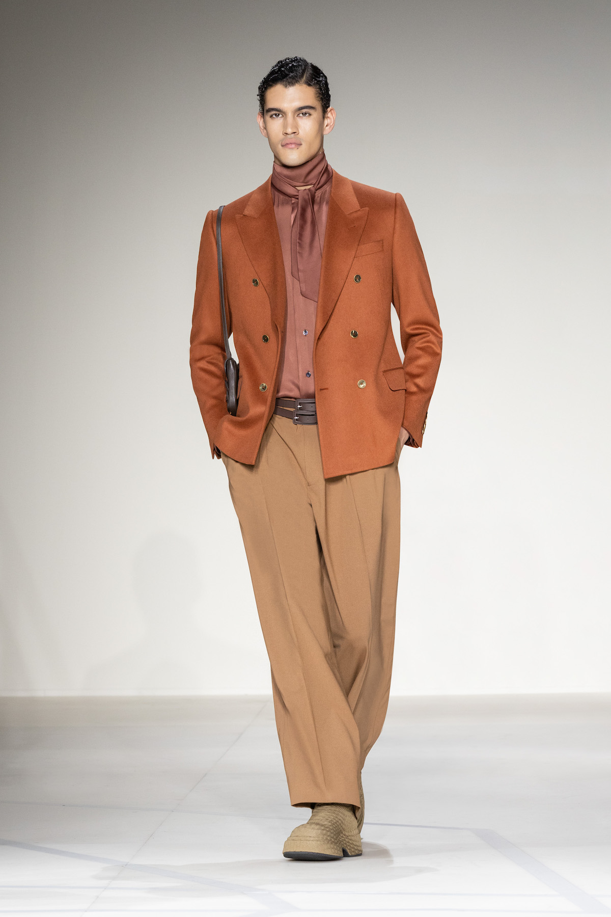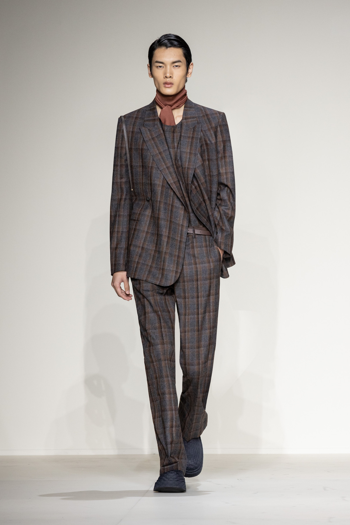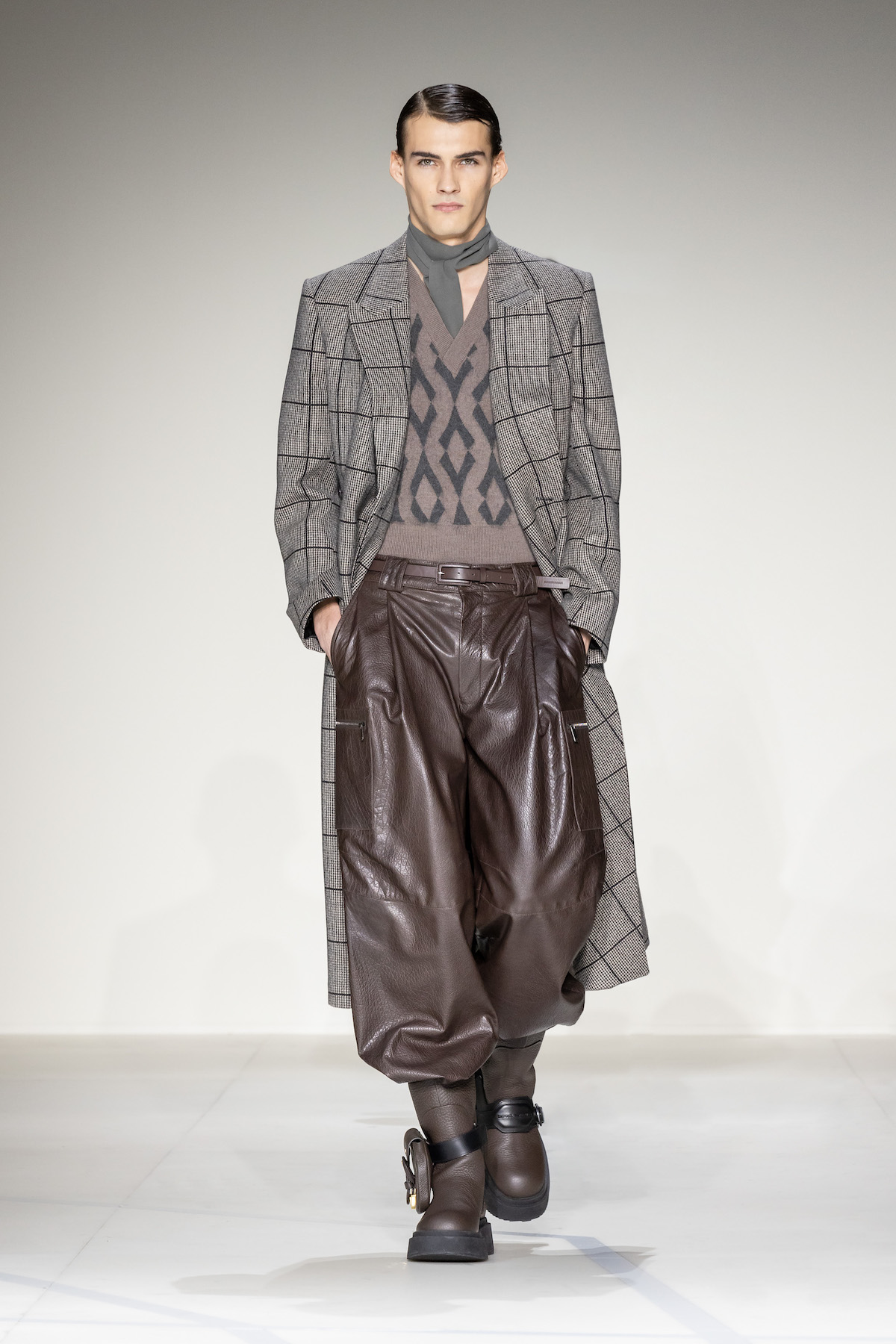 Elsewhere, harnessed all-leather looks took flight, offering us a taste of laid-back rebellion. The suiting, on the other hand, was quintessentially Emporio Armani: exquisite and sophisticated, yet subtly defiant, with a bit of innovation and neo-styling mixed in, and erected in Prince of Wales and houndstooth materials. As a sartorial interpreter of business elegance as well as daily recreation, the suit proposed an amalgamation of wrap-around blazers and baggy pants to reflect the contemporary versatility of the ensemble. Boasting exceptional manual tailoring, there were also lustrous tuxedos in velvet or swathed in sequins and dripping in crystals – perfect for your next black-tie outing.