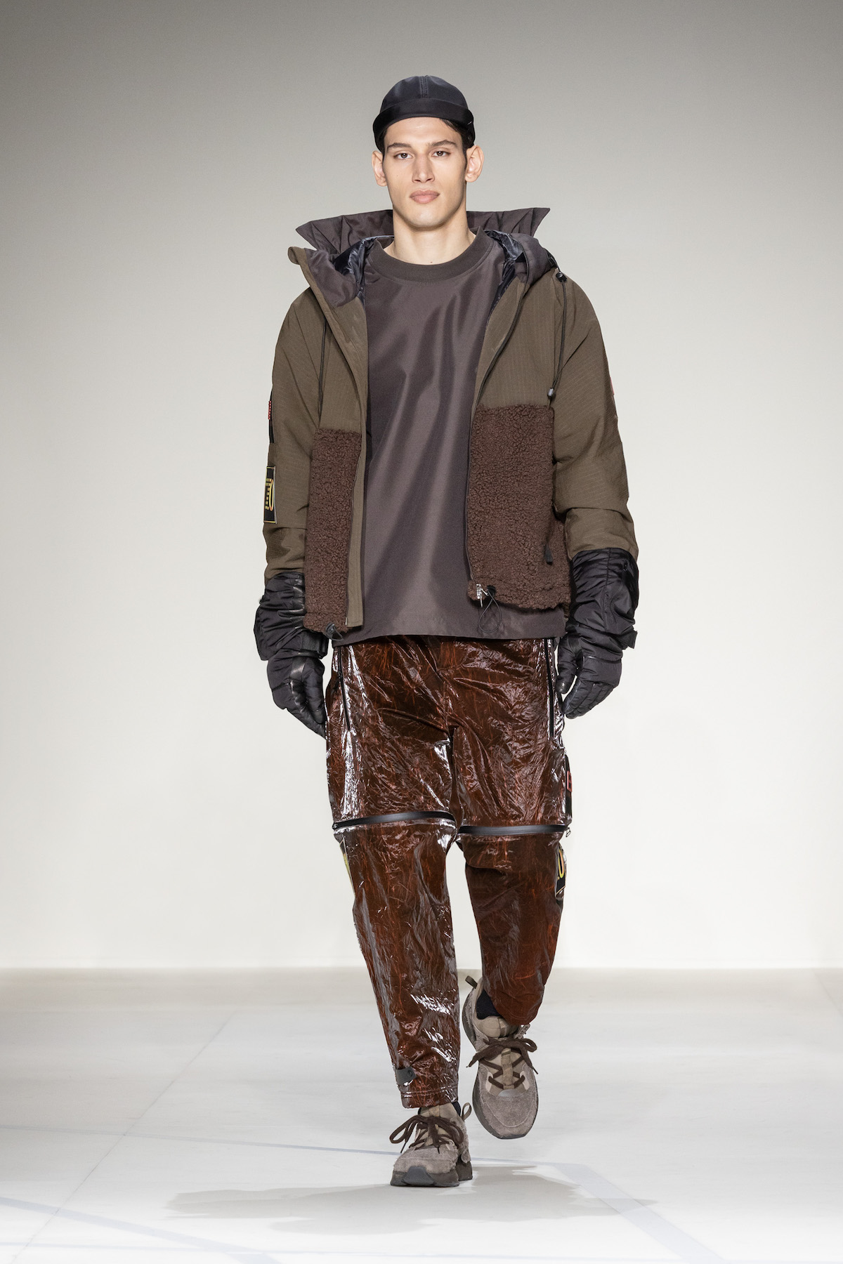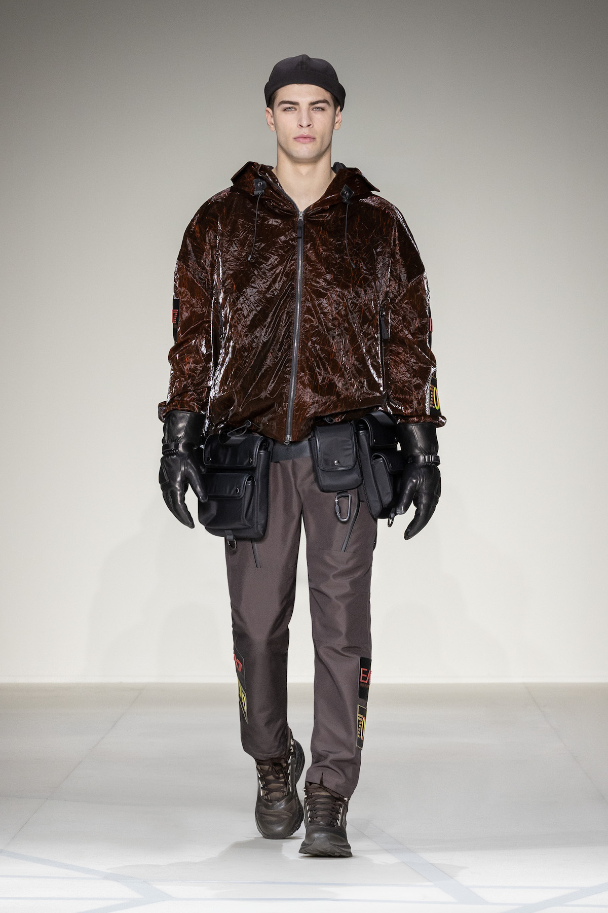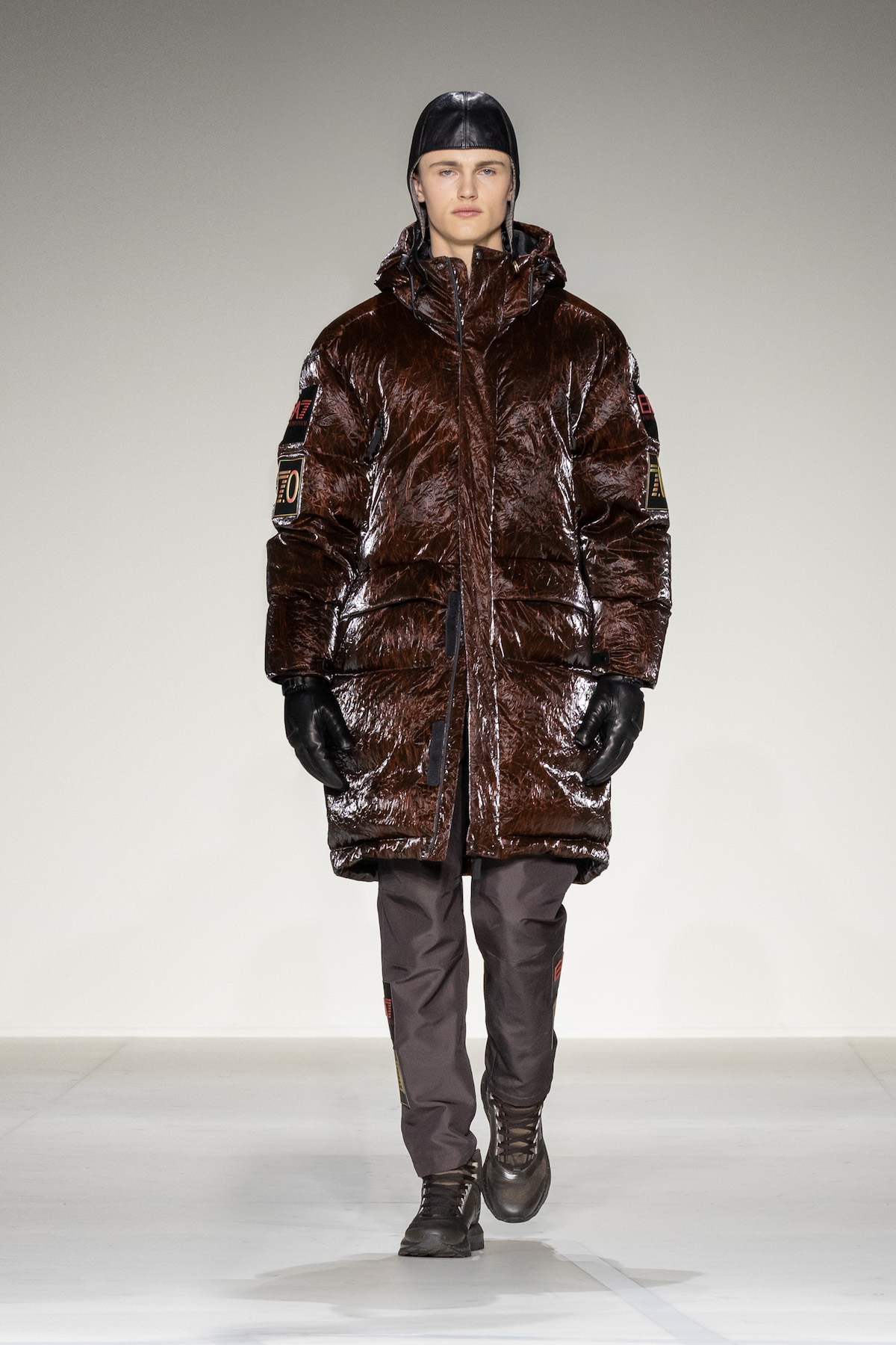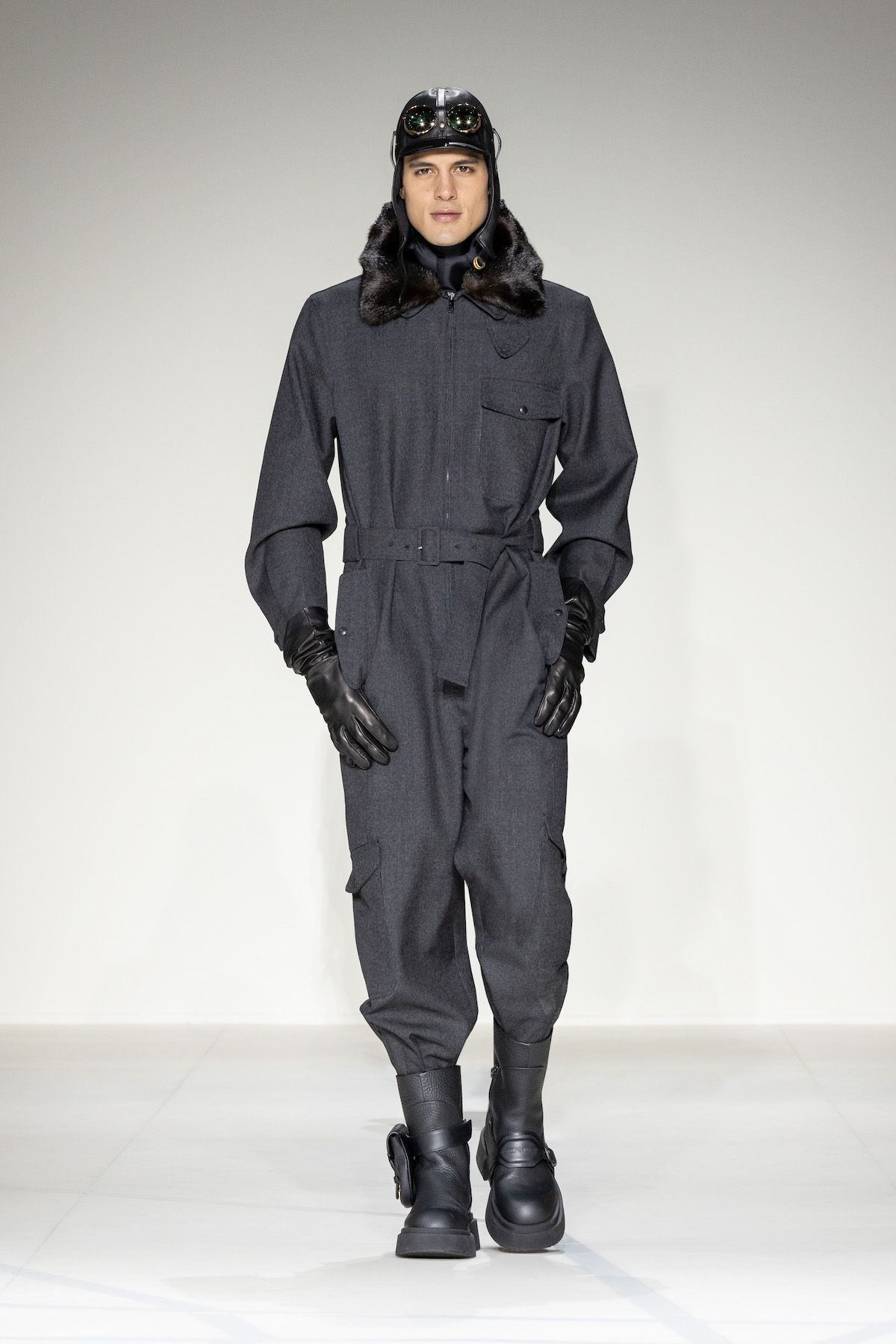 Akin to Mr. Armani’s recognisable style, a refined yet relaxed style emerged with precious, now-and-forever garments to effortlessly enrich the everyday and the evening alike. Unfolding at first with a firm proposal of wool coats, trench coats, double-breasted pea coats, vintage-style blouson bombers and flowing faux-fur lined outerwear worn with straight cropped trousers. This was followed by an athletic EA7 interlude. Altitude achieved, goggle-like sunglasses perched on old-fashioned aviator caps bacame the nucleus of the collection, while metallic glints were reminiscent of aeroplanes and their hangars.