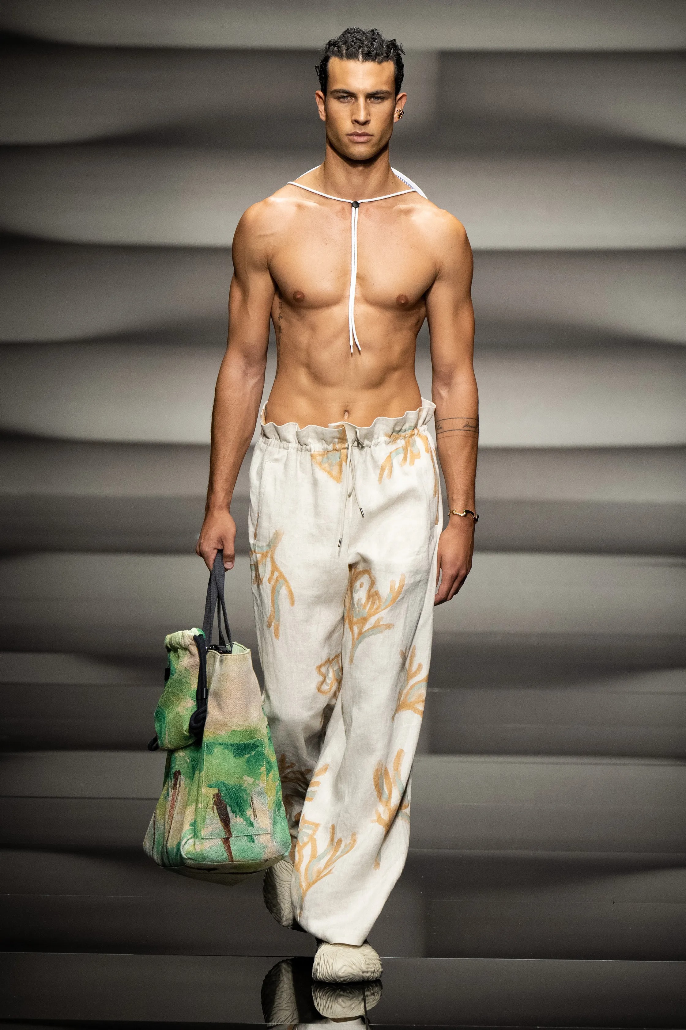 Amongst the 93 looks were jacquard blazers and black-tie tuxedos, which walked alongside easy-going, pinstripe tunic tops, wide-leg trousers slashed open at the thigh and hoodies laden with painterly brush strokes in signature Armani blues. A section EA7 sportswear – double zip track jackets, mesh vests, navy track shorts – made way for hedonistic shades of lime green and pistachio across carefree summer tailoring, ideal for open air parties and sunkissed cocktail hours at the beach.