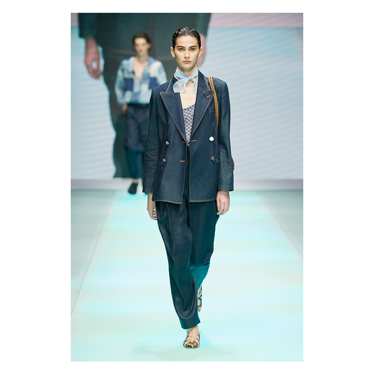 On display are choice pieces from the archive and what’s striking is how timeless it all feels. The show itself encapsulated that transcendent Armani spirit. First, there was a highlights reel showing 40 years of EA fashion moments. Then the models walked against a huge, widescreen cinematic backdrop, in the latest iterations of Armani’s signature nonchalant elegance. First out was the denim that the brand is built on (in 1981, sensing that it would open his brand up to a huge global fan base, Armani was a pioneer or designer denim). There was plenty of his soft unstructured tailoring, sheer layers and sporty attitude – everything had the lightness of touch that marks the brand.