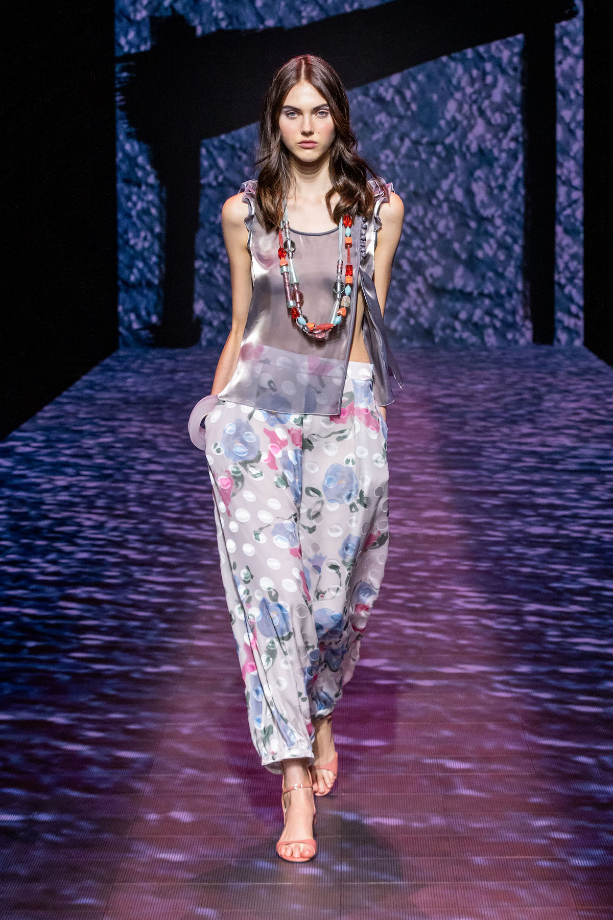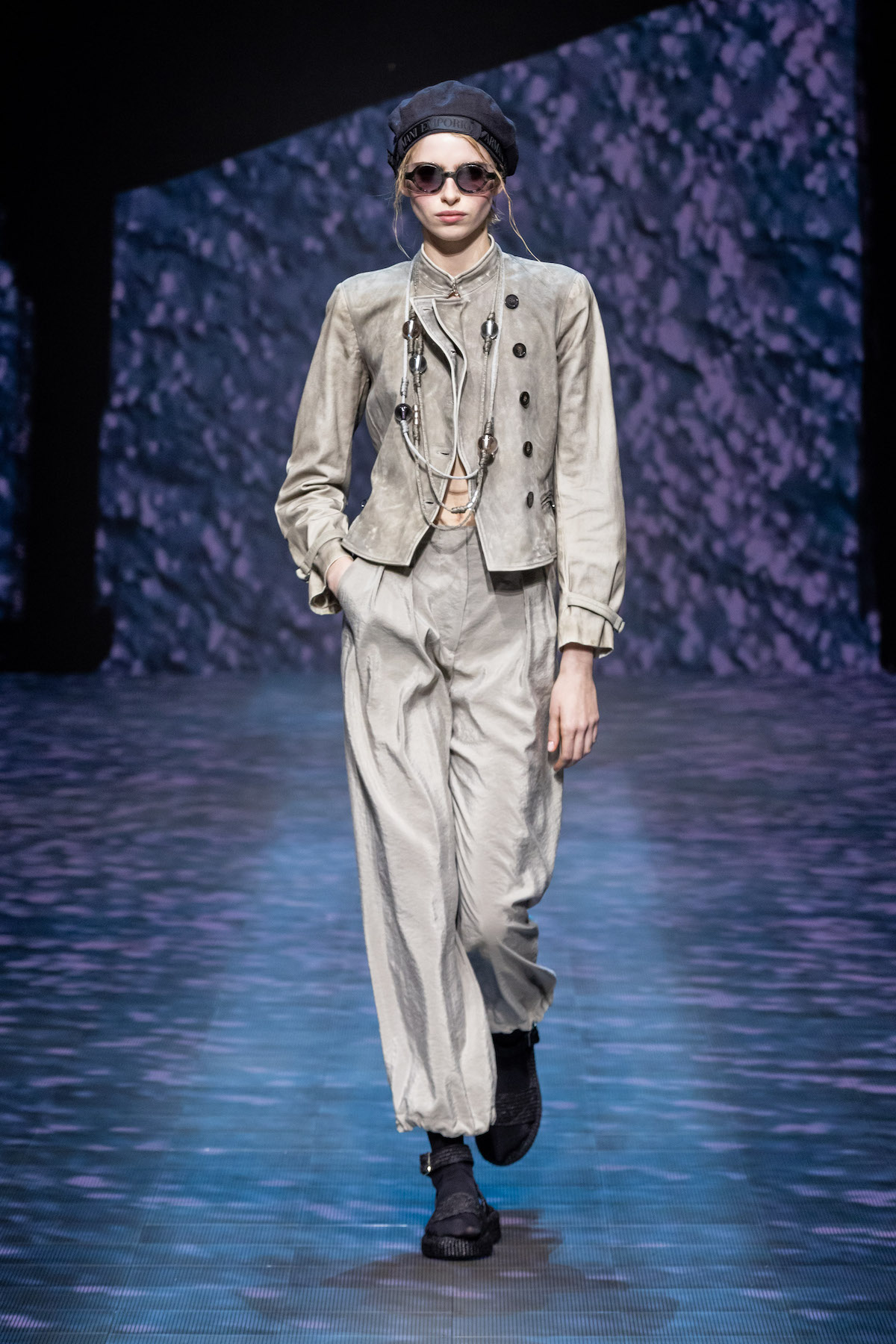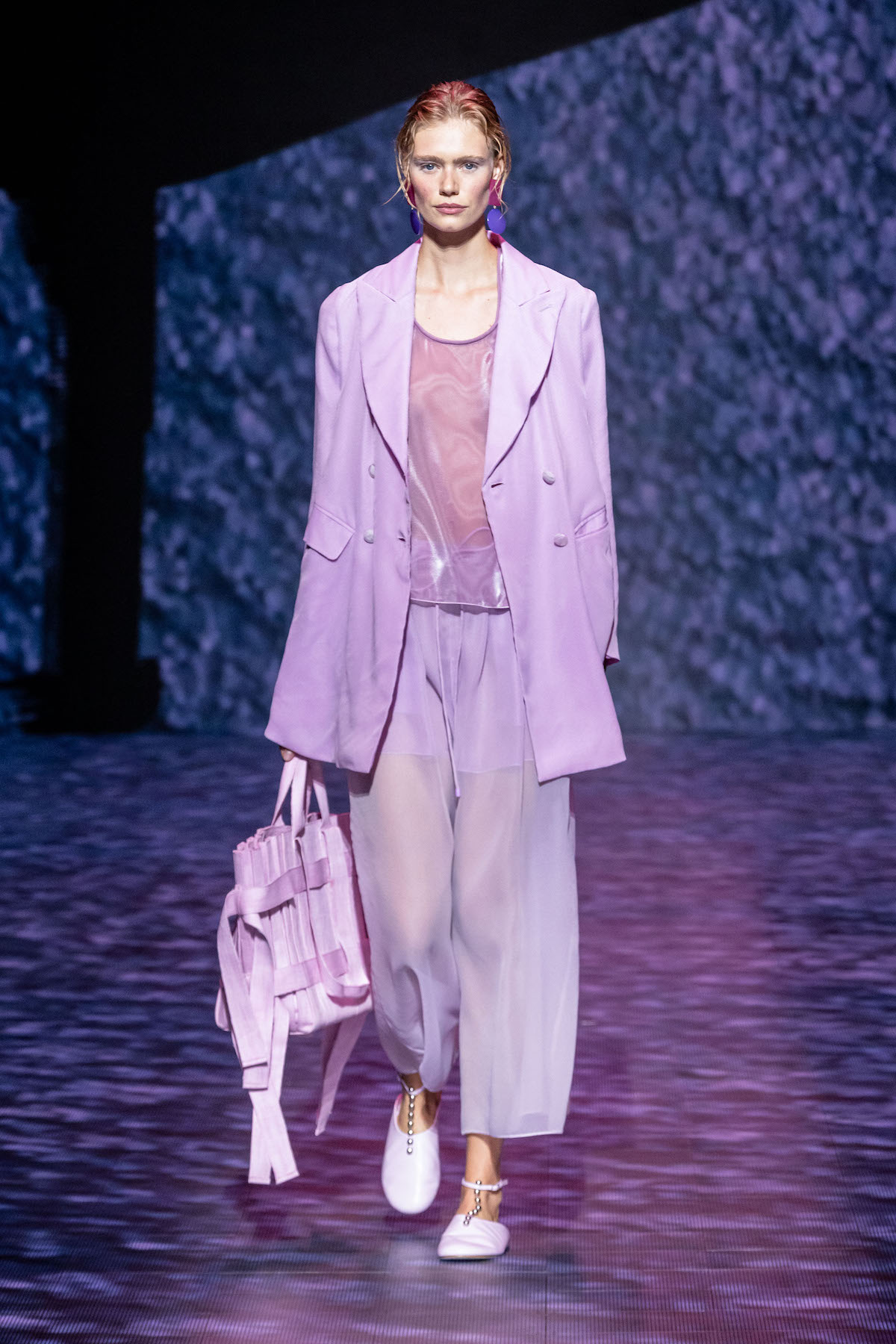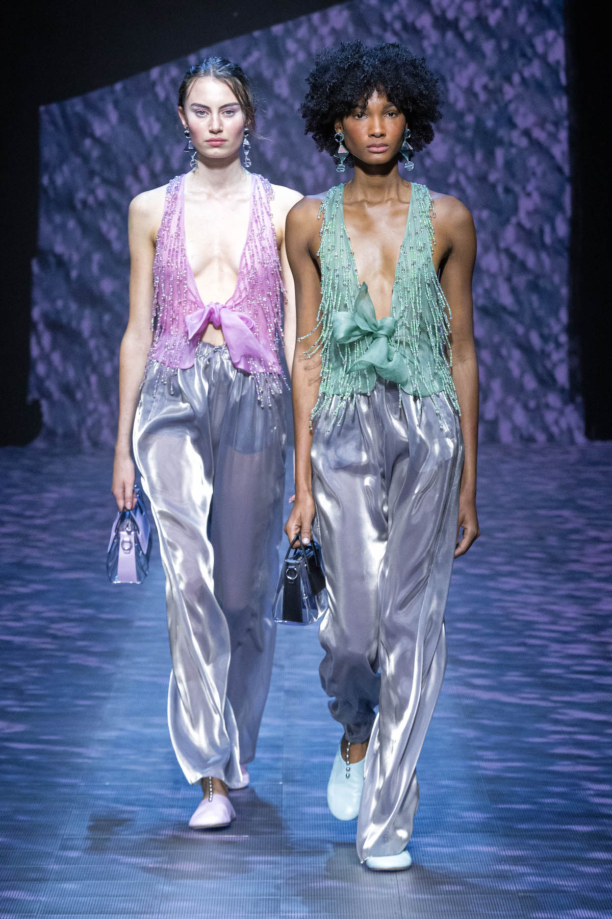 The ease of the classic Emporio Armani androgyny came through on loose silk suiting, with pea coats and duster coats in liquid shades of the EA rainbow: sweet pinks, seawater greens and morning sky blues. This was a melting pot of international inspiration, a look for every destination for the well-travelled Armand woman. She’s in her element, in a state of flow.