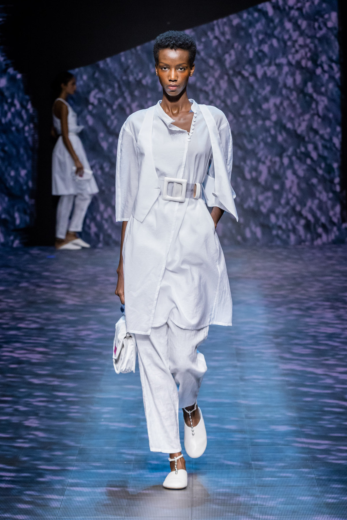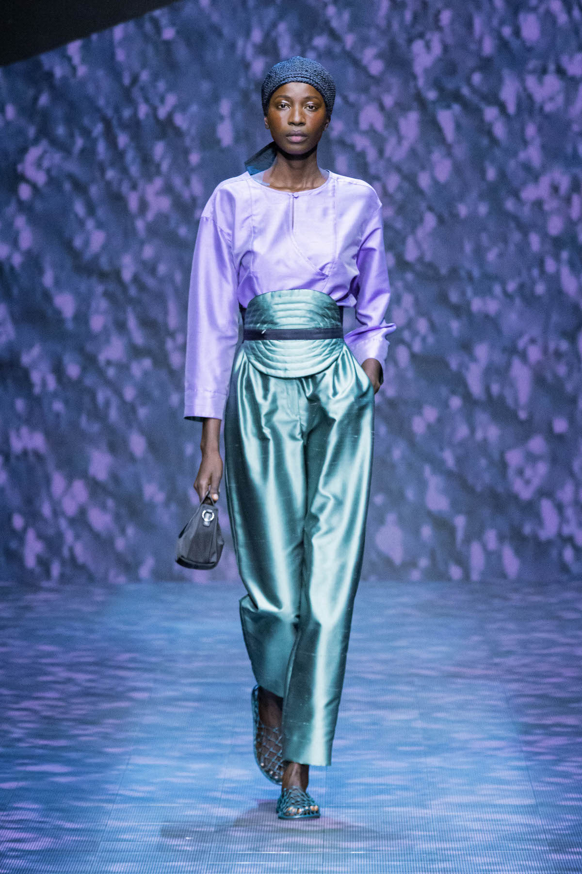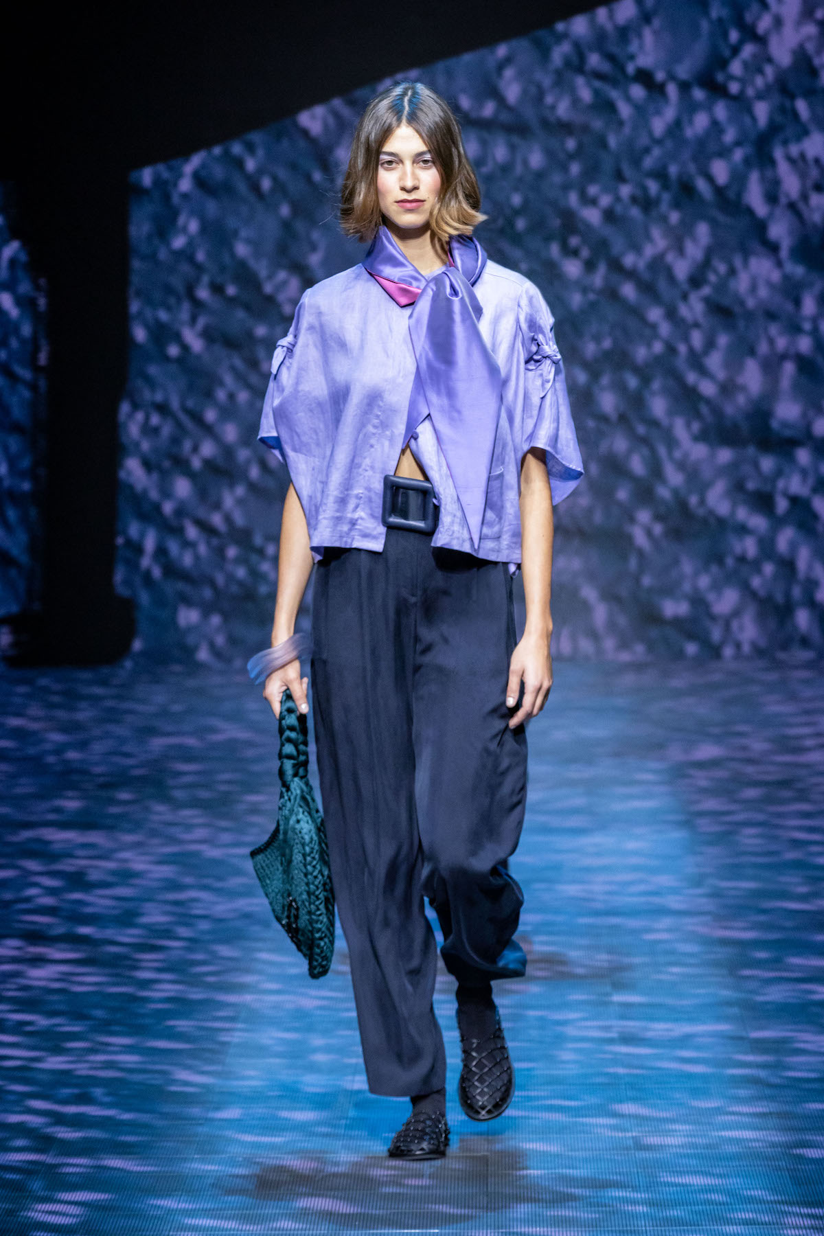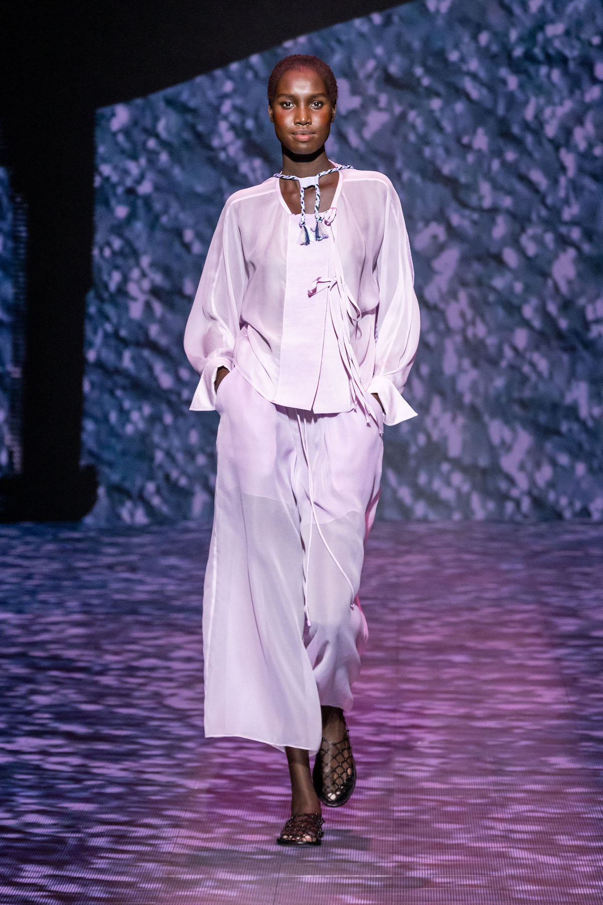 The ease of the classic Emporio Armani androgyny came through on loose silk suiting, with pea coats and duster coats in liquid shades of the EA rainbow: sweet pinks, seawater greens and morning sky blues. This was a melting pot of international inspiration, a look for every destination for the well-travelled Armand woman. She’s in her element, in a state of flow.