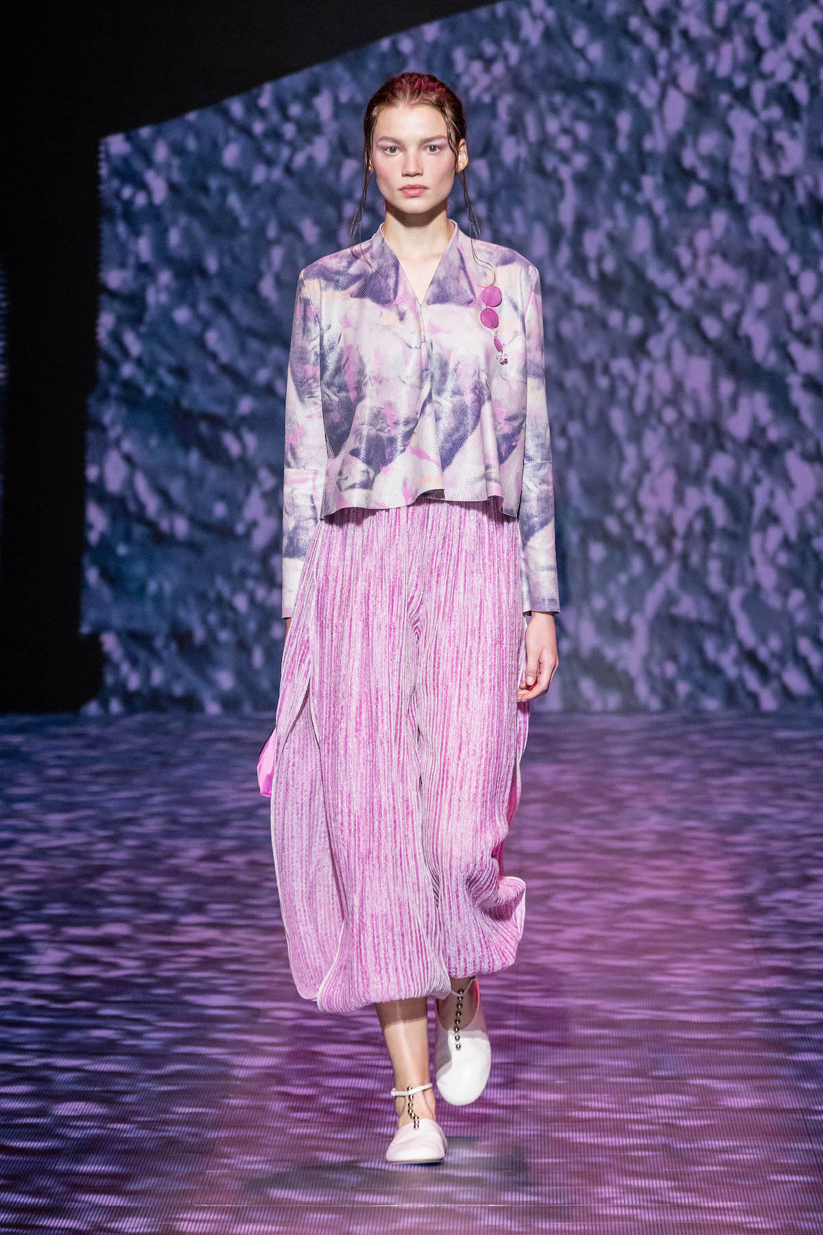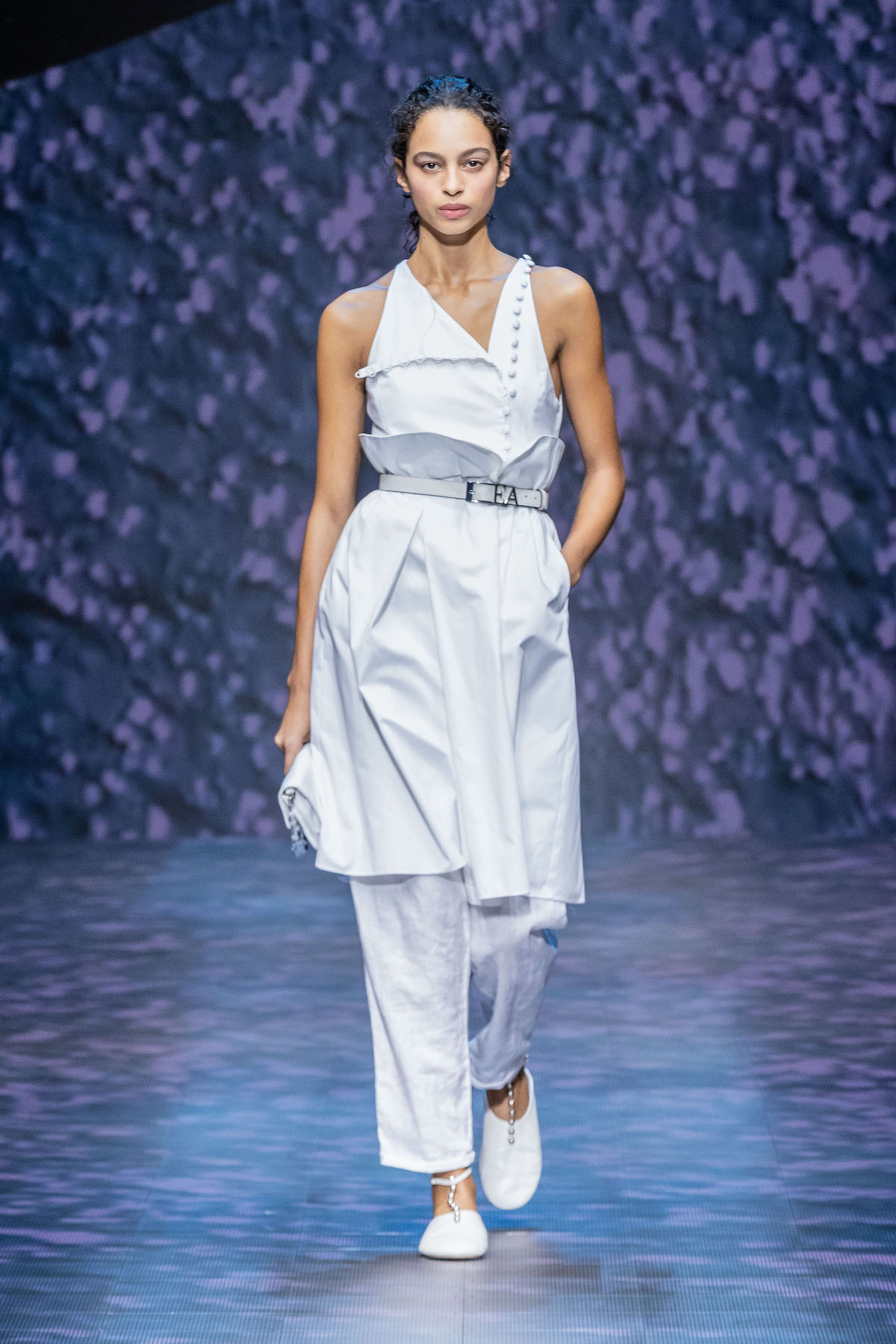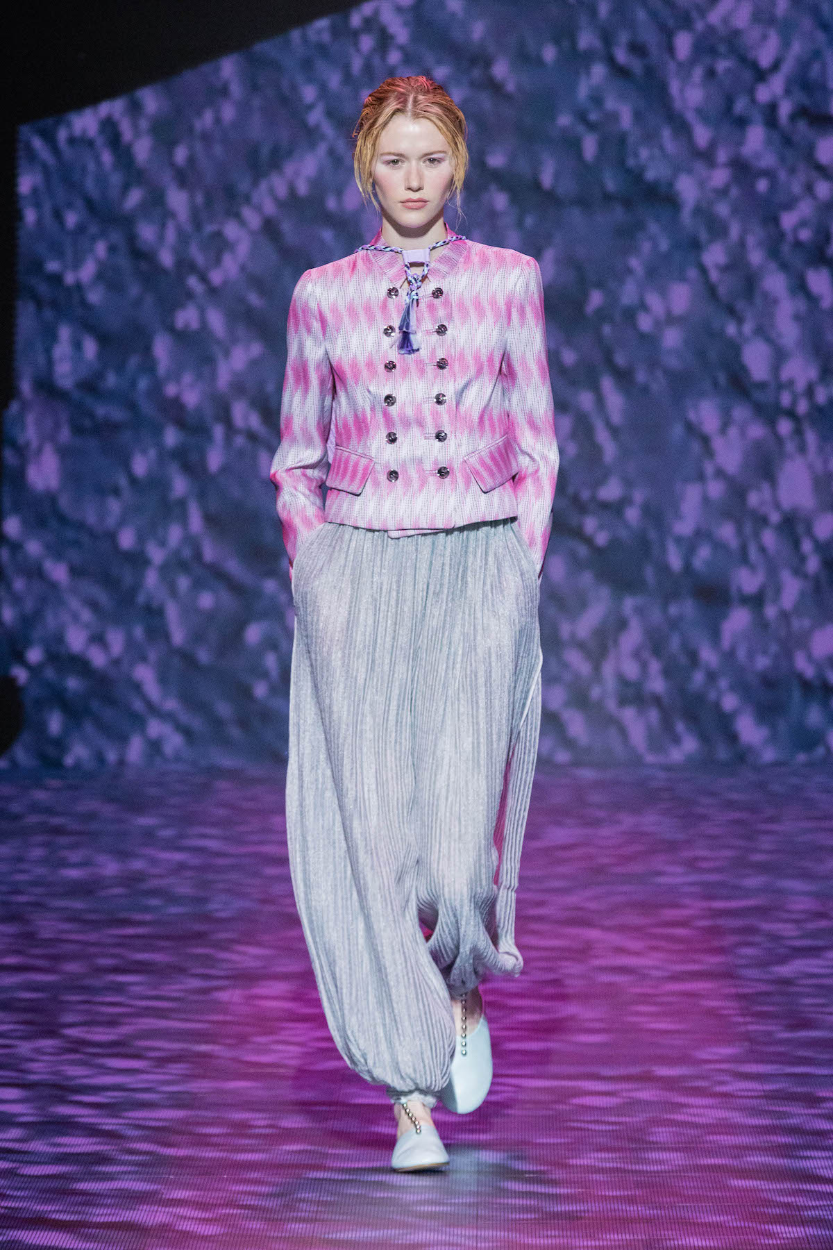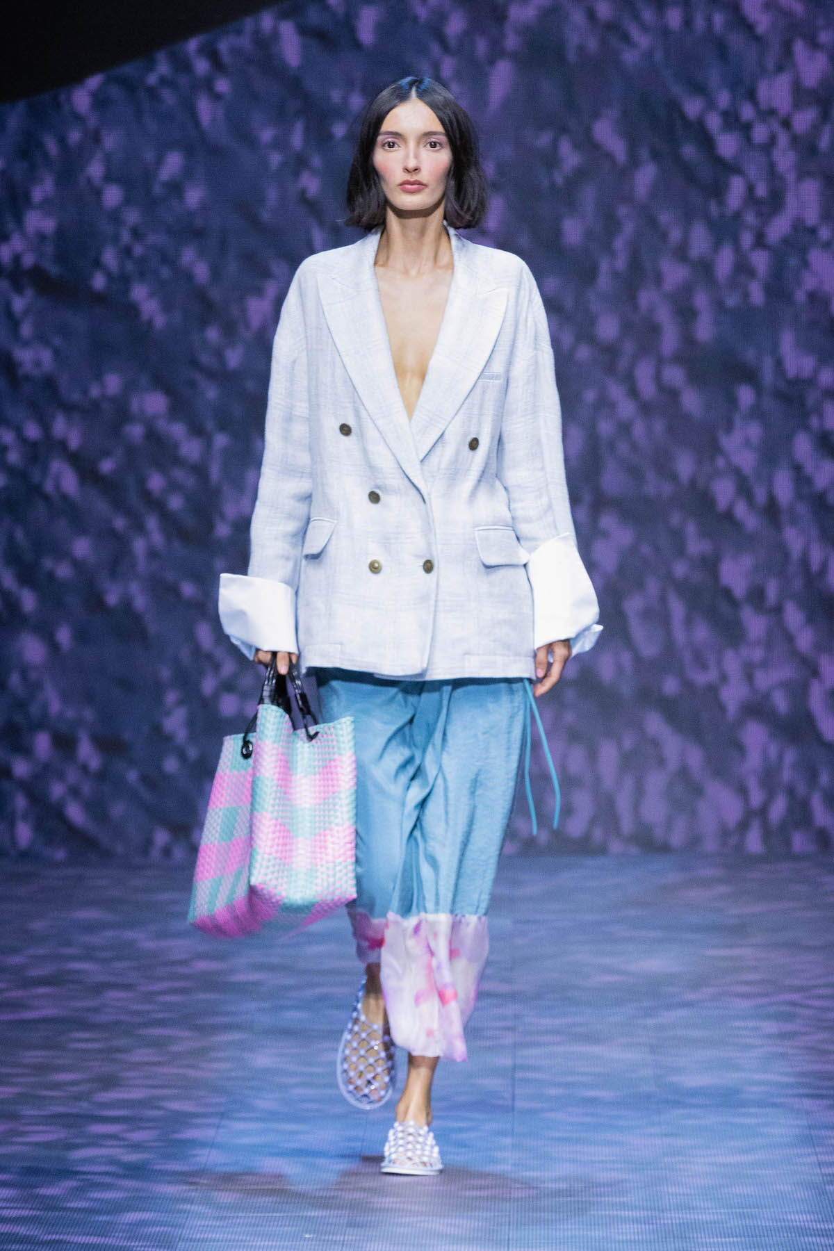 The ease of the classic Emporio Armani androgyny came through on loose silk suiting, with pea coats and duster coats in liquid shades of the EA rainbow: sweet pinks, seawater greens and morning sky blues. This was a melting pot of international inspiration, a look for every destination for the well-travelled Armand woman. She’s in her element, in a state of flow.