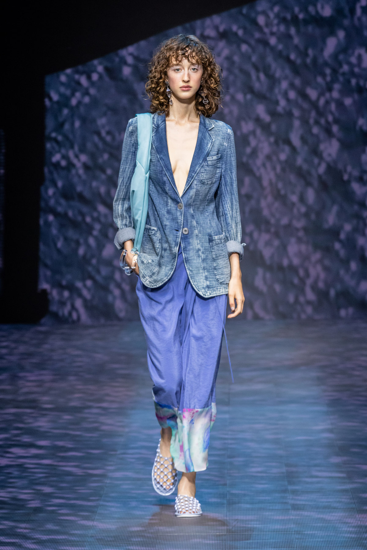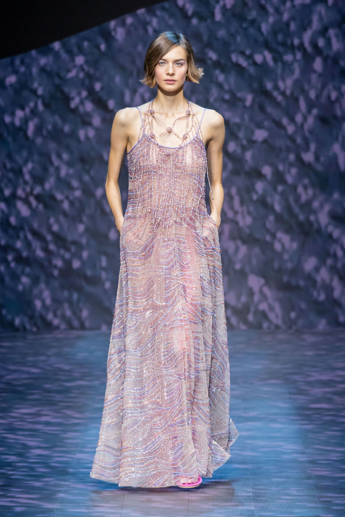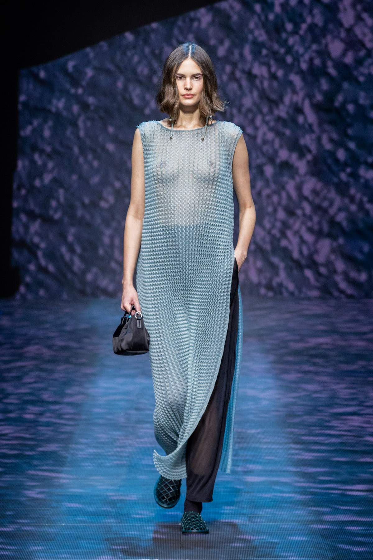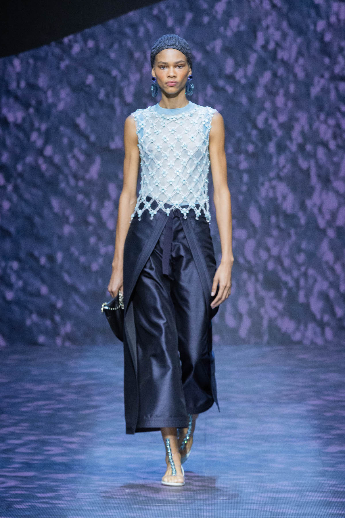 The Emporio Armani woman lives a life of ultimate luxury and this season, she’s back in the air, on the move. For spring/summer 23, sunlight danced on top of the ocean projection that rippled down the runway as the EA women came flowing freely in soft pastel shades of cool. The Armani woman was on cloud nine, zen and blissed out. The collection celebrated the lightness of being as the models glided in the finest subtly sparkling dresses that swished around their ankles, some with delicately embroidered flowers that made us think of Monet’s garden.