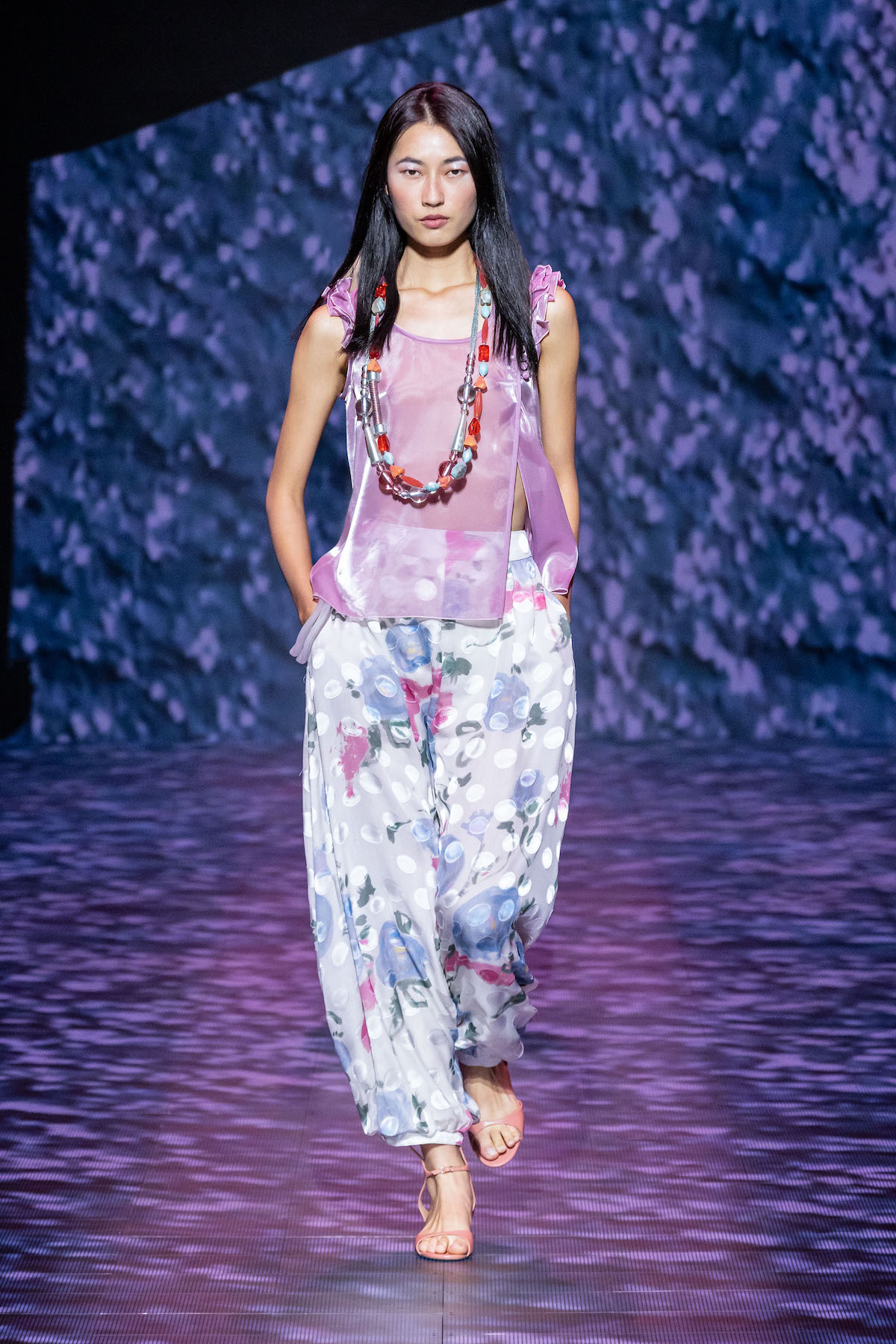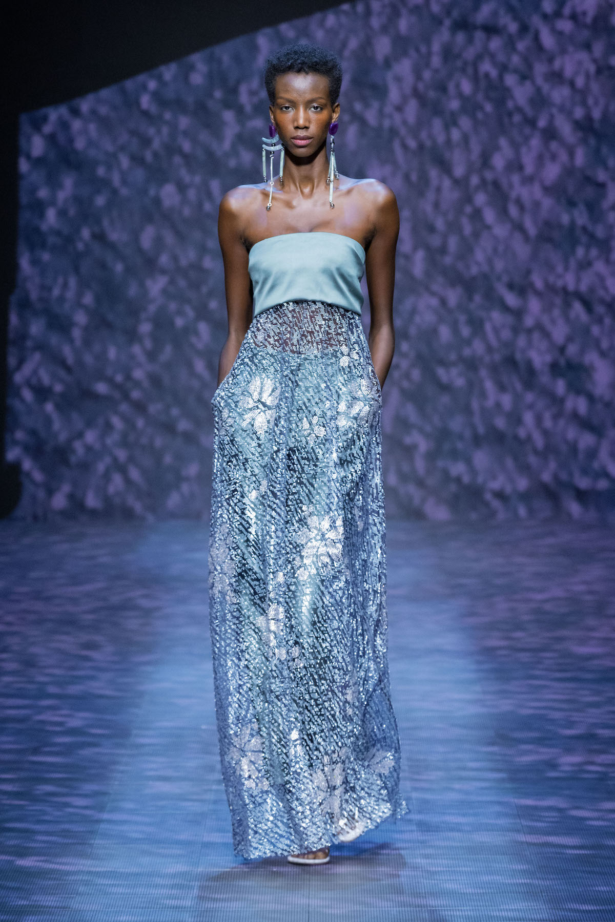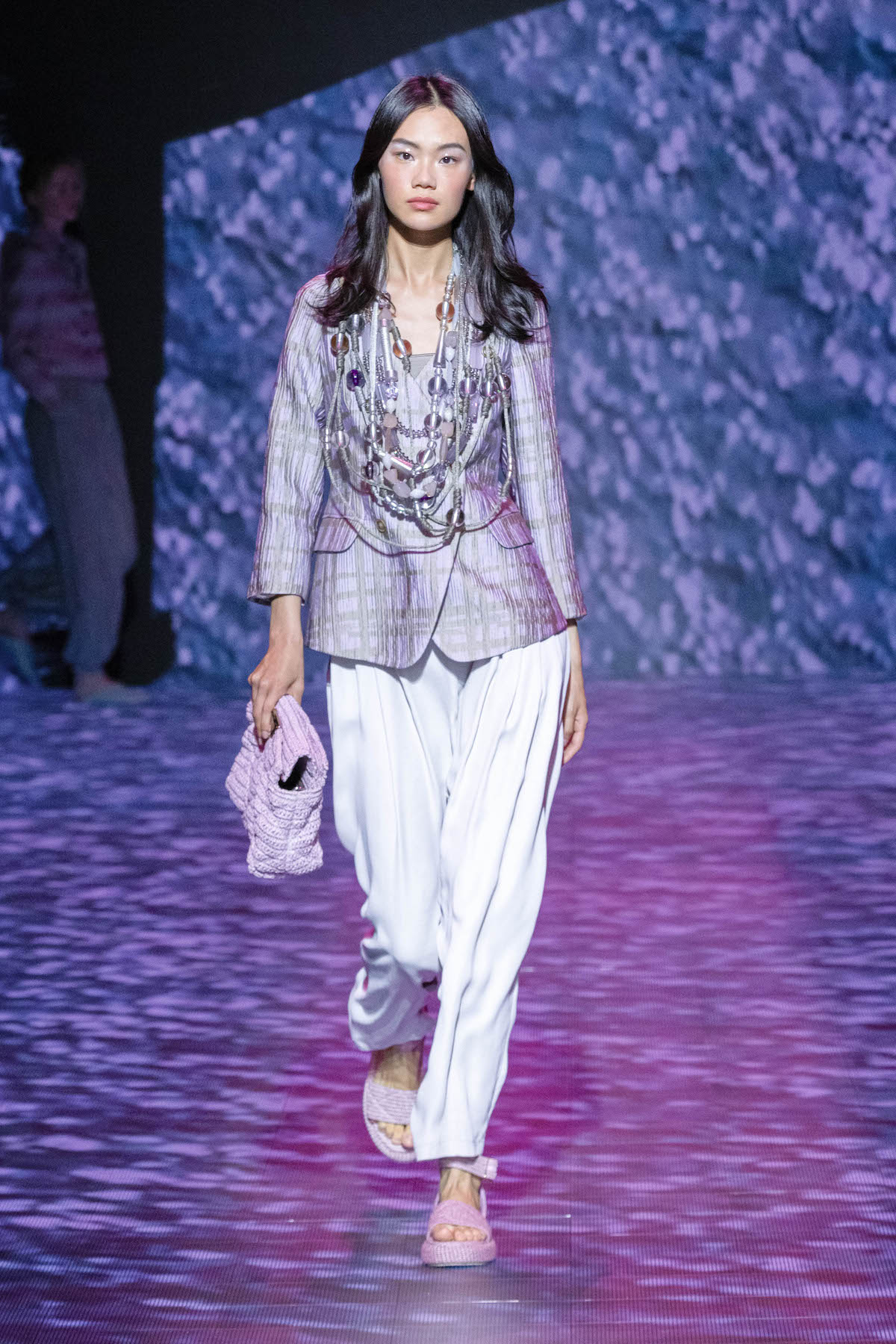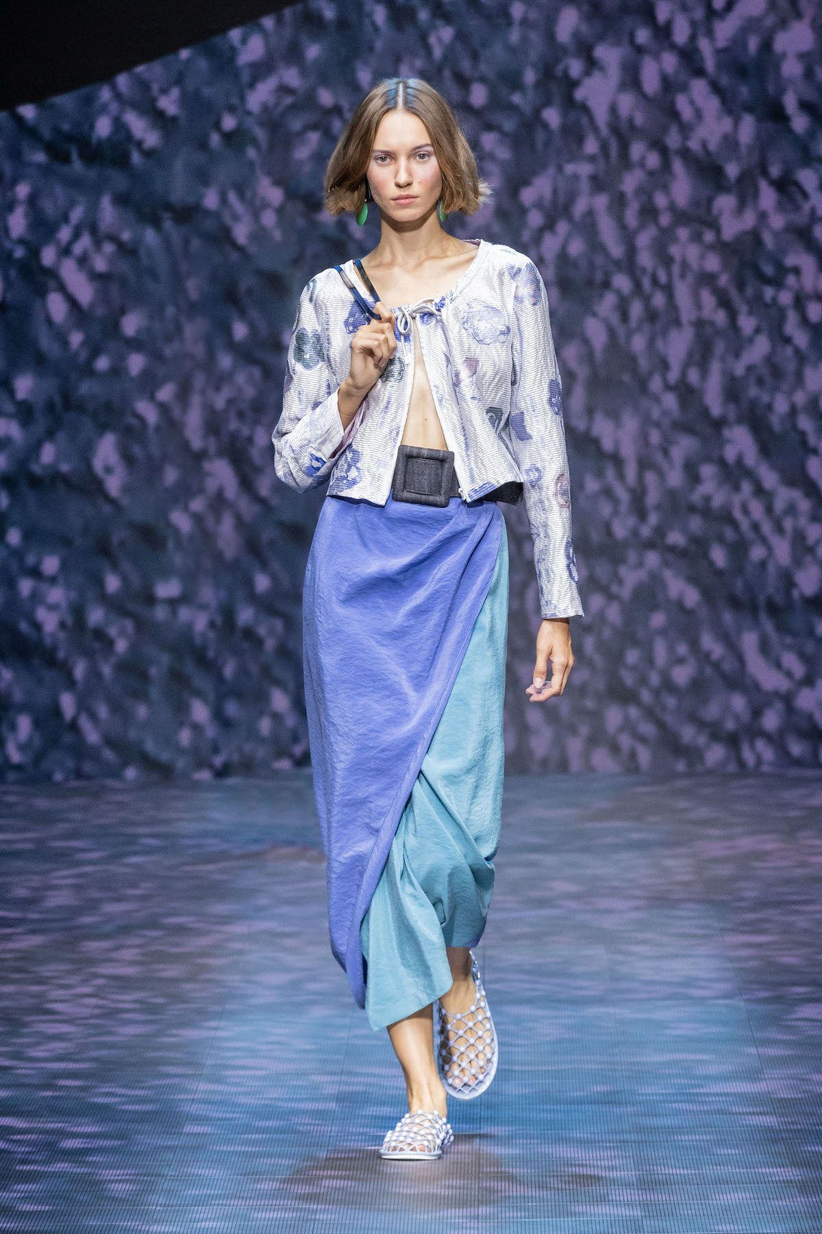 The Emporio Armani woman lives a life of ultimate luxury and this season, she’s back in the air, on the move. For spring/summer 23, sunlight danced on top of the ocean projection that rippled down the runway as the EA women came flowing freely in soft pastel shades of cool. The Armani woman was on cloud nine, zen and blissed out. The collection celebrated the lightness of being as the models glided in the finest subtly sparkling dresses that swished around their ankles, some with delicately embroidered flowers that made us think of Monet’s garden.