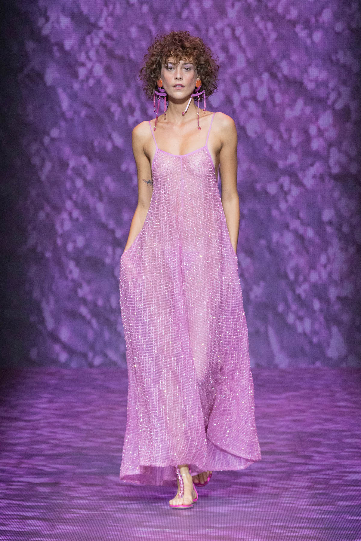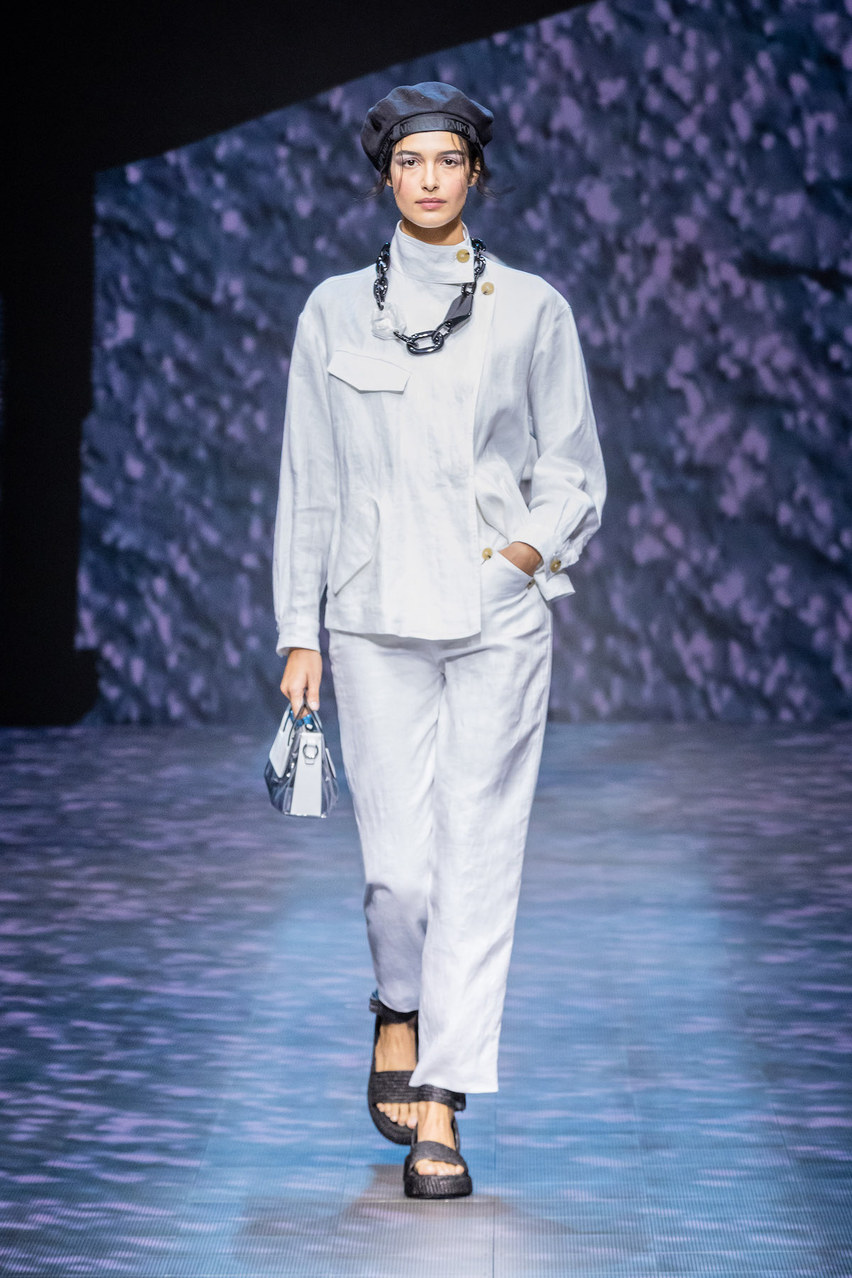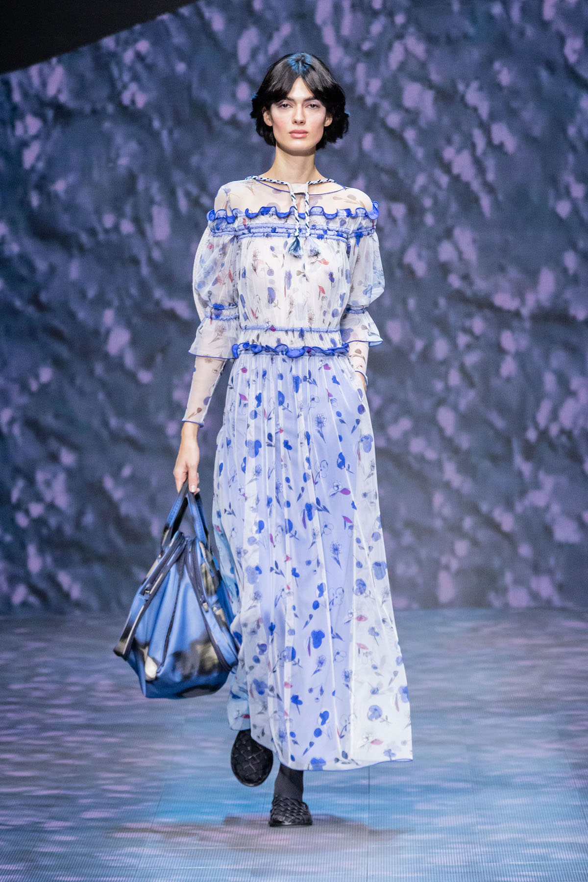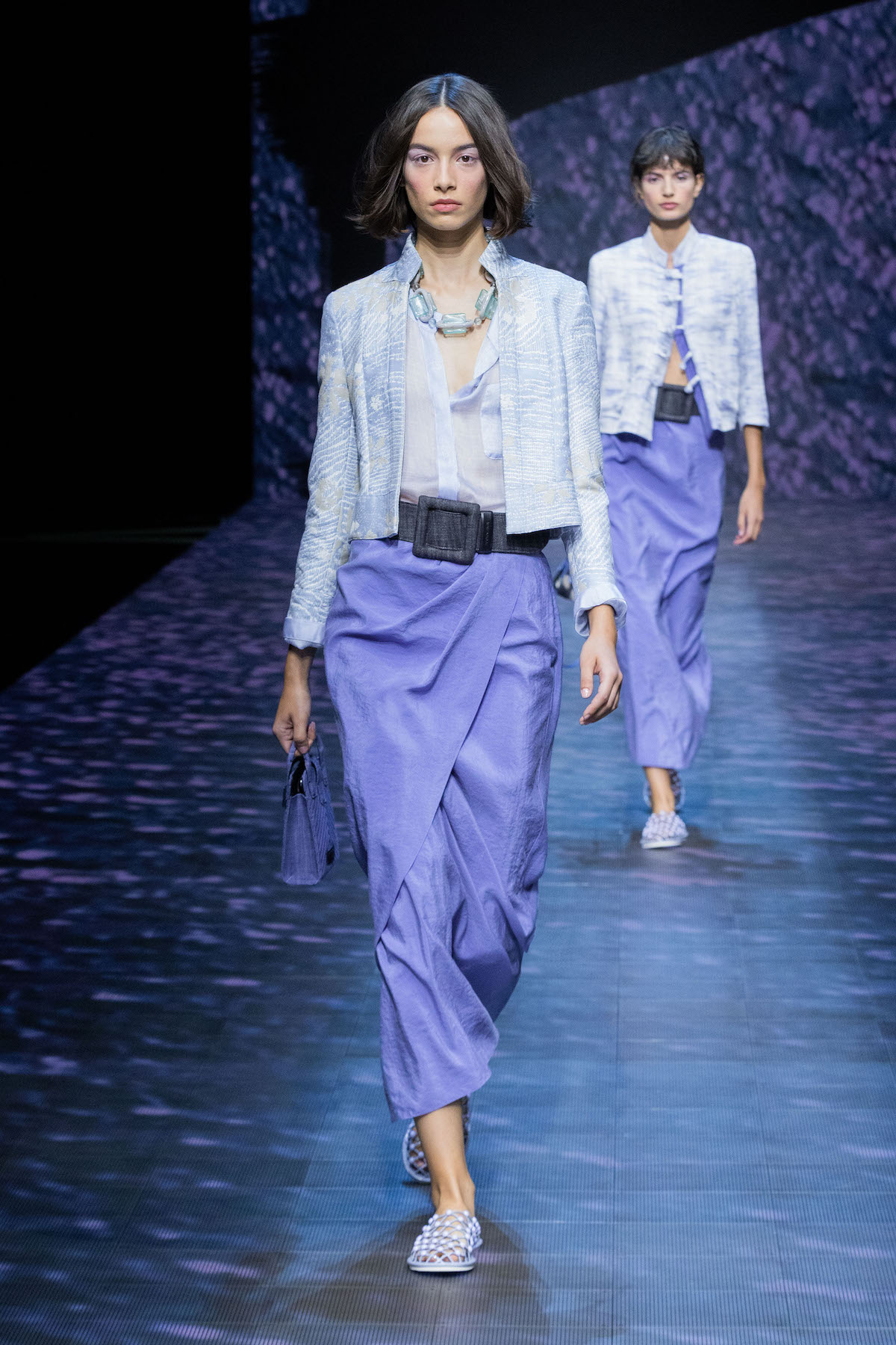 The Emporio Armani woman lives a life of ultimate luxury and this season, she’s back in the air, on the move. For spring/summer 23, sunlight danced on top of the ocean projection that rippled down the runway as the EA women came flowing freely in soft pastel shades of cool. The Armani woman was on cloud nine, zen and blissed out. The collection celebrated the lightness of being as the models glided in the finest subtly sparkling dresses that swished around their ankles, some with delicately embroidered flowers that made us think of Monet’s garden.