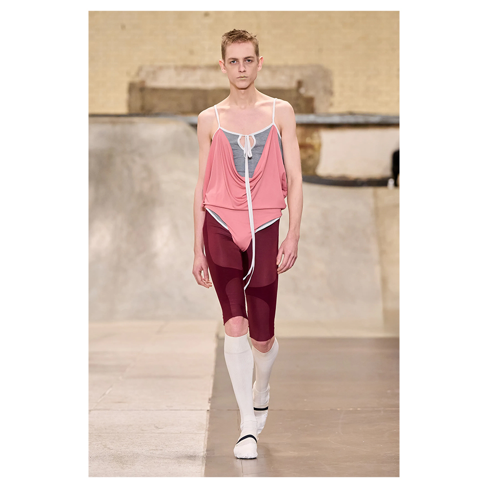 First up was Jacek Gleba, who continued to expand on his Vaslav Nijinsky-inspired body-con designs. His models came clacking in heeled ballet pumps, dressed in delicate leotards and pastel-hued jersey separates that clung close to the body. Gleba cleverly merges under garments with dance wear which he layers with wispy fabrics to create the sort of clothes that look really superb in movement.