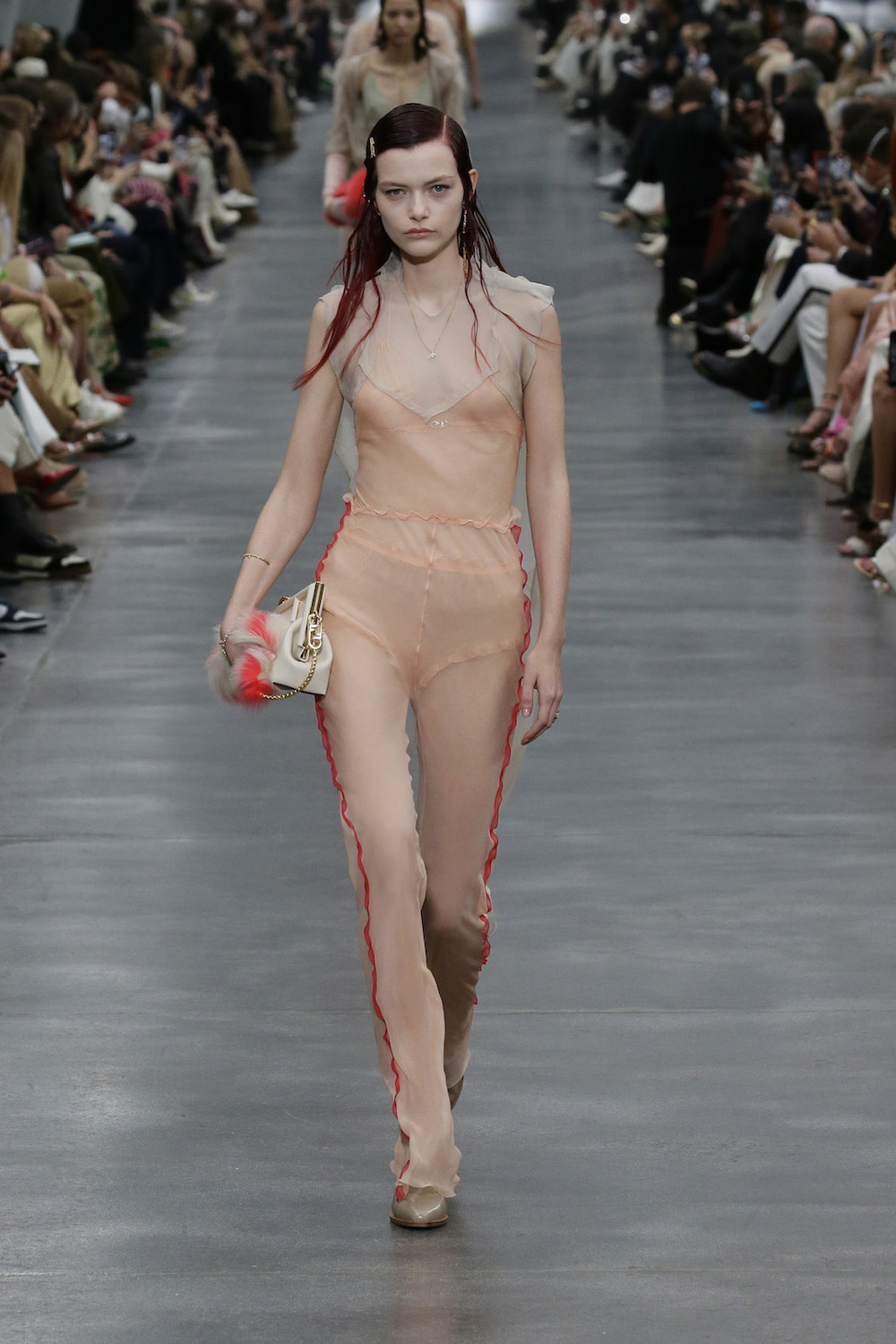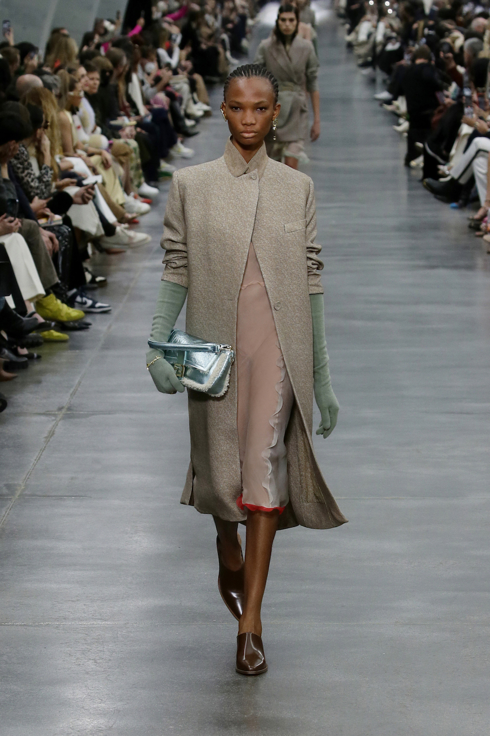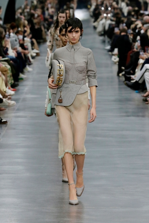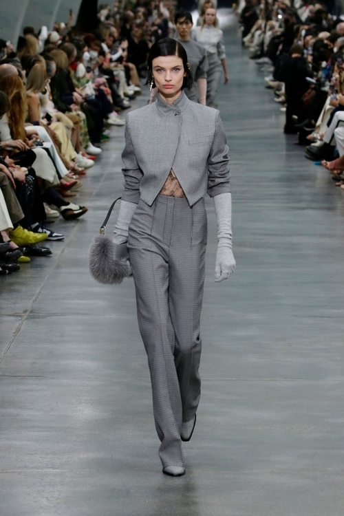 There really was something for every kind of Fendi fan. Party girls could embrace the delicious prettiness of his ultra-sheer fluttering dresses, those who prefer strong silhouettes could opt for nipped-in blazers or hyper feminine tailoring, with built in corsetry. The look is refined but wearable. Some pieces even had adaptable or detachable elements (blazers which transform into gilets). The bag game was strong with models toting 25th anniversary versions of the famous Baguette. The show notes talked of powerful women in beautiful clothes. There’s nothing more Fendi than that.