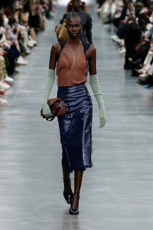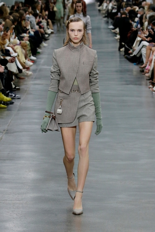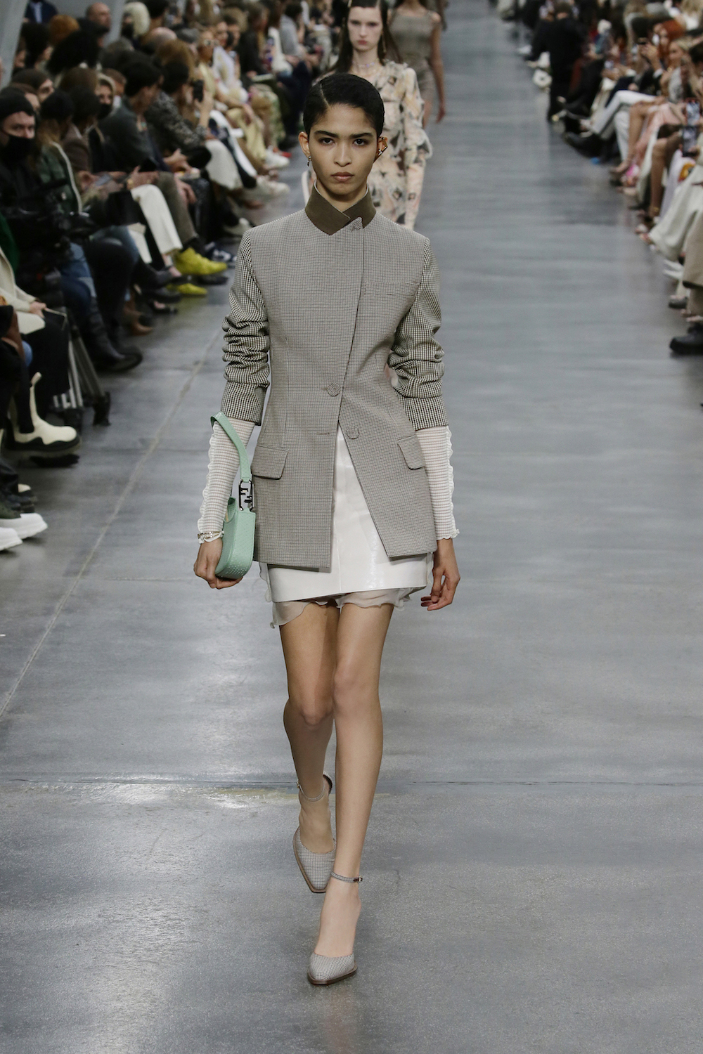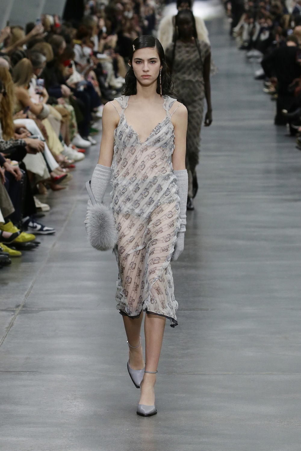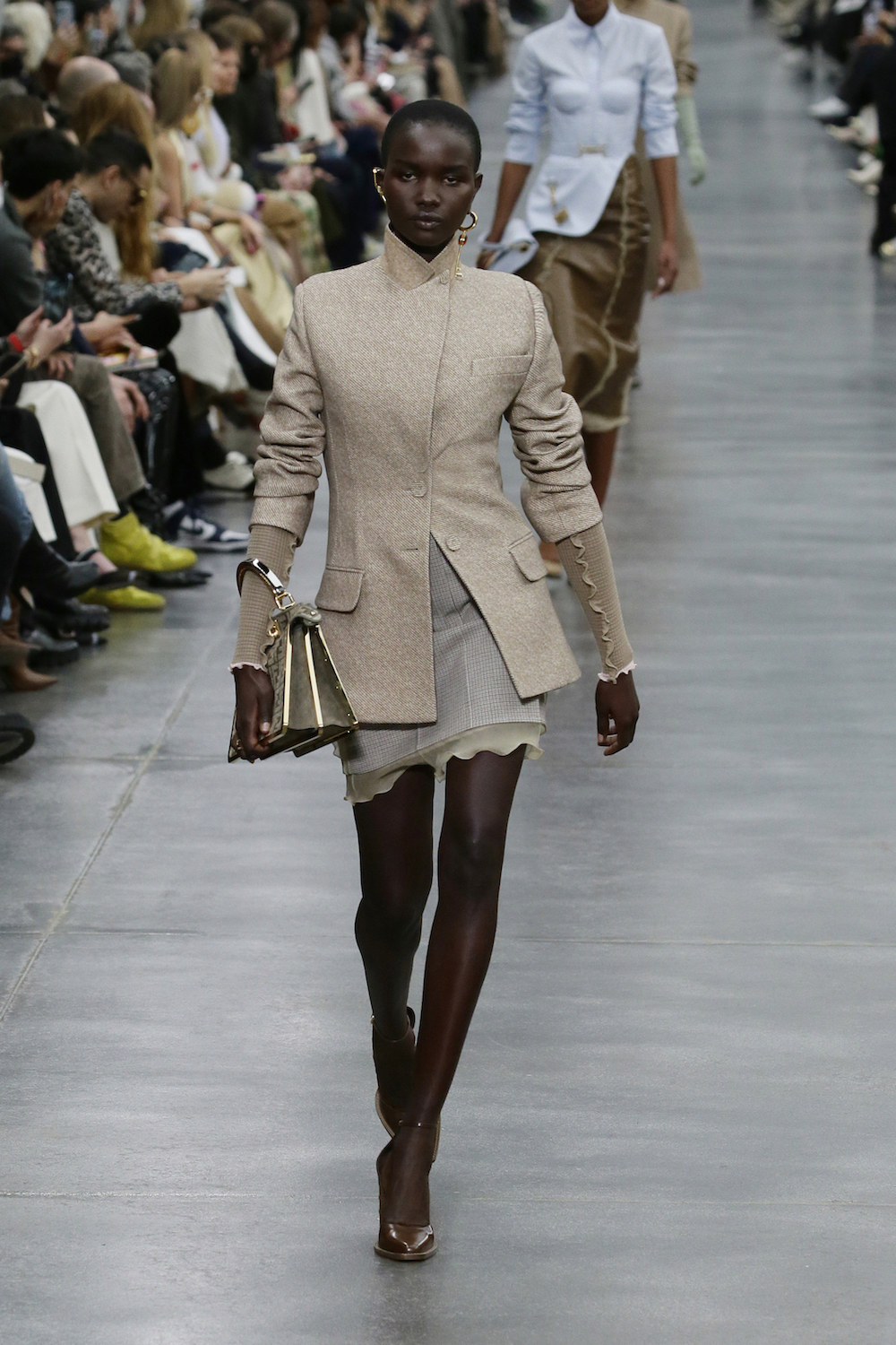 There really was something for every kind of Fendi fan. Party girls could embrace the delicious prettiness of his ultra-sheer fluttering dresses, those who prefer strong silhouettes could opt for nipped-in blazers or hyper feminine tailoring, with built in corsetry. The look is refined but wearable. Some pieces even had adaptable or detachable elements (blazers which transform into gilets). The bag game was strong with models toting 25th anniversary versions of the famous Baguette. The show notes talked of powerful women in beautiful clothes. There’s nothing more Fendi than that.
