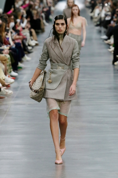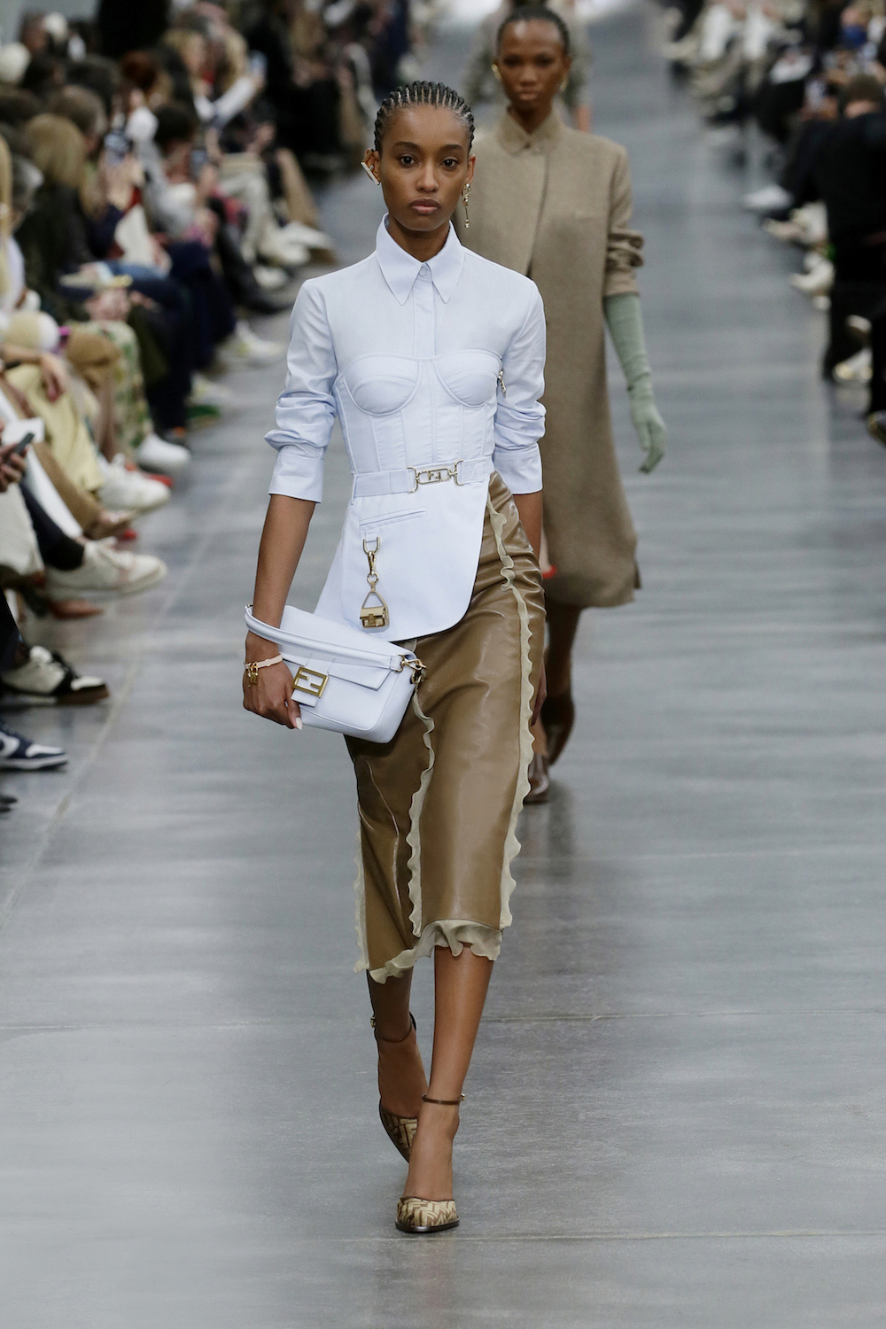 Wham! Milan Fashion Week started with a bang. Fendi shook the cobwebs out of the fashion system, with an energised and intense collection that channeled our collective Y2K obsession with added big show bravura. The excitement began before a model had even set foot on the catwalk. A fascinating people watching show was unfolding as the Fendi clients arrived, dressed to the nines in Kim Jones’ luxurious, polished designs. Their commitment to the Fendi look was total. They wore precision tailored white coats, Antonio Lopez dresses, the Fendi x Skims collaboration and even floor length gowns. All proudly toted their prized First Bags and teetered on F shaped heels.