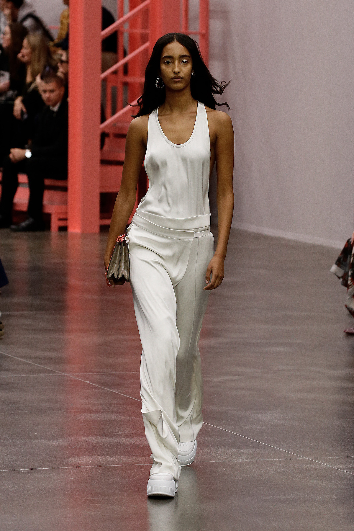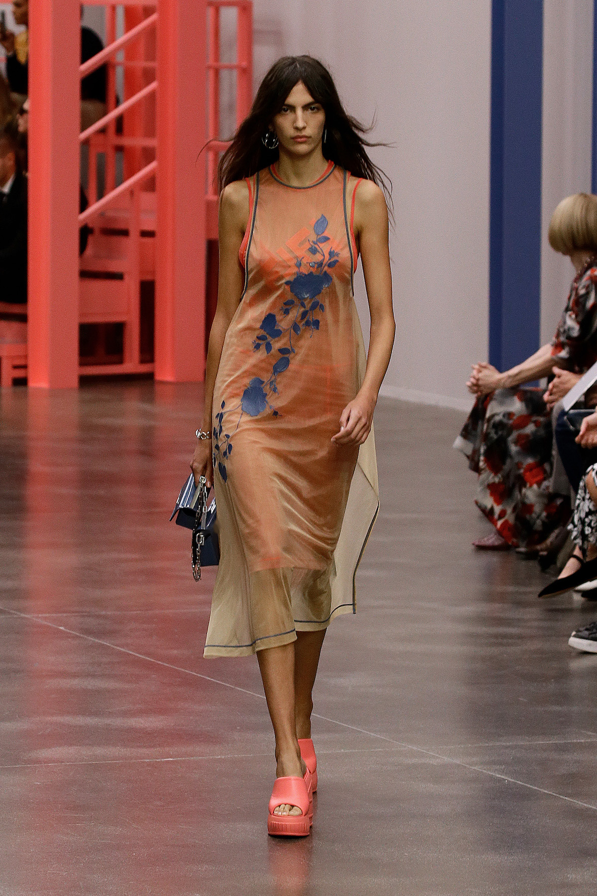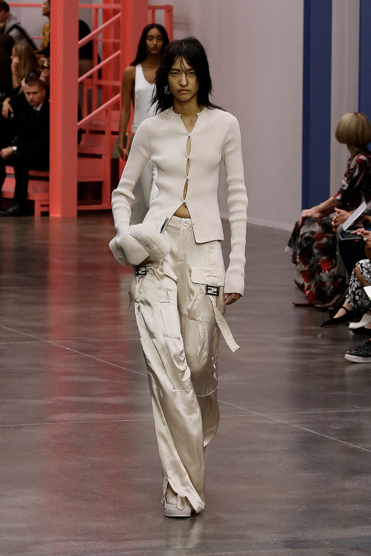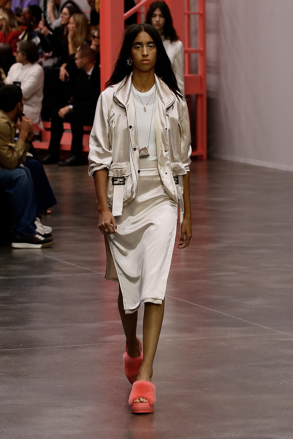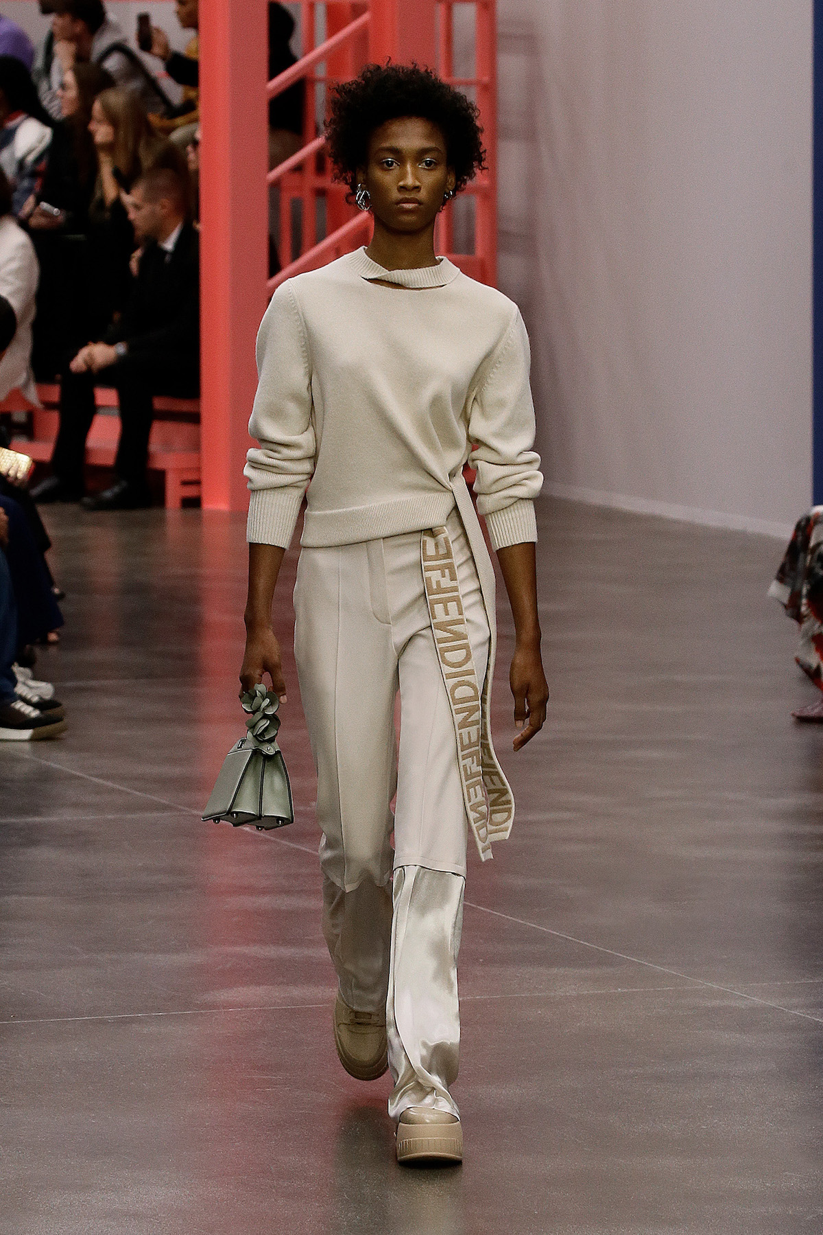 Jones had gone deep into the archives looking at Karl Lagerfeld’s work at the house from 1996 to 2002, focusing on the turn of the millennium: “It’s about continuity,” said Jones. “I am interested in looking at things that Karl has done, and seeing how we can develop them – both visually and technically.” The floral print was picked from the archive, and a logo first introduced in 2000 has been reworked by Jones into a mirrored FENDI printed logo. “What is particularly interesting to me about Fendi is exploring the notion of functional utility alongside femininity – because the Fendi women are strong women with full, busy lives.” Fendi facts.