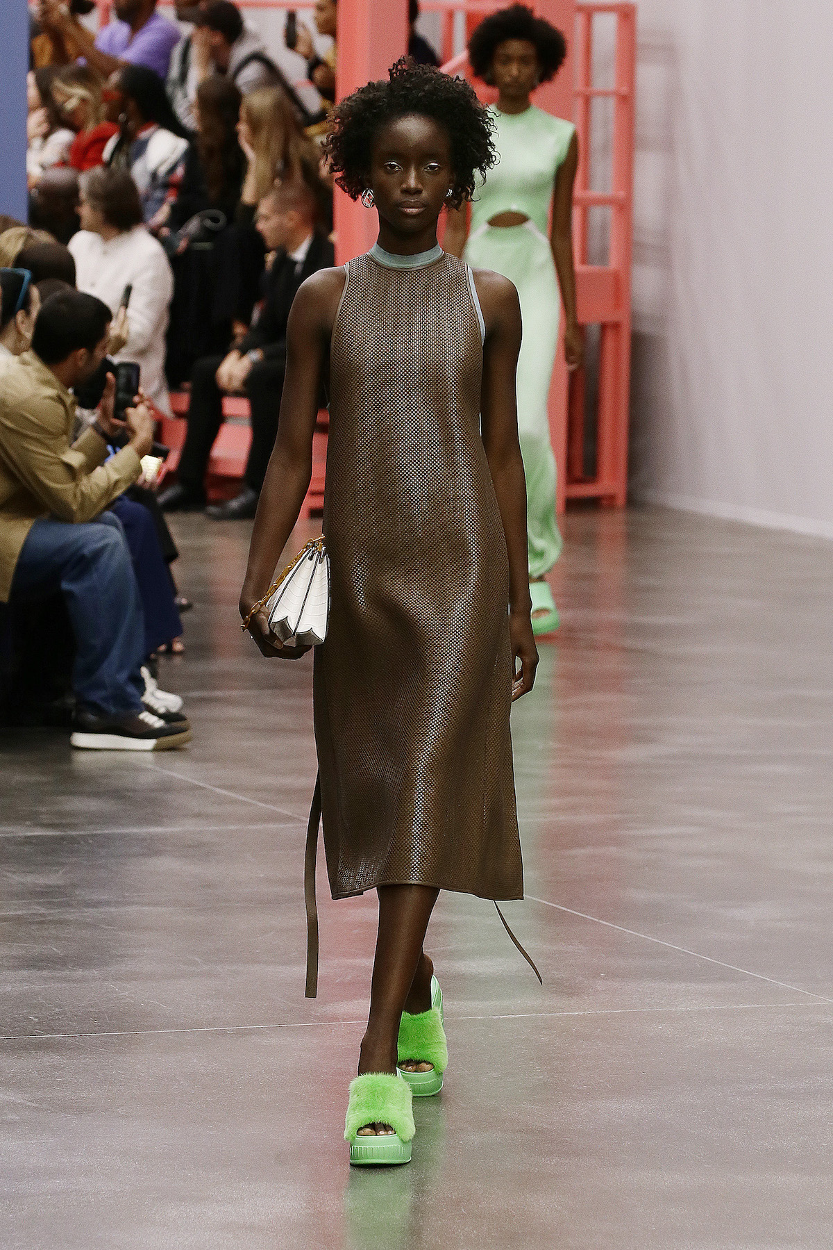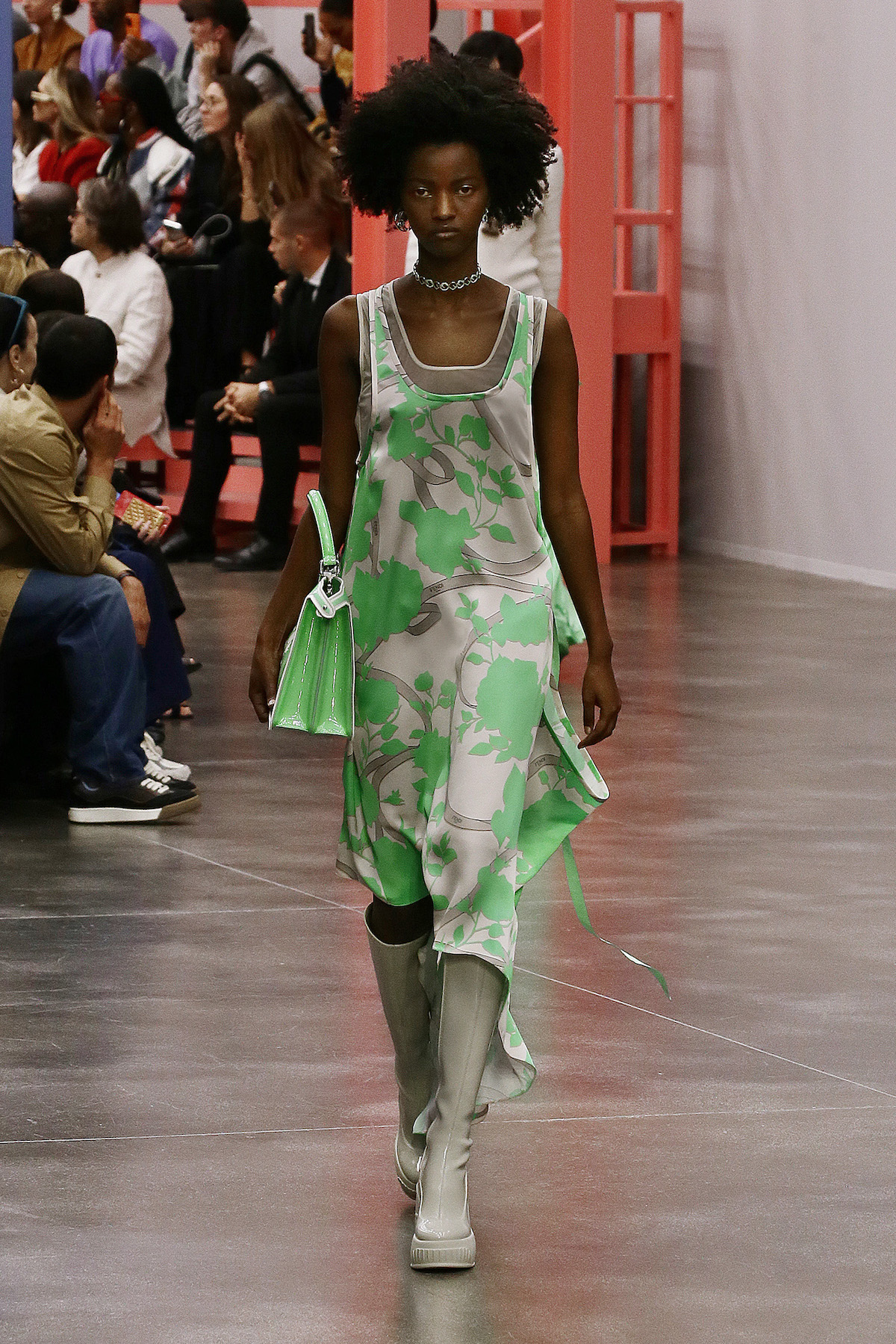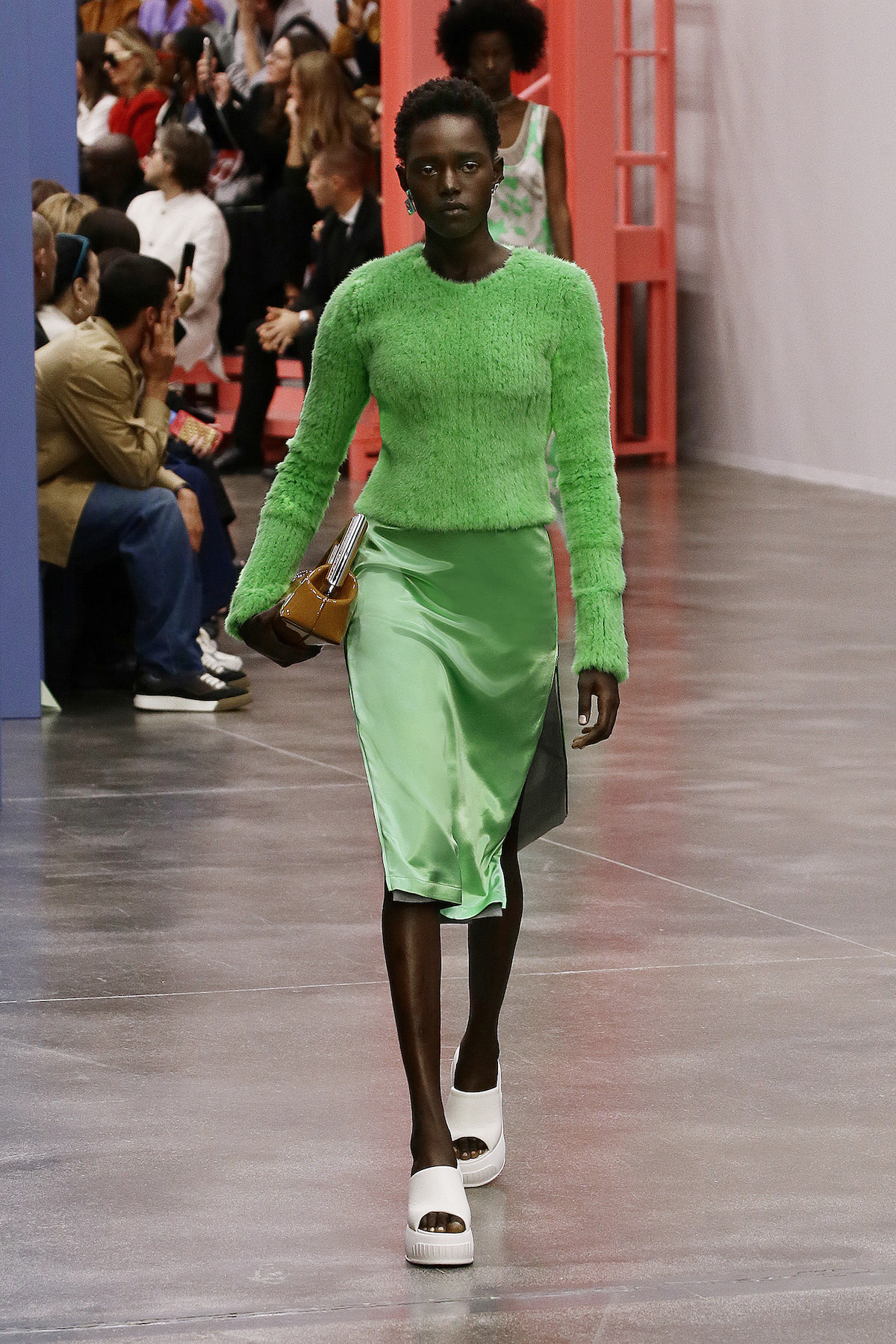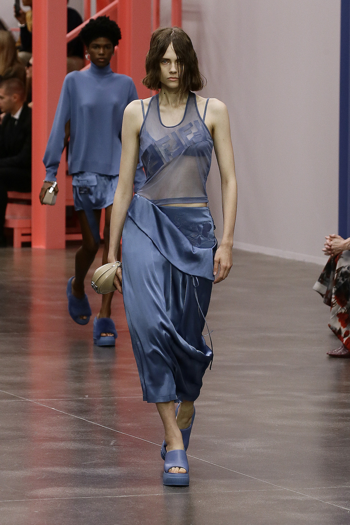 F is for fun, fresh, fluorescent, Fendi. This season we’re strutting in the star of Kim Jones’ SS23 show: the super duper Y2K rubber platform heels stamped with the inverted Fendi First F. The Fendi girls slinked by in neon green sleek satin with those slouchy Baguette pockets we saw last week in New York, mesh tank tops embroidered with flowers and holiday mode workwear in dove grey tailored light shirts and jackets. The primary colours this season were sherbet green, a cornflower blue and a juicy pink that came through on the new Fendi First Date bag, complete with first date necessity must - a secret interior mirror. The F sliced bags in half to unveil their mechanisms, cutting through the body of the bag to create a handle. Ruthless.