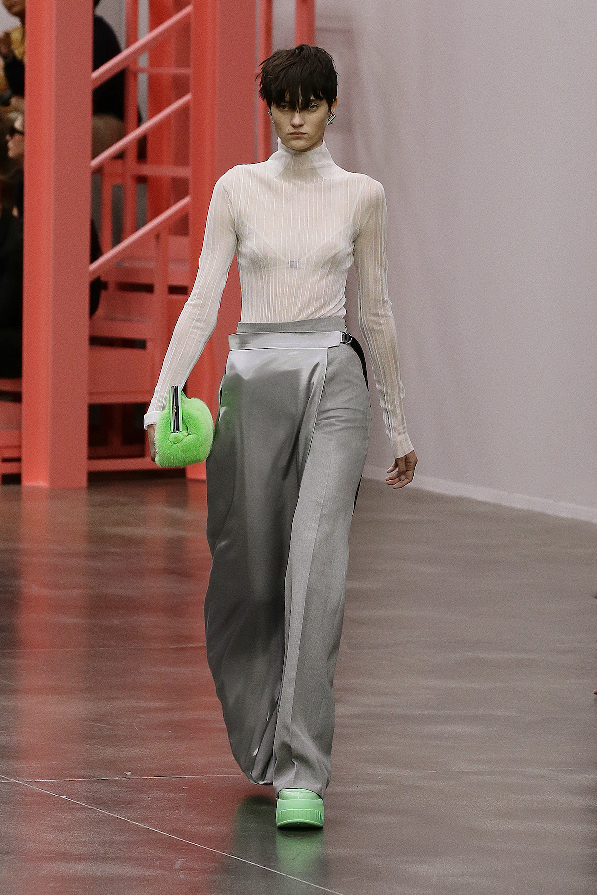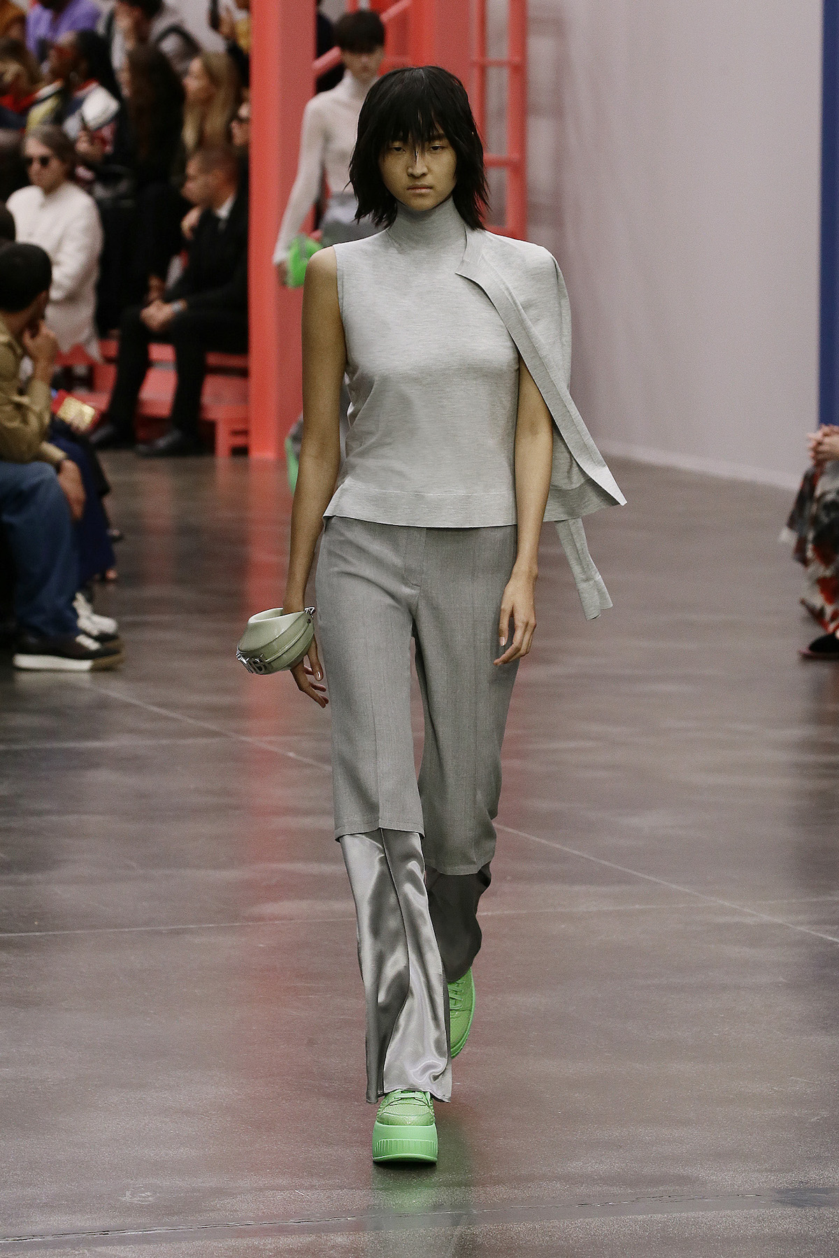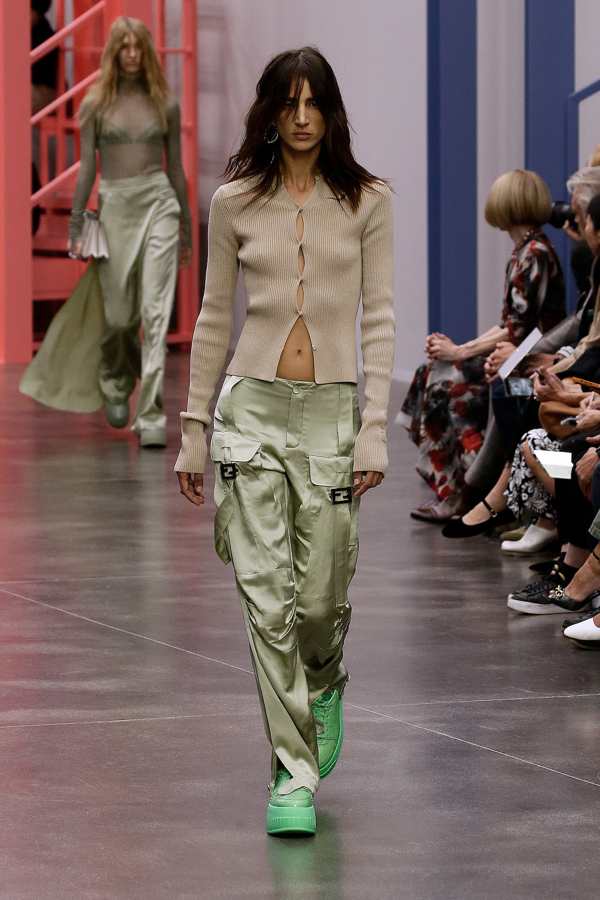 F is for fun, fresh, fluorescent, Fendi. This season we’re strutting in the star of Kim Jones’ SS23 show: the super duper Y2K rubber platform heels stamped with the inverted Fendi First F. The Fendi girls slinked by in neon green sleek satin with those slouchy Baguette pockets we saw last week in New York, mesh tank tops embroidered with flowers and holiday mode workwear in dove grey tailored light shirts and jackets. The primary colours this season were sherbet green, a cornflower blue and a juicy pink that came through on the new Fendi First Date bag, complete with first date necessity must - a secret interior mirror. The F sliced bags in half to unveil their mechanisms, cutting through the body of the bag to create a handle. Ruthless.