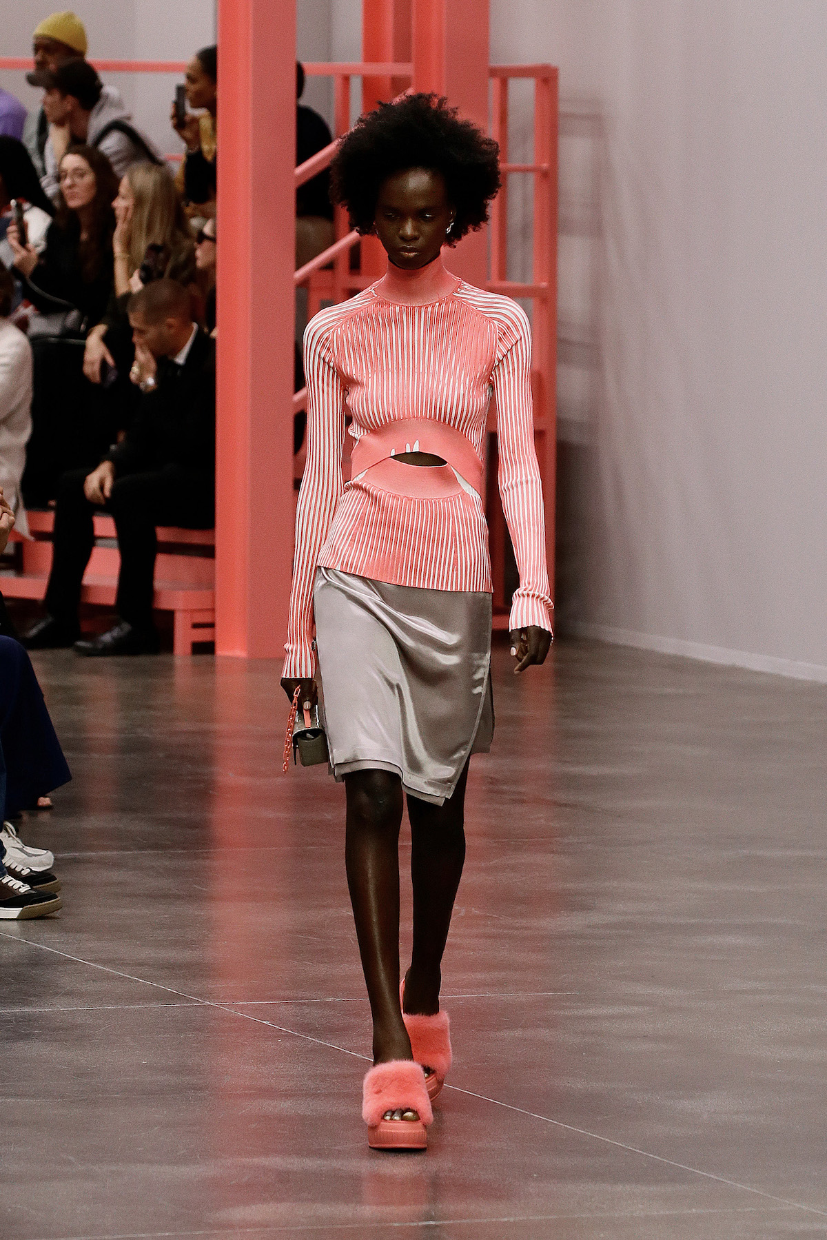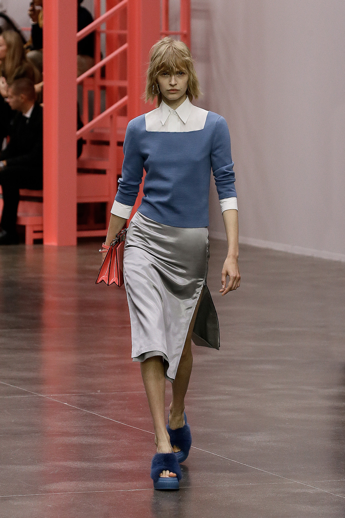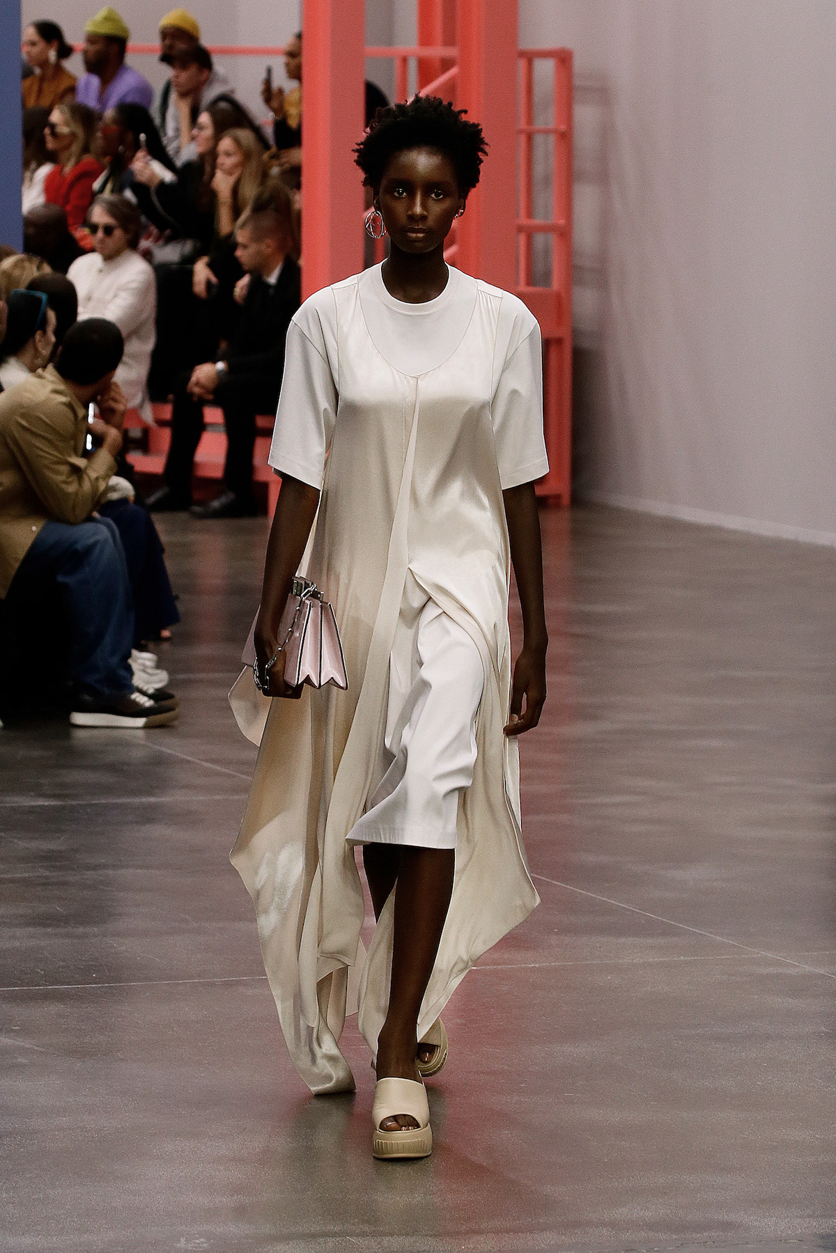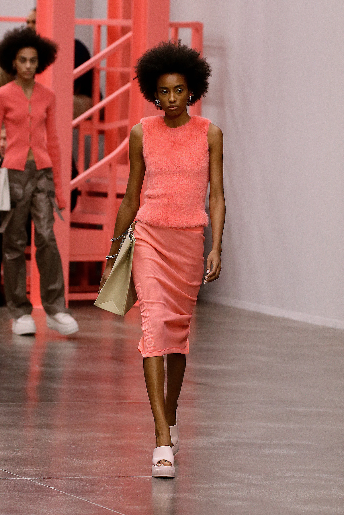 F is for fun, fresh, fluorescent, Fendi. This season we’re strutting in the star of Kim Jones’ SS23 show: the super duper Y2K rubber platform heels stamped with the inverted Fendi First F. The Fendi girls slinked by in neon green sleek satin with those slouchy Baguette pockets we saw last week in New York, mesh tank tops embroidered with flowers and holiday mode workwear in dove grey tailored light shirts and jackets. The primary colours this season were sherbet green, a cornflower blue and a juicy pink that came through on the new Fendi First Date bag, complete with first date necessity must - a secret interior mirror. The F sliced bags in half to unveil their mechanisms, cutting through the body of the bag to create a handle. Ruthless.
