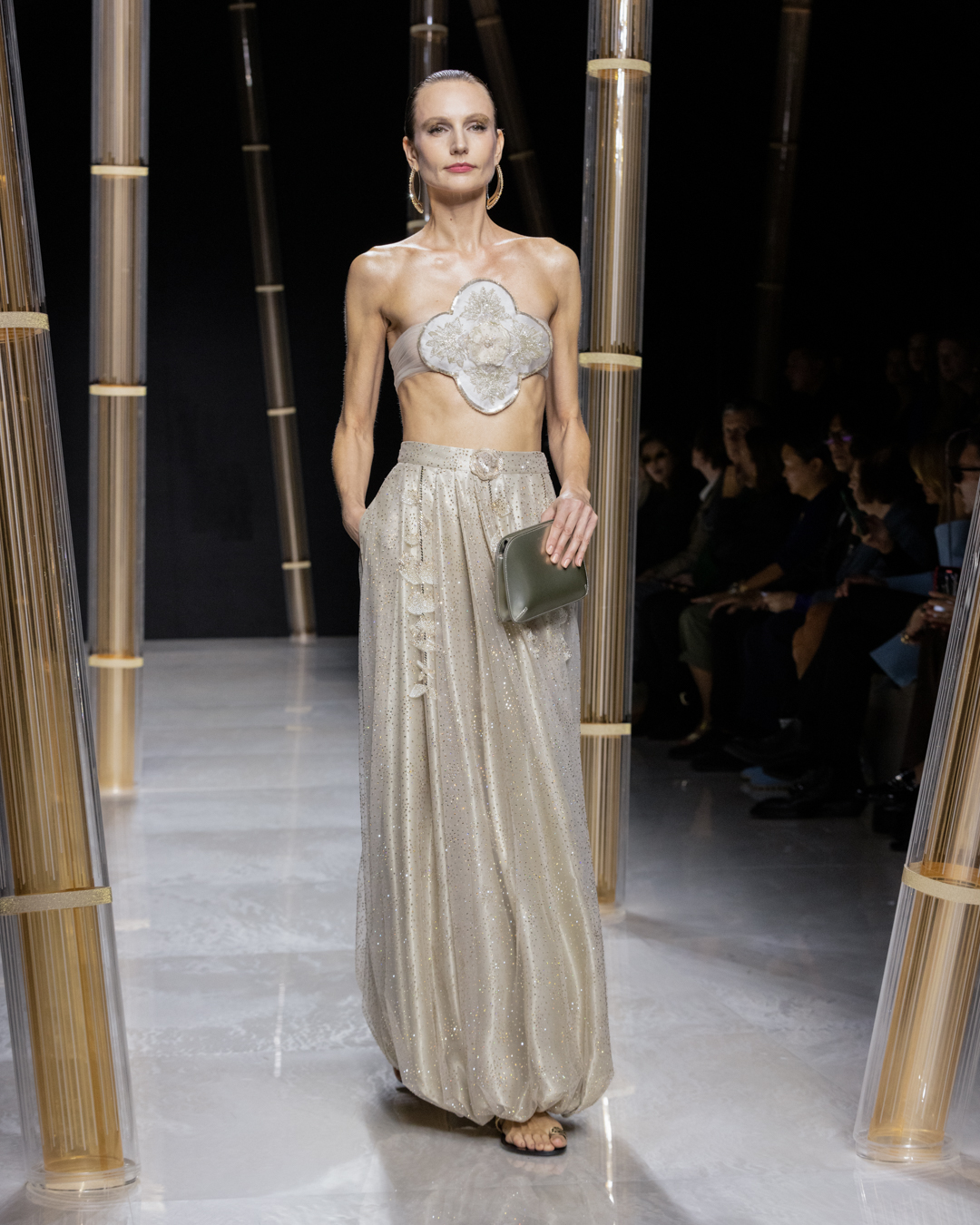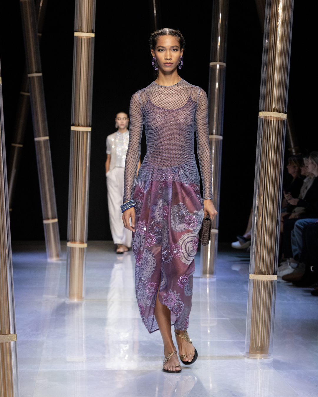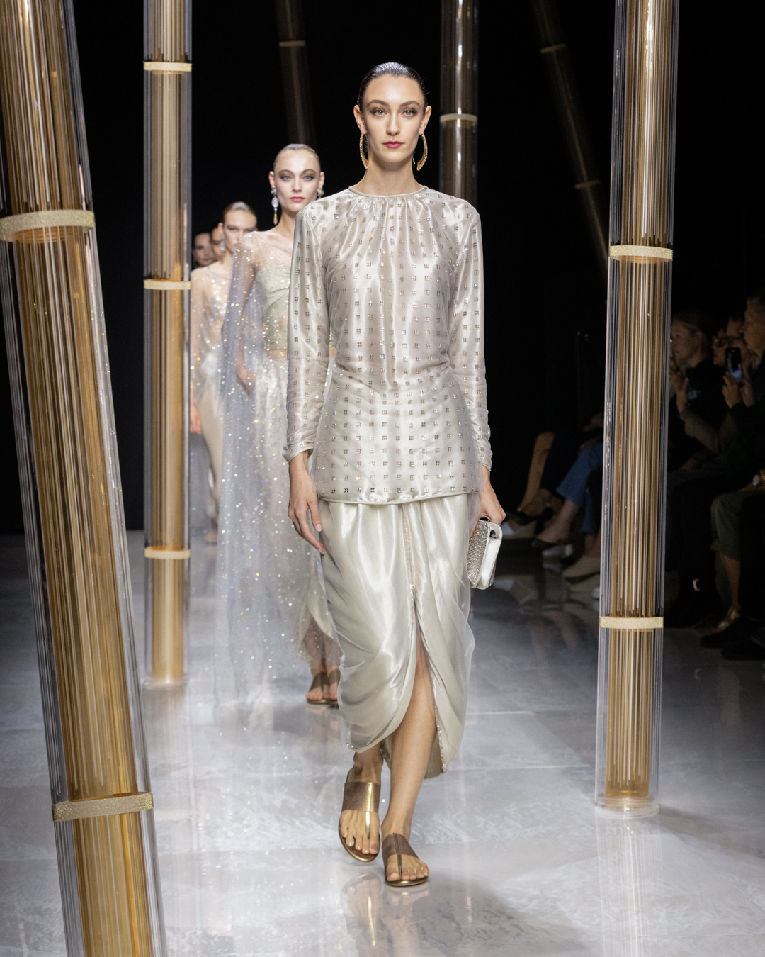 An ultimate liquid golden Giorgio Armani utopia was felt this season, as Mr Armani indulged in a mighty fine collection for SS23. Fil d’Or, or ’Golden Thread’ was a continuation from past collections, but lighter, as the women almost levitated through the underground room of Mr Armani’s private home in Milan. “The essence is a certain purity and the glimmer of gold,” said the House. “There is a very subtle shimmering of gold that crosses the whole collection, giving it a very charming and unique light. A light that calls to mind the sand of the desert.” Charmed we were. Cardigans were cropped with flashes of sparkles sprinkled, amethyst purple and ink blue dresses were so fine and sheer they appeared suspended in the air, and a sense of tranquility was felt on embroidered leaves and blossoming flowers. The show felt like a meditation to the audience (which included Lauren Hutton, Irina Shayk and Cate Blanchett) - and meditating in Armani silk satin is our kind of mindfulness. The final 8 women stopped in the tracks for the finale, each wearing variations of desert-sand inspired champagne gowns that glimmered slightly golden in the light, crystals and sequins twinkling. The show solidified the trends we’d been seeing in Milan: cropped jackets are cool again, sequins and sparkles are being seriously celebrated and embroidered flowers are blooming everywhere.