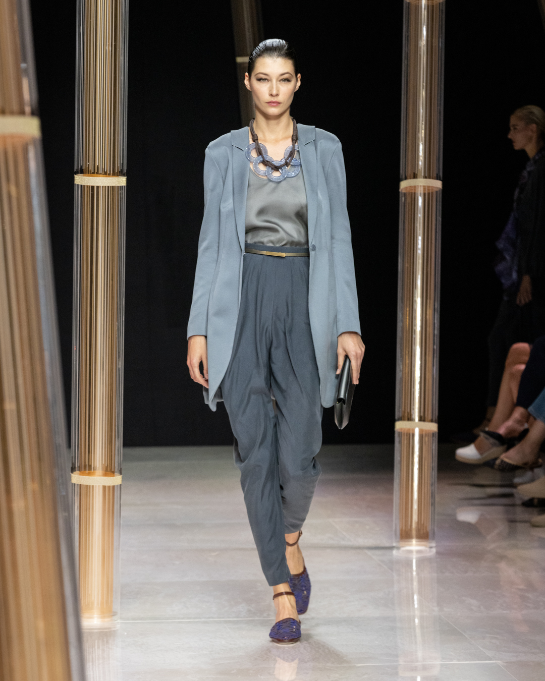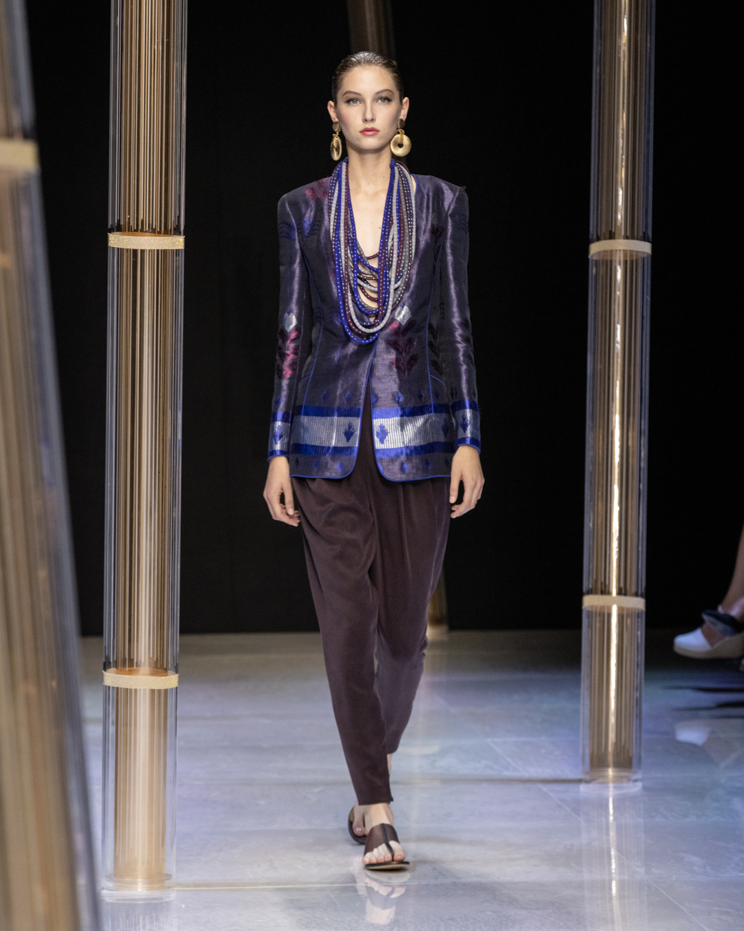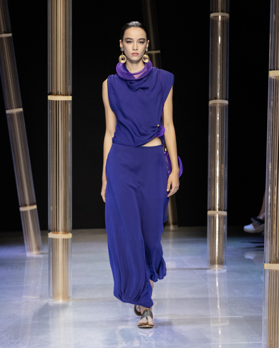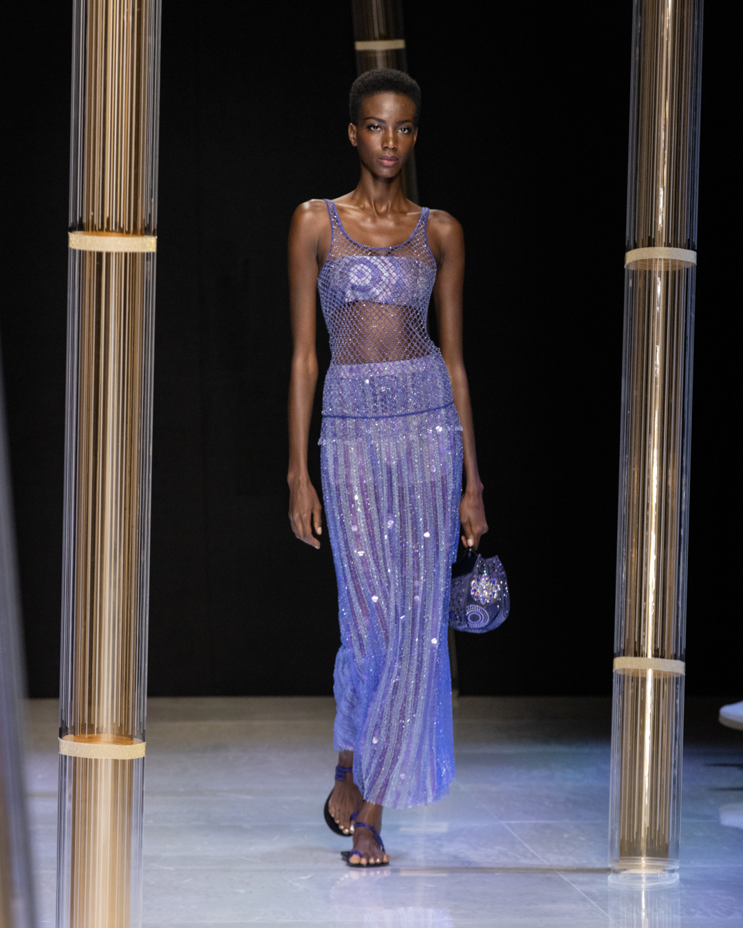 An ultimate liquid golden Giorgio Armani utopia was felt this season, as Mr Armani indulged in a mighty fine collection for SS23. Fil d’Or, or ’Golden Thread’ was a continuation from past collections, but lighter, as the women almost levitated through the underground room of Mr Armani’s private home in Milan. “The essence is a certain purity and the glimmer of gold,” said the House. “There is a very subtle shimmering of gold that crosses the whole collection, giving it a very charming and unique light. A light that calls to mind the sand of the desert.” Charmed we were. Cardigans were cropped with flashes of sparkles sprinkled, amethyst purple and ink blue dresses were so fine and sheer they appeared suspended in the air, and a sense of tranquility was felt on embroidered leaves and blossoming flowers. The show felt like a meditation to the audience (which included Lauren Hutton, Irina Shayk and Cate Blanchett) - and meditating in Armani silk satin is our kind of mindfulness. The final 8 women stopped in the tracks for the finale, each wearing variations of desert-sand inspired champagne gowns that glimmered slightly golden in the light, crystals and sequins twinkling. The show solidified the trends we’d been seeing in Milan: cropped jackets are cool again, sequins and sparkles are being seriously celebrated and embroidered flowers are blooming everywhere.