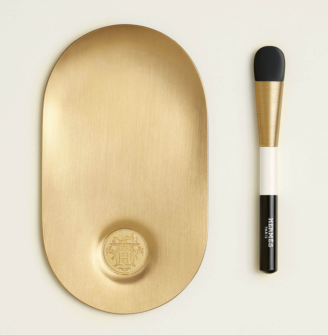 As for its distinctive half-frosted, half-clear glass bottle, Pyrpylis worked with Pierre Hardy, who is best known as the designer of fine jewellery and shoes at the house, as well as the genius behind Hermès Beauty’s packaging. With the intimacy of the ritual of applying foundation in mind, Pyrpylis created an accompanying stainless steel blending palette with a slight curve because many clients, particularly in Asia, don’t like to apply make-up with their fingers. The brush, in the shape of a horse’s hoof and made with synthetic bristles for ease of cleaning, was inspired by Hermès’ equestrian roots. “It goes all around, even in the small crevices of the face and under the eyes. You can go quite fast with it and do the whole face,” he says of this handsome and practical piece of kit.